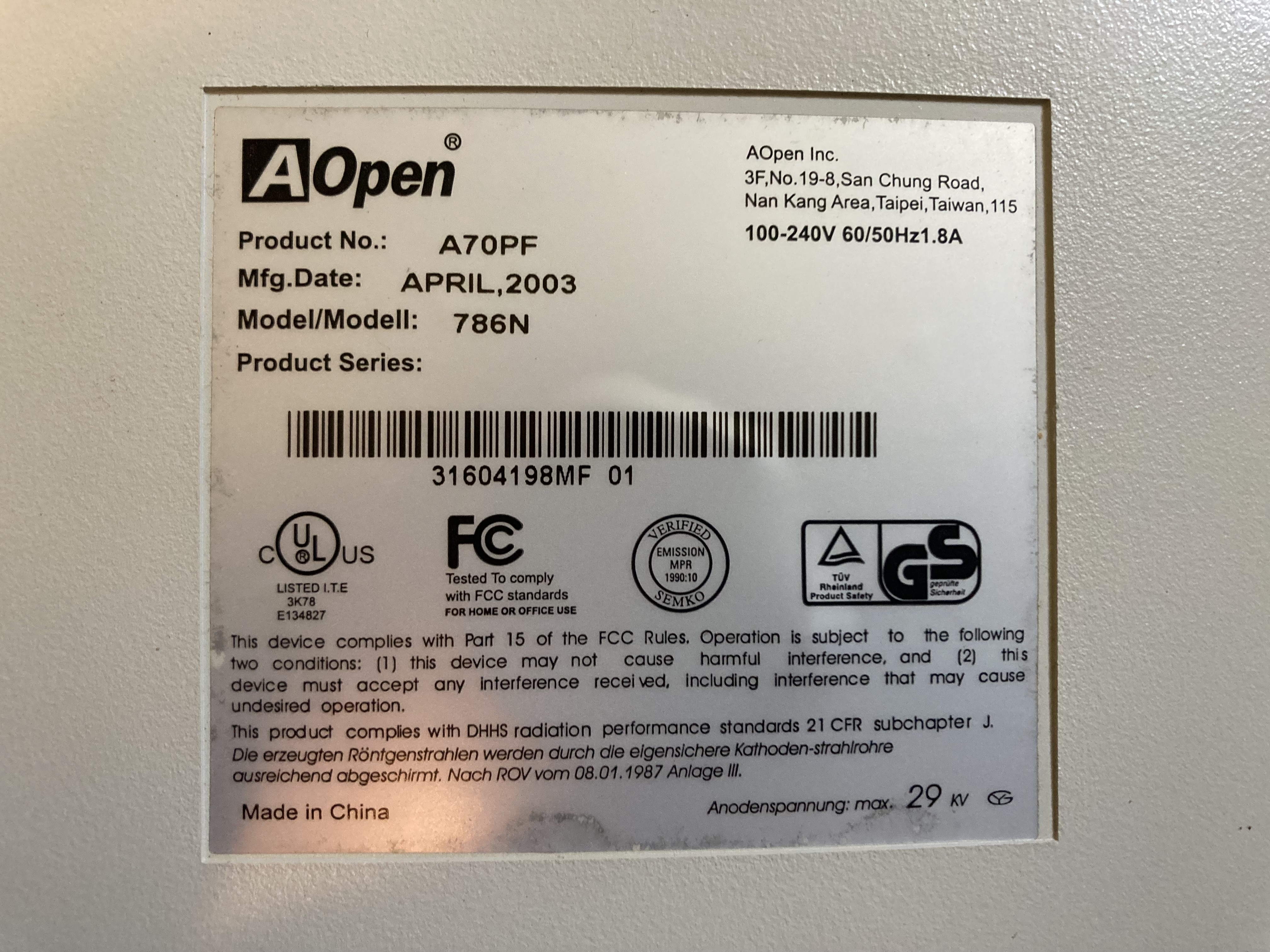17" (16" viewable) CRT monitor by AOpen. Made in China in 2003.