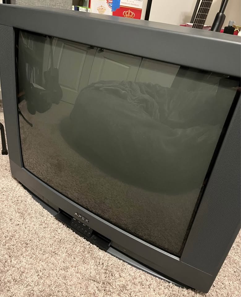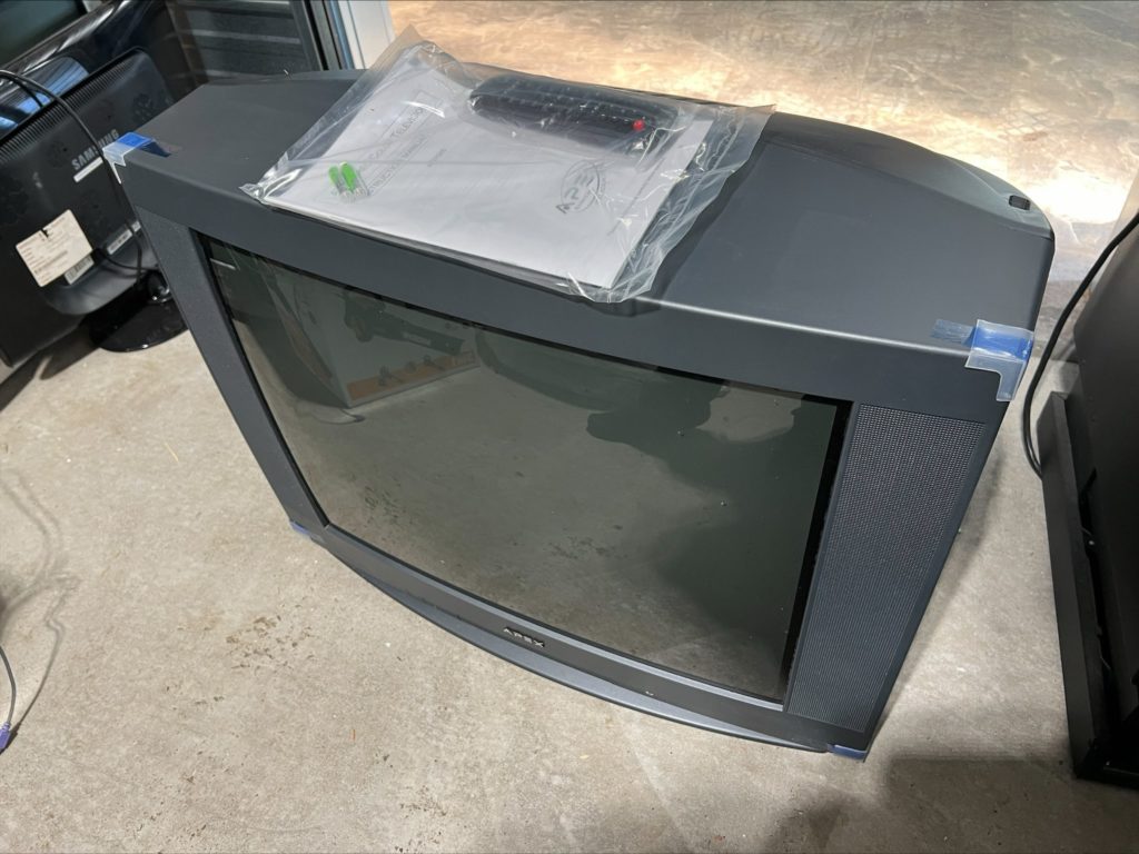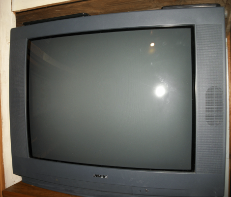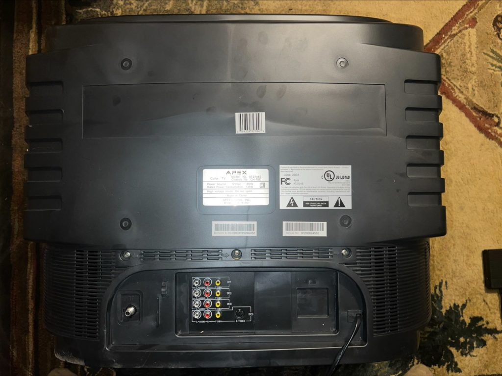 27" curved-screen TV by Apex, made by Changhong Electric in China in 2002. This model appears to be a dark gray variant of the AT2702S. It did not have a dedicated page on the official website. Has RF, composite, and s-video inputs with stereo sound.