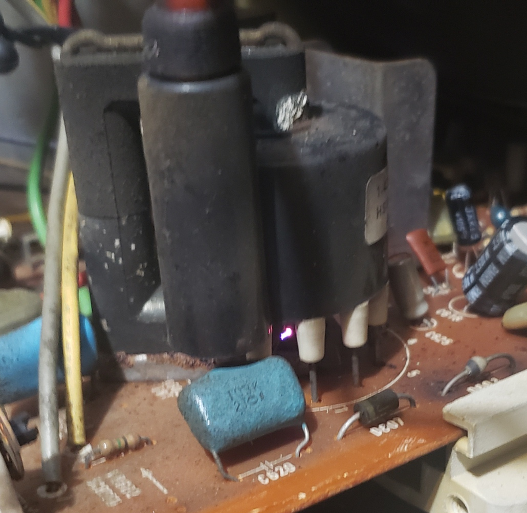 A 47uF 16V capacitor near the blue transformer was found to have gone open, C609. A copper wire on the underside of the flyback had corroded all the way through and was arcing, preventing the picture from showing. Bodged and insulated.