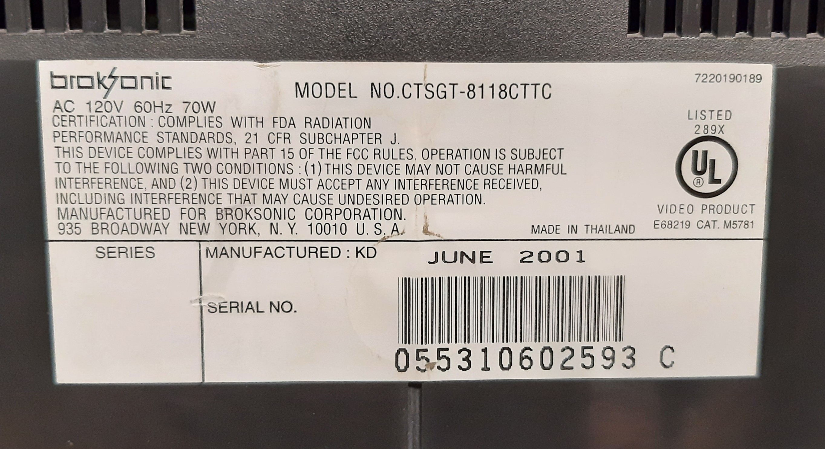 13" TV/VCR combo, manufactured by Orion. This TV was sold under several brand names including Toshiba, JVC, and Zenith (with minor stylistic changes).