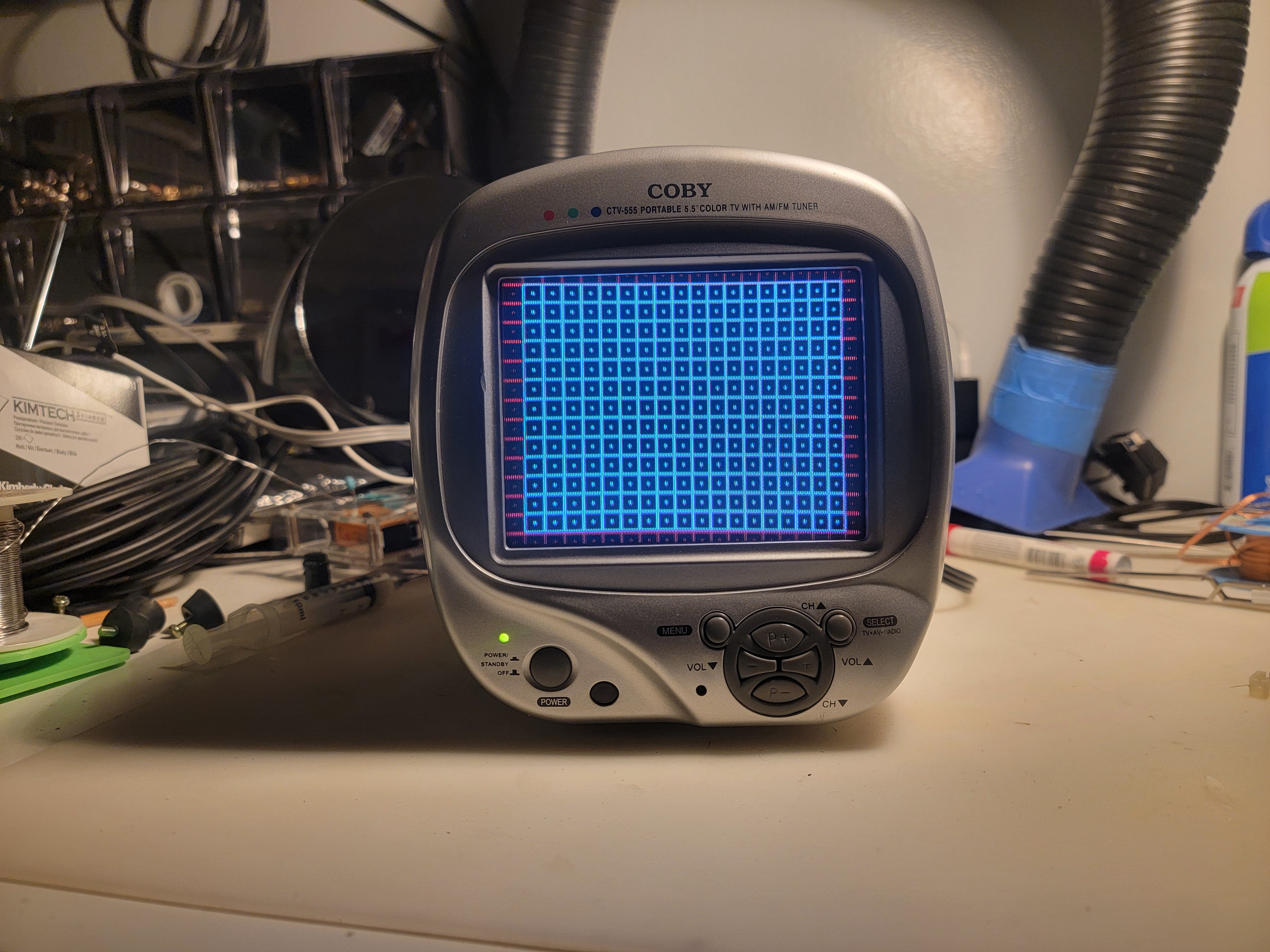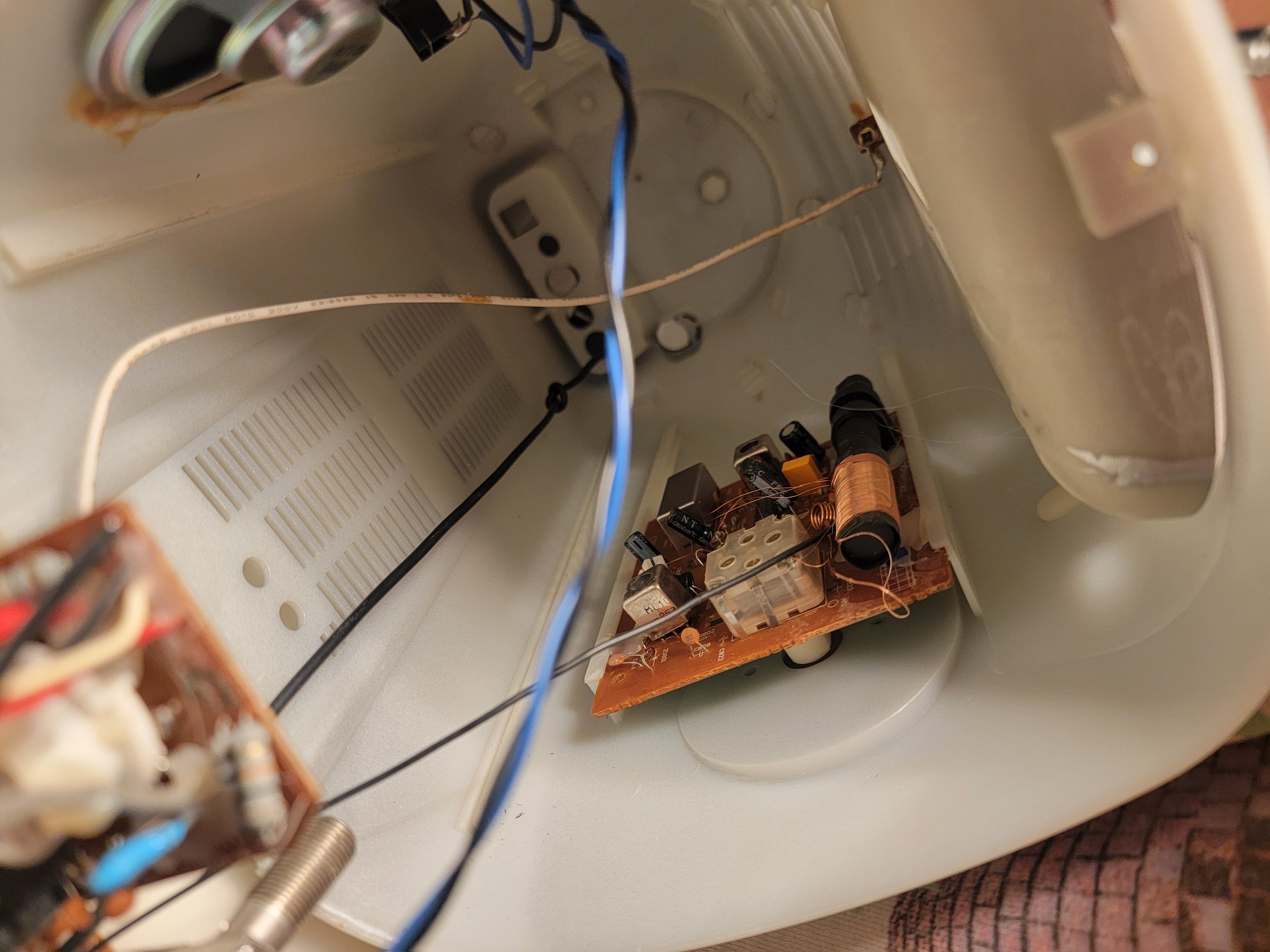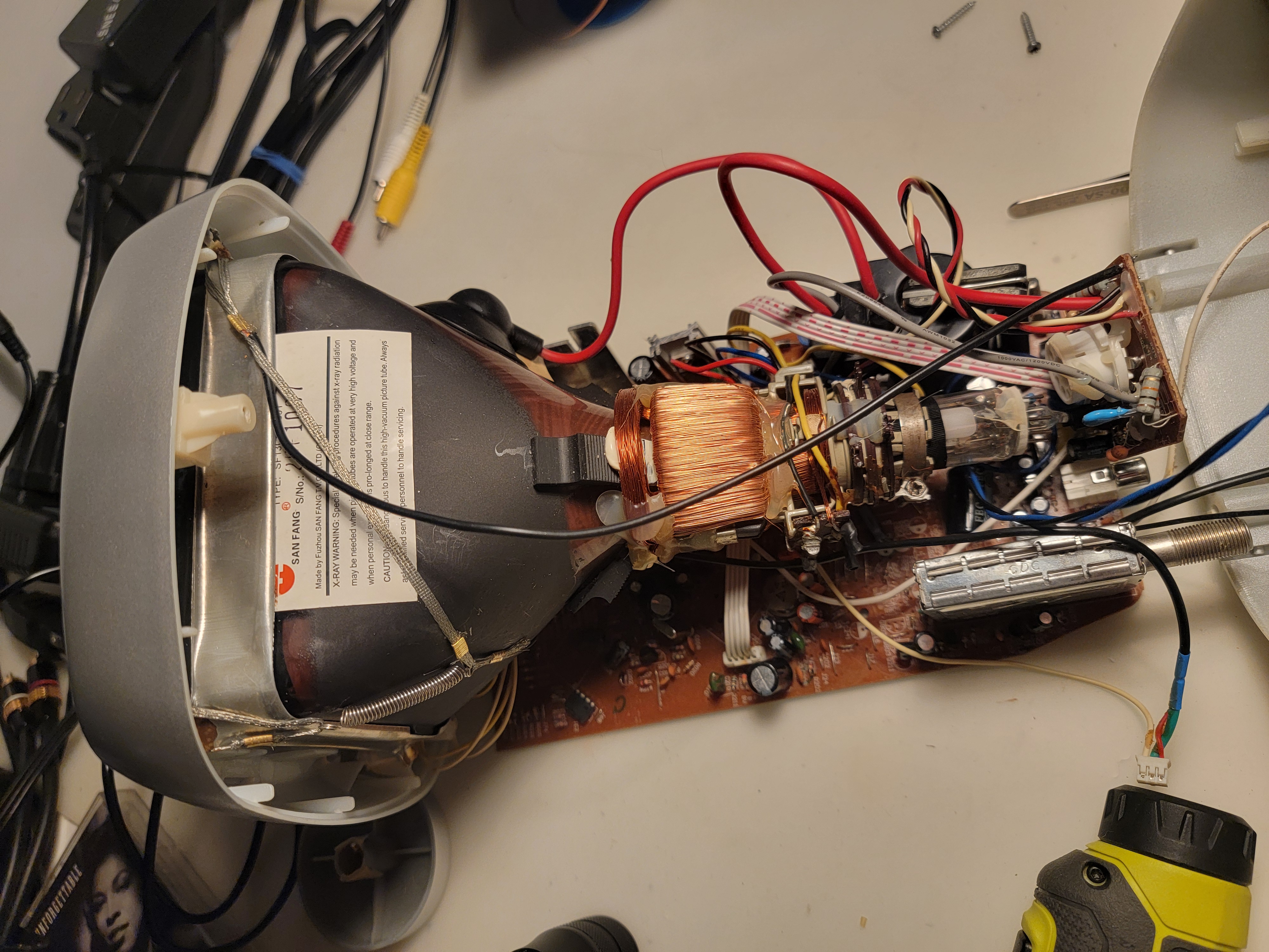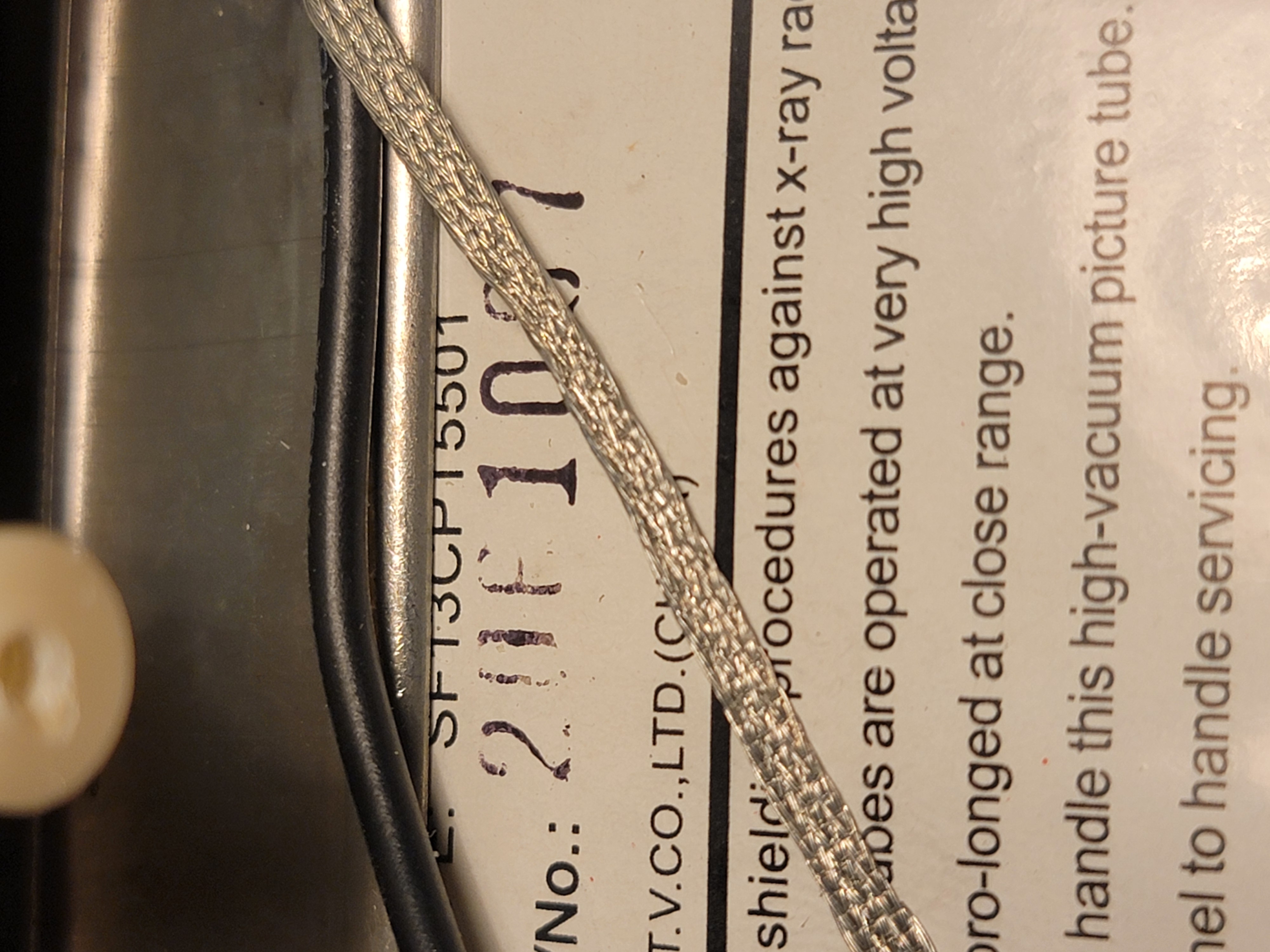 Budget model portable color TV made in China. Internally it is quite bare-bones, having only the bare minimum required to run a CRT. The wiring is all done by hand, and most things cannot be unplugged without desoldering.