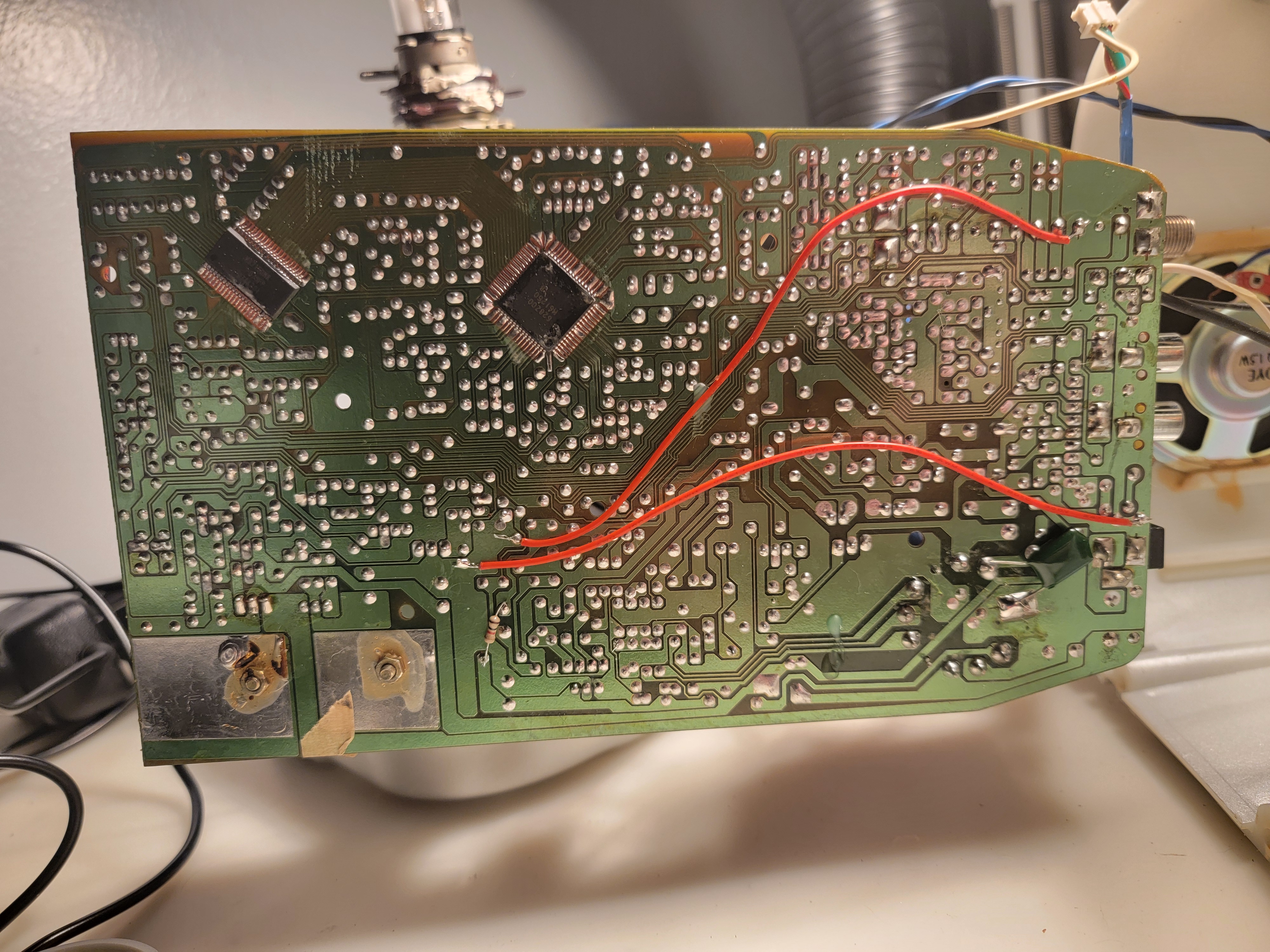 This is a bit difficult to work on because there are soldered wires connecting the board to the rear shell as well as the AM/FM board. You kinda just have to sprawl it out on a table and find a way you can work on it without disconnecting everything.