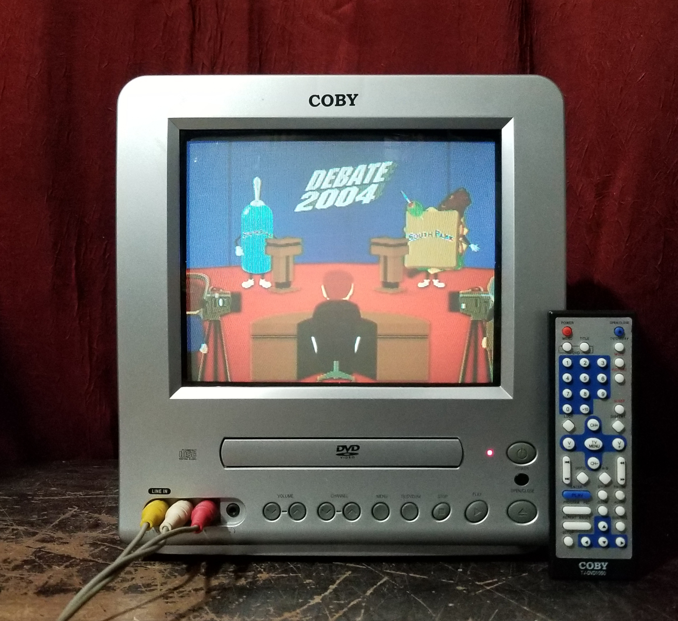 A great multi-tasker for a child's bedroom or a summer cabin, you can also take the 9-inch Coby TV-DVD1050 TV/DVD player combo unit in the car for long road trips thanks to the included DC vehicle (cigarette lighter) power adapter. The front-loading DVD player is compatible with standard DVD movie and CD music discs as well CD-R/RW discs with your own burned music mixes. It offers a sleep timer, built-in alarm clock, and closed captioning. It has a front composite A/V input for connecting a game console or VCR as well as an A/V output in the rear for connecting to a larger TV. Listen to TV programming via the built-in stereo speakers or privately using the 3.5mm headphone jack.