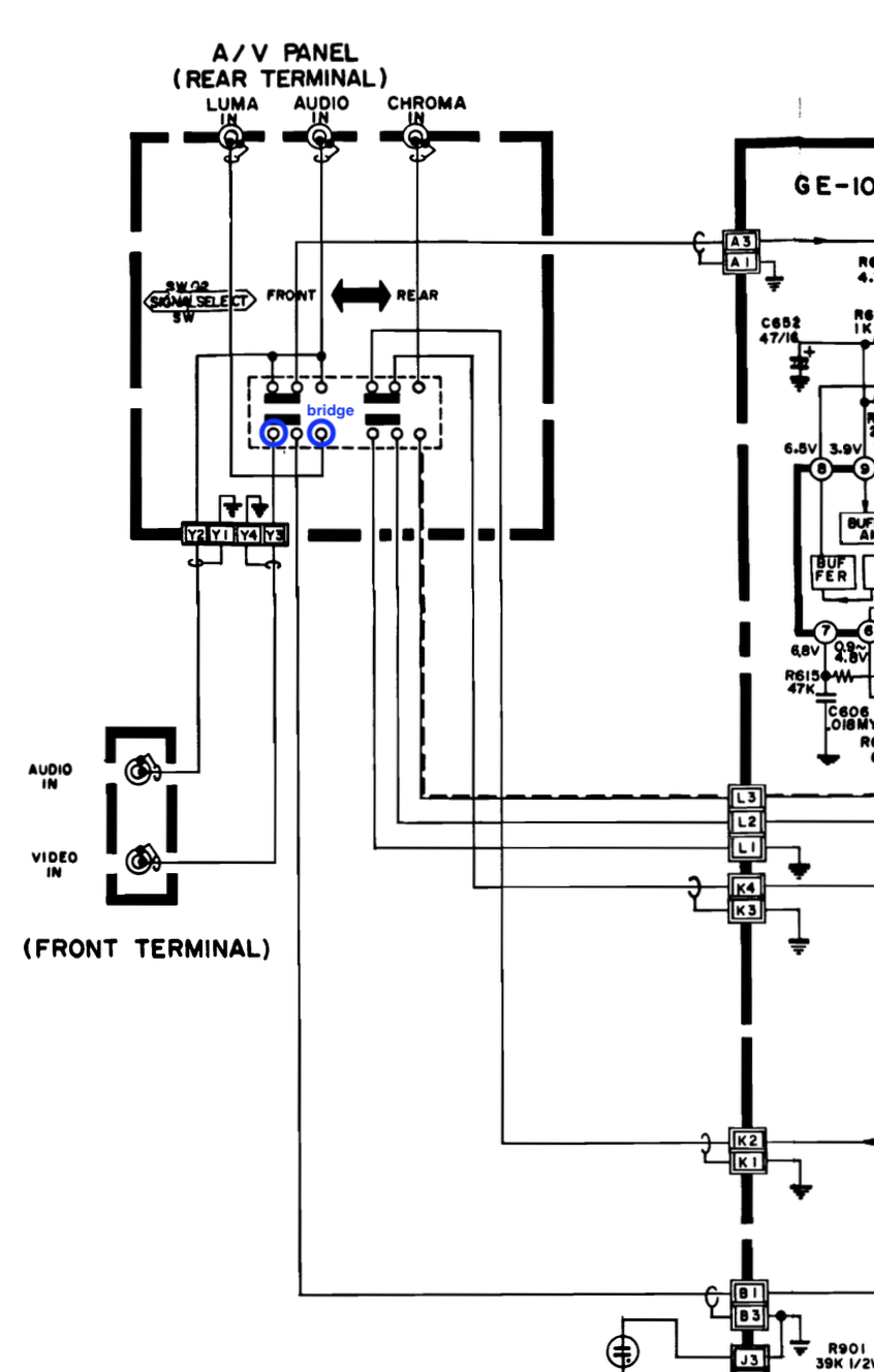 The 1701/1702 monitors take composite from the front RCA connector and luma/chroma from the rear connectors. There is a very simple mod that can be made to enable using composite from the back panel using the luma connector. Both the composite and the luma signals go to the same video path, so it's enough to bridge them together with a short wire; see the schematics and picture below. The switch will still commute between composite and luma/chroma but both can be plugged in the back, keeping the front of the monitor clean.