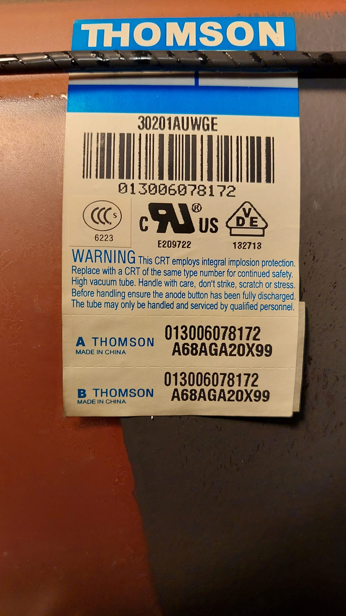 Tube is an RCA/Thomson A68AGA20X made in China. It can be found in many other sets of the time, and it can be used as a donor Japanese candy cabs like the Sega Blast City.