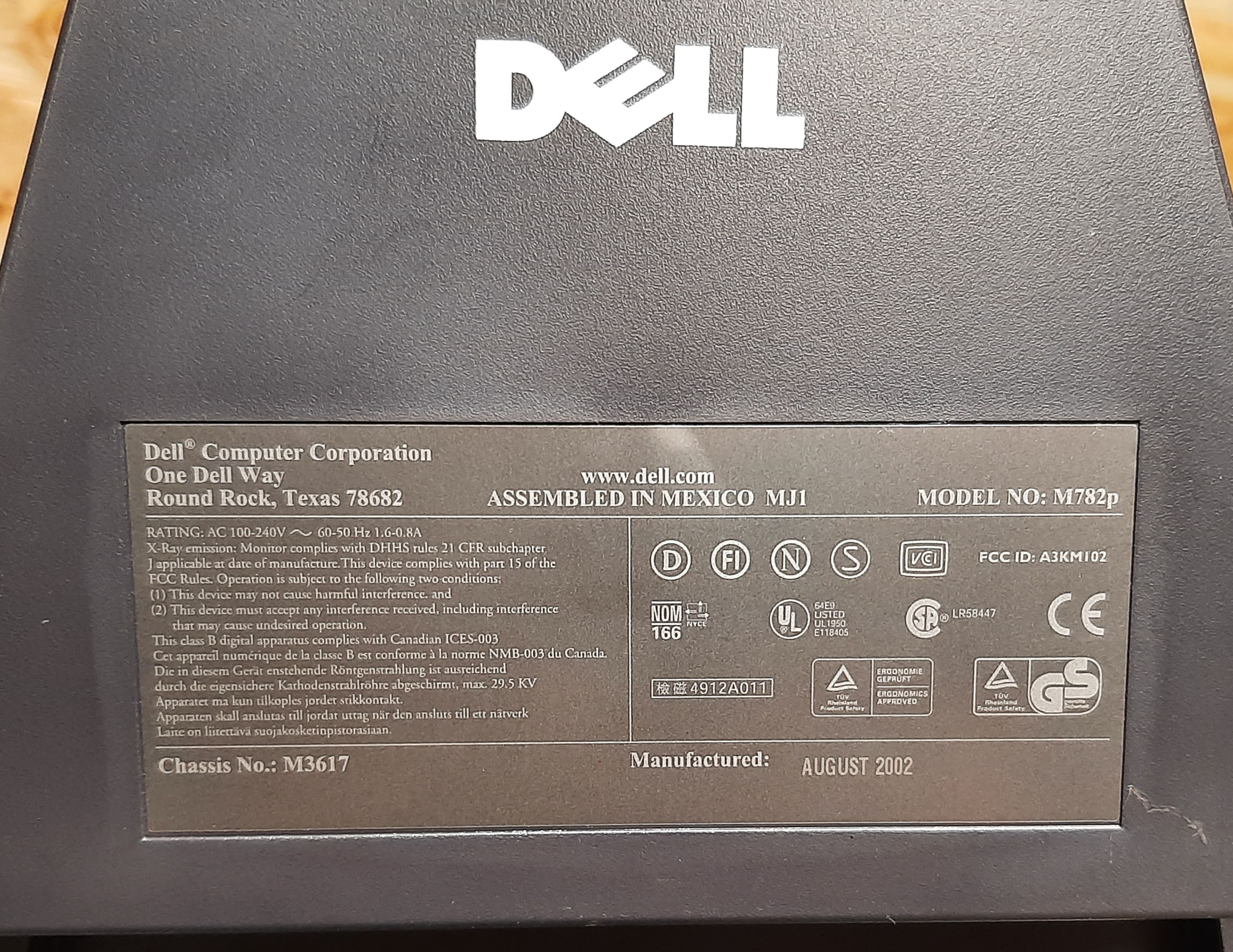 17" flat CRT computer monitor, manufactured by Philips and sold under the Dell brand. It is relatively high spec for its size, and is capable of 88 kHz horizontal scan rate. This translates to a max resolution of 1900x1425 at 60 Hz, or 1024x768 at 108 Hz.