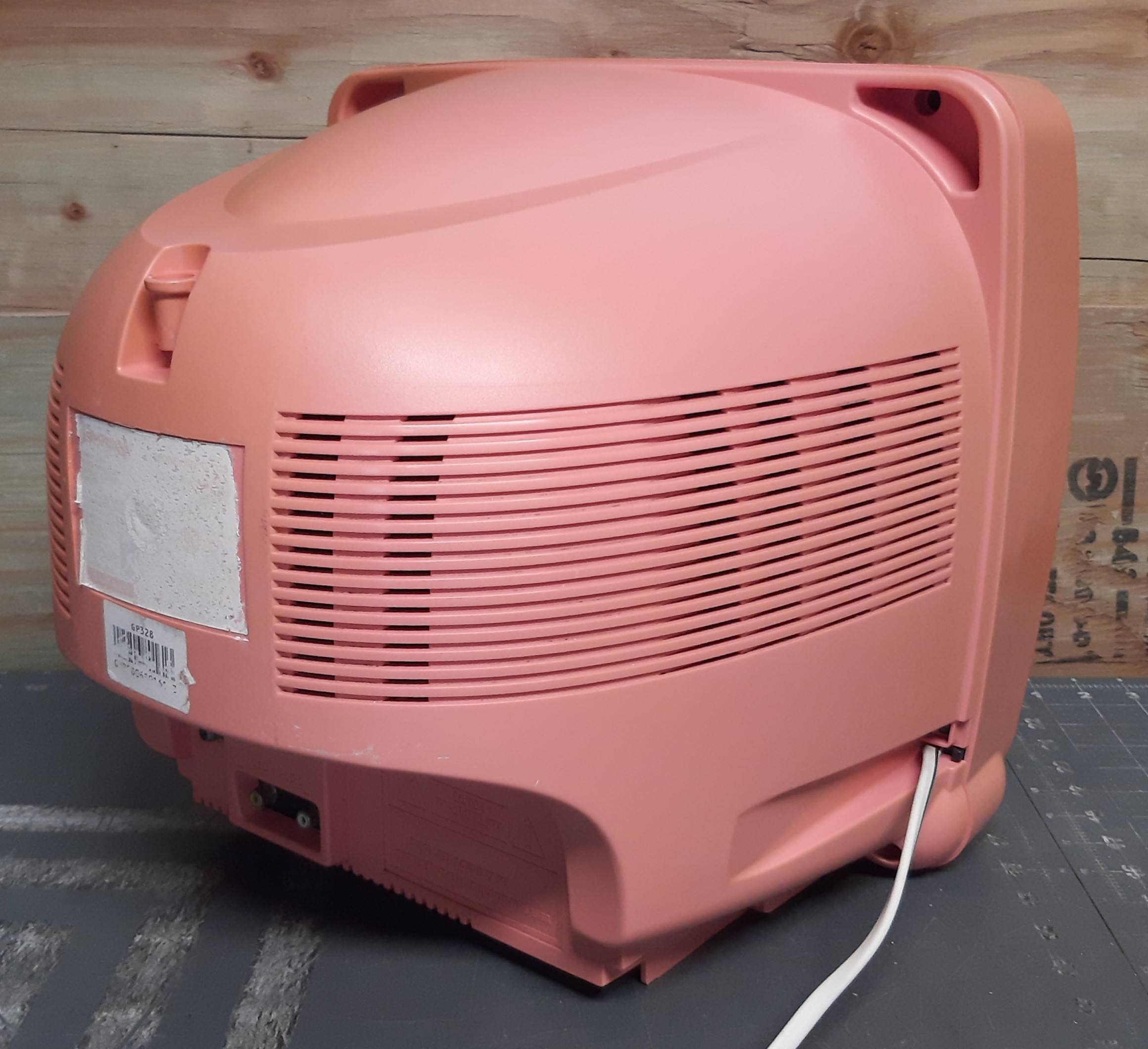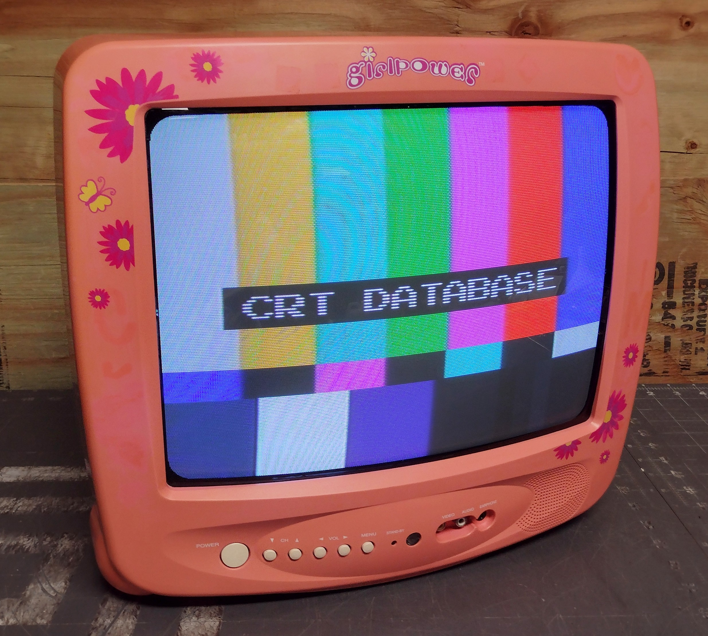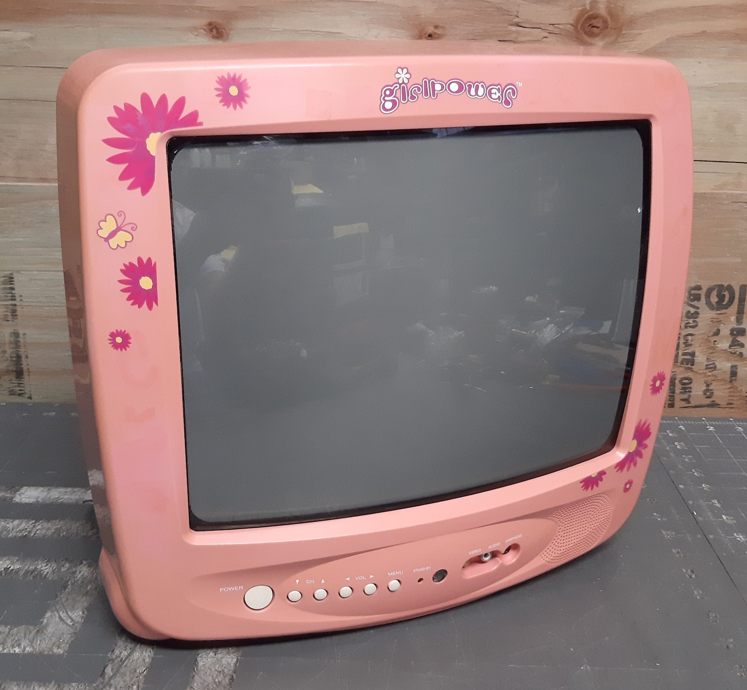 13" kids' TV, with a pink flower design. Part of a series of "Girlpower" electronics that included phones, radios, alarm clocks, etc. Includes front and back mono A/V inputs.