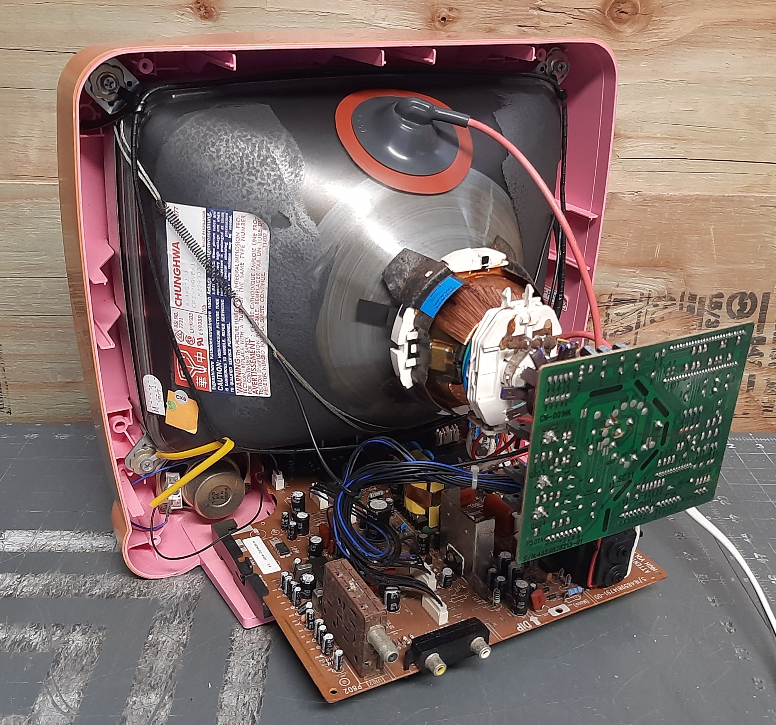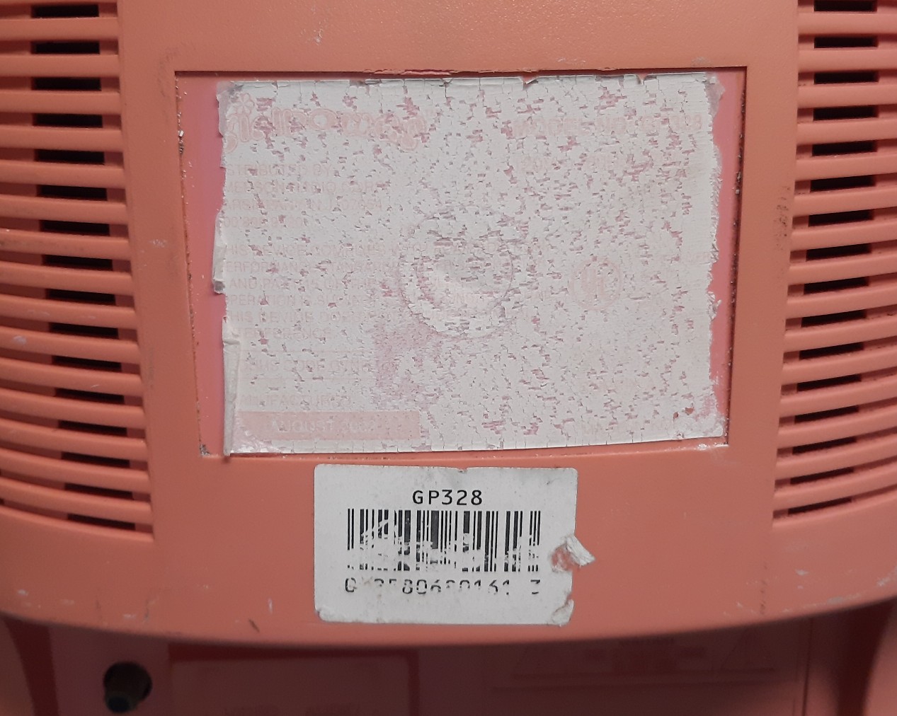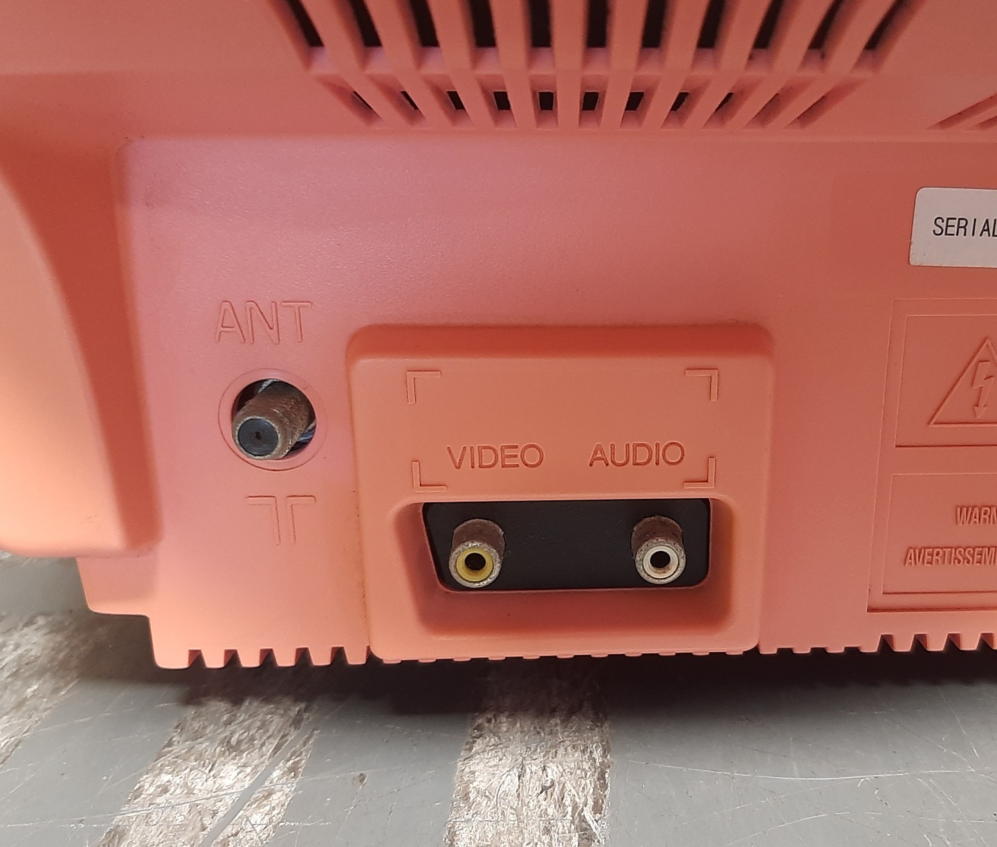 13" kids' TV, with a pink flower design. Part of a series of "Girlpower" electronics that included phones, radios, alarm clocks, etc. Includes front and back mono A/V inputs.