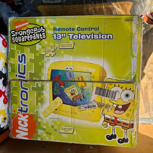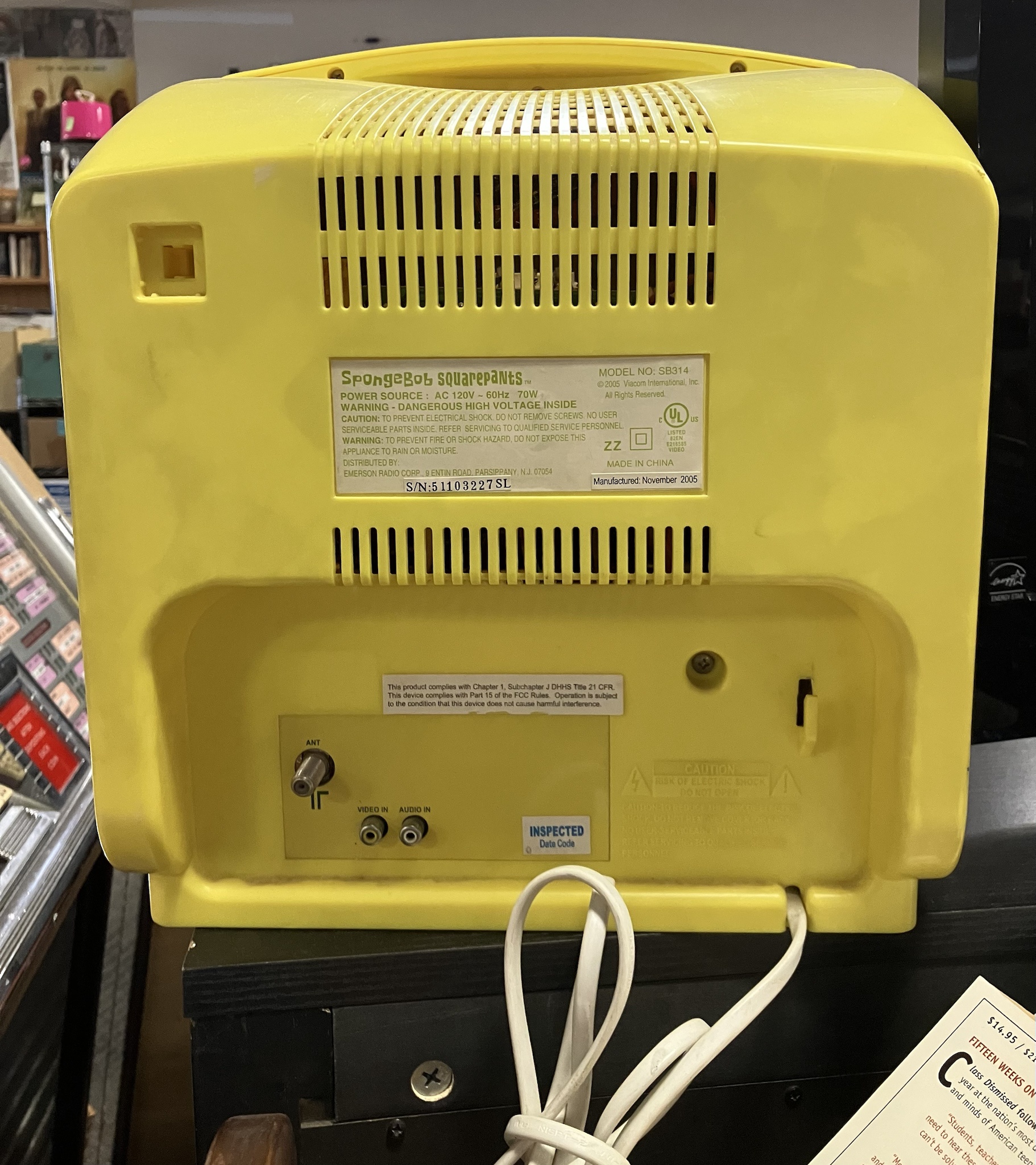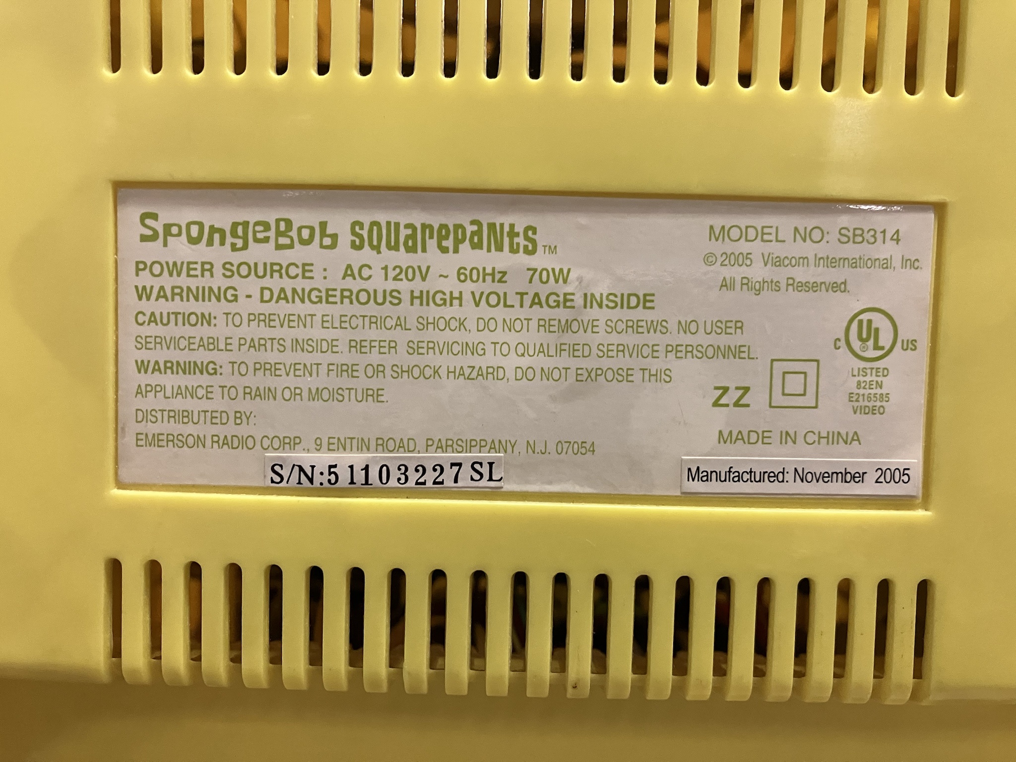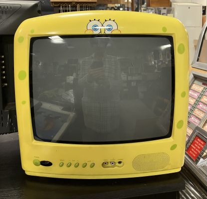 13" CRT television modeled after SpongeBob SquarePants. It is painted yellow with his holes painted on the sides.