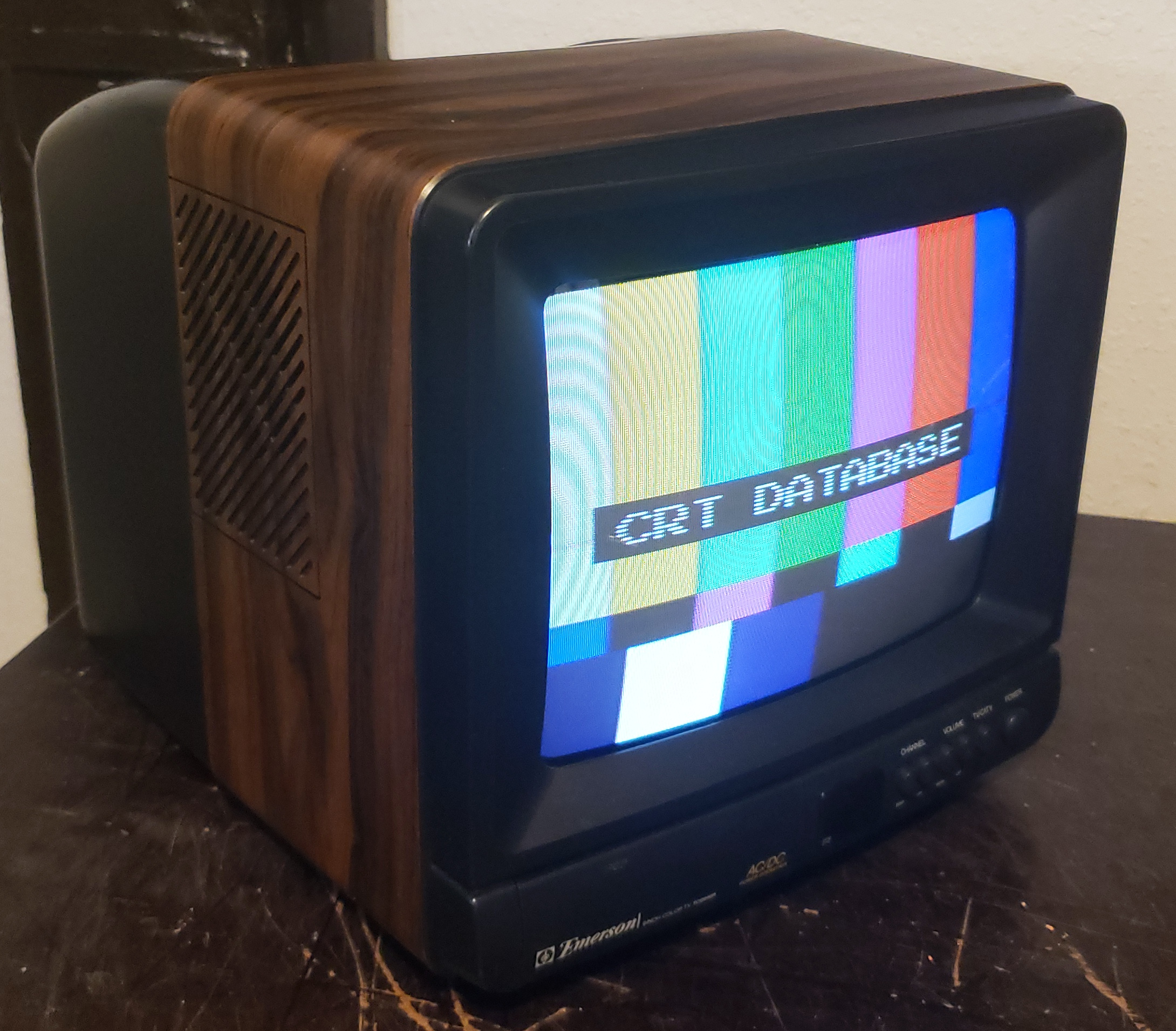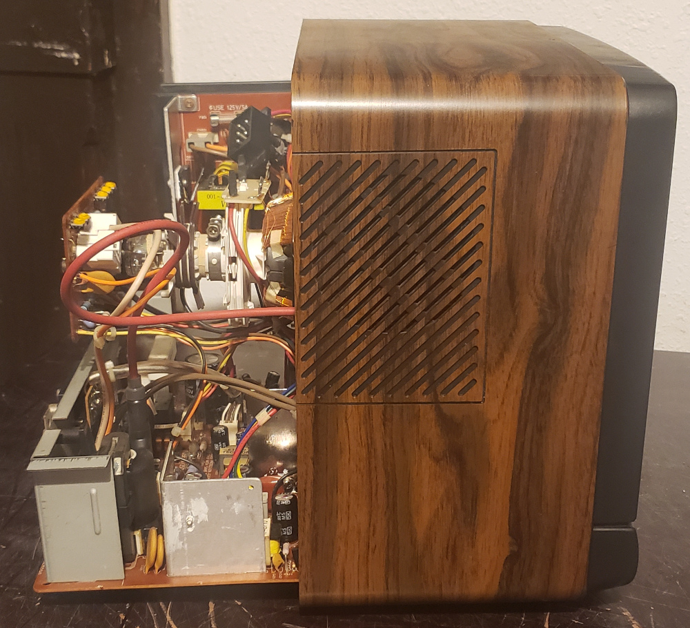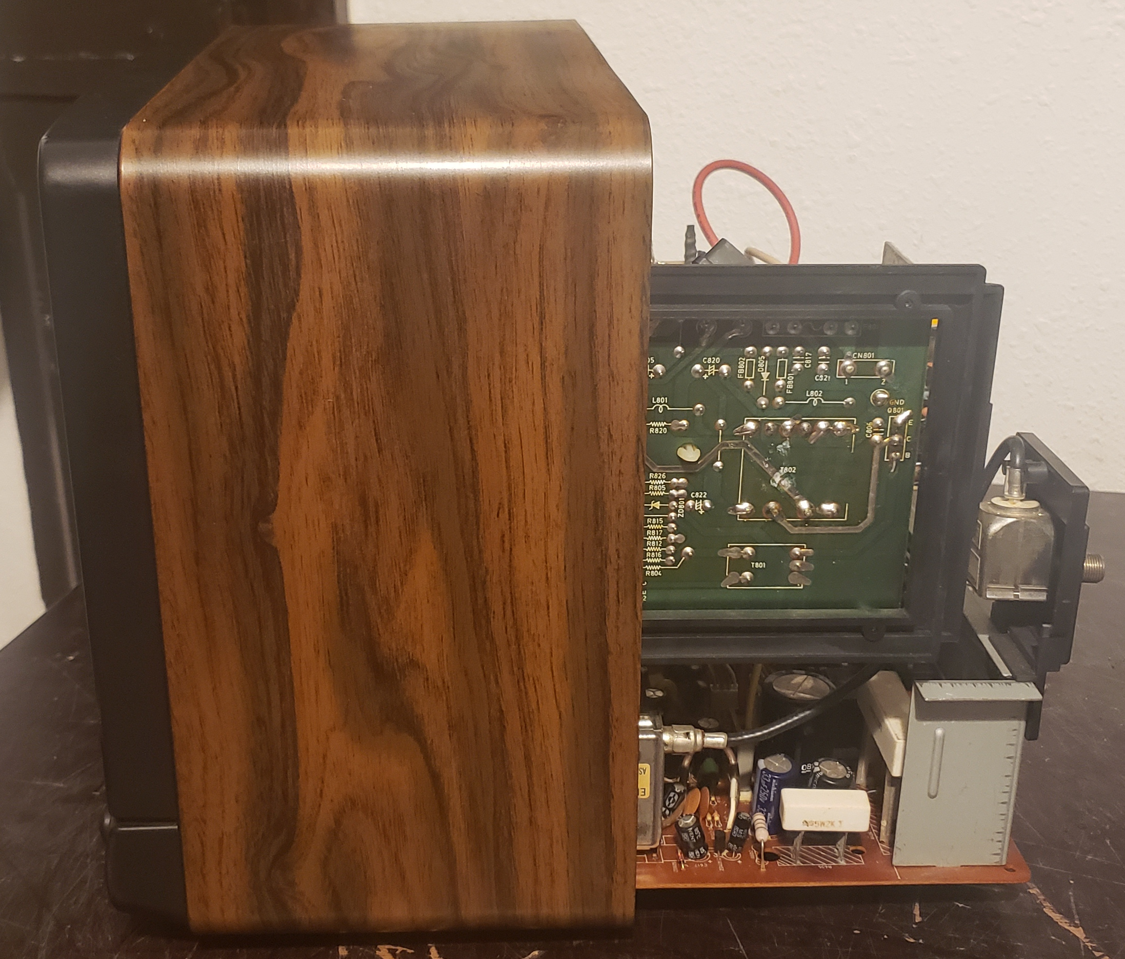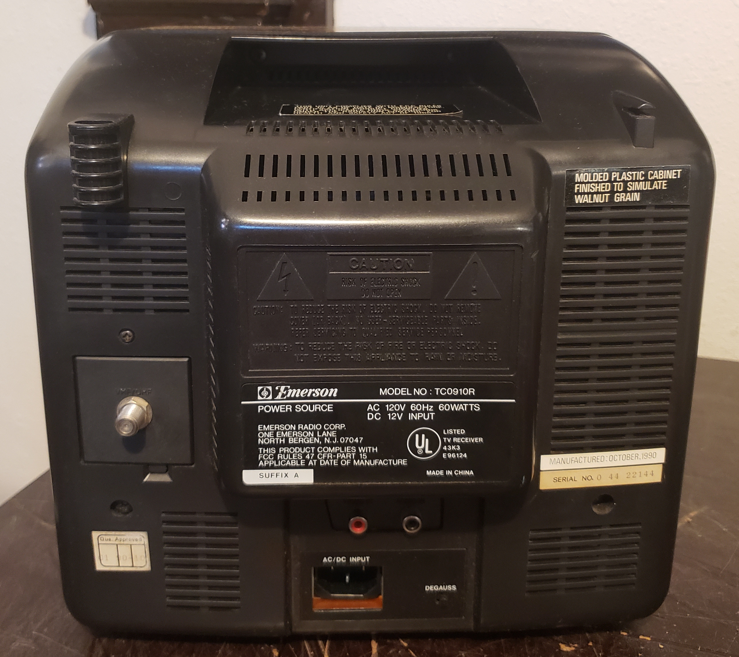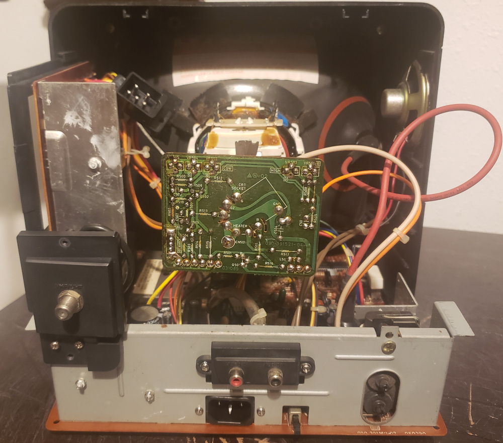 There is an internal potentiometer to adjust vertical height. According to the NTE equivalent jungle datasheet, it should be S-Video moddable. Composite video itself is presented well with minimal artifacting, though as with some other sets 9" and below there can be a bit of a screen-door effect on the raster. The set pictured had its original 5-pin Taiho power jack replaced with a C14 connector. To use the original 5-pin jack, the prong closer to the notch on the set is neutral (wider blade of wall AC plug), and the prong further from the notch is hot (narrower blade of wall AC plug).