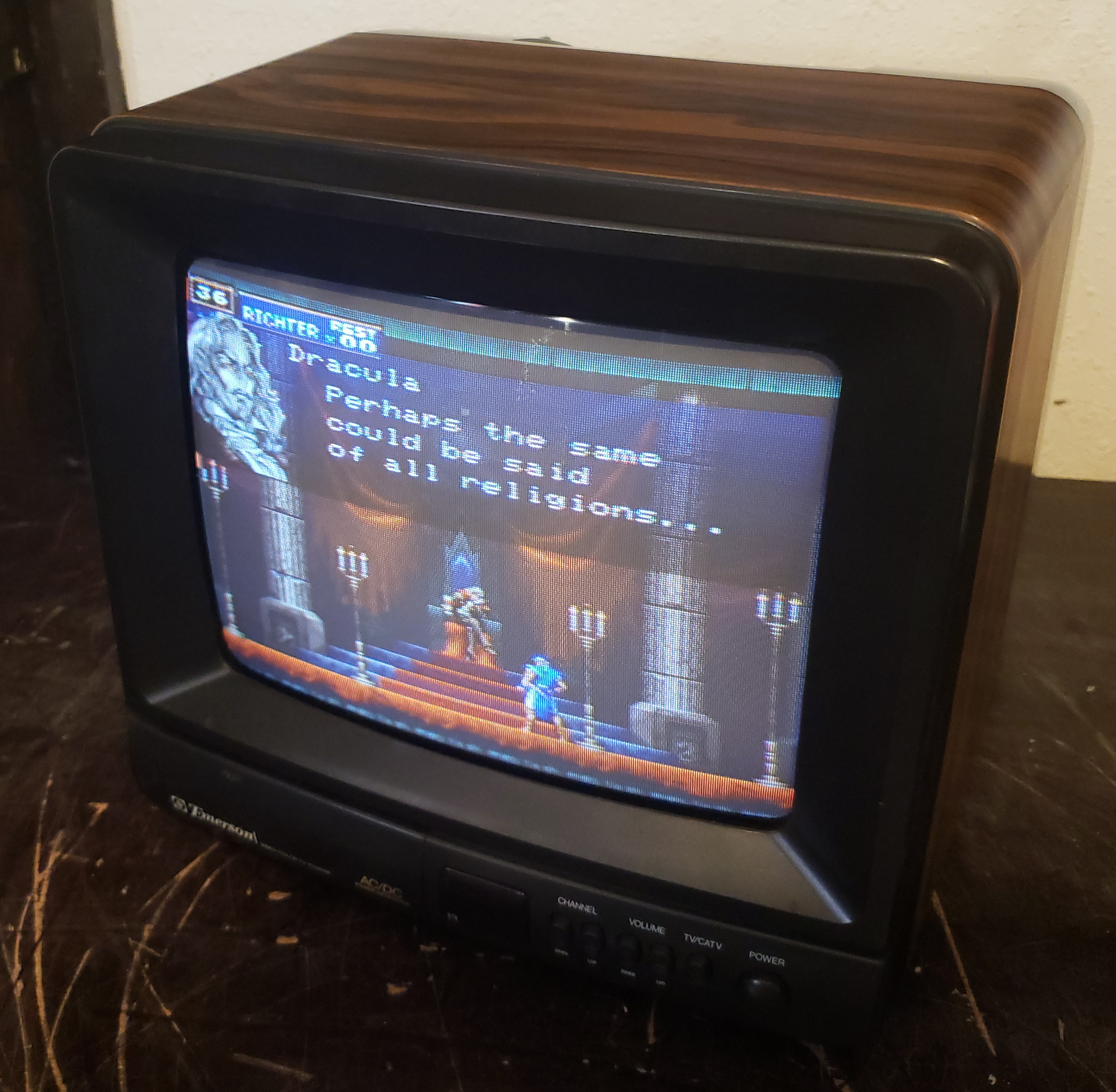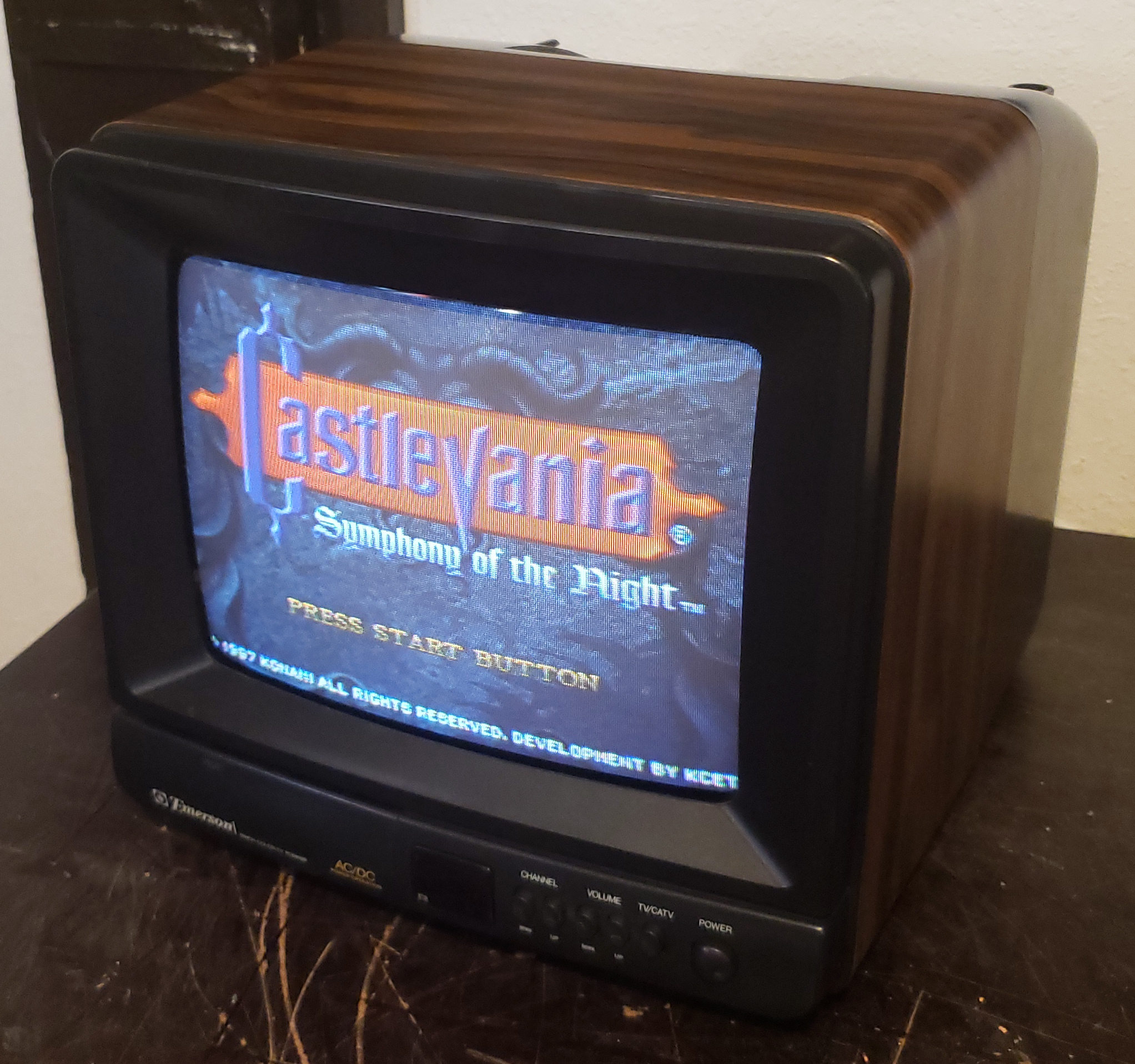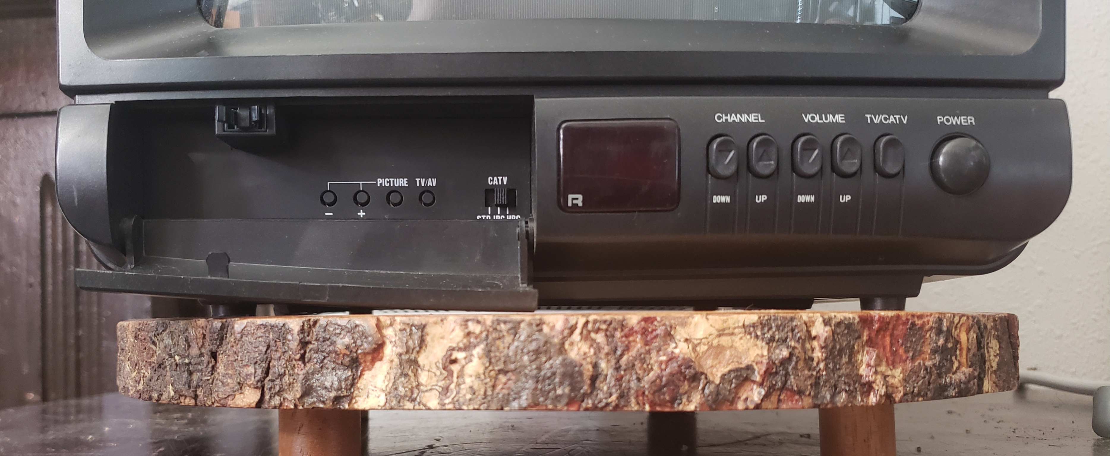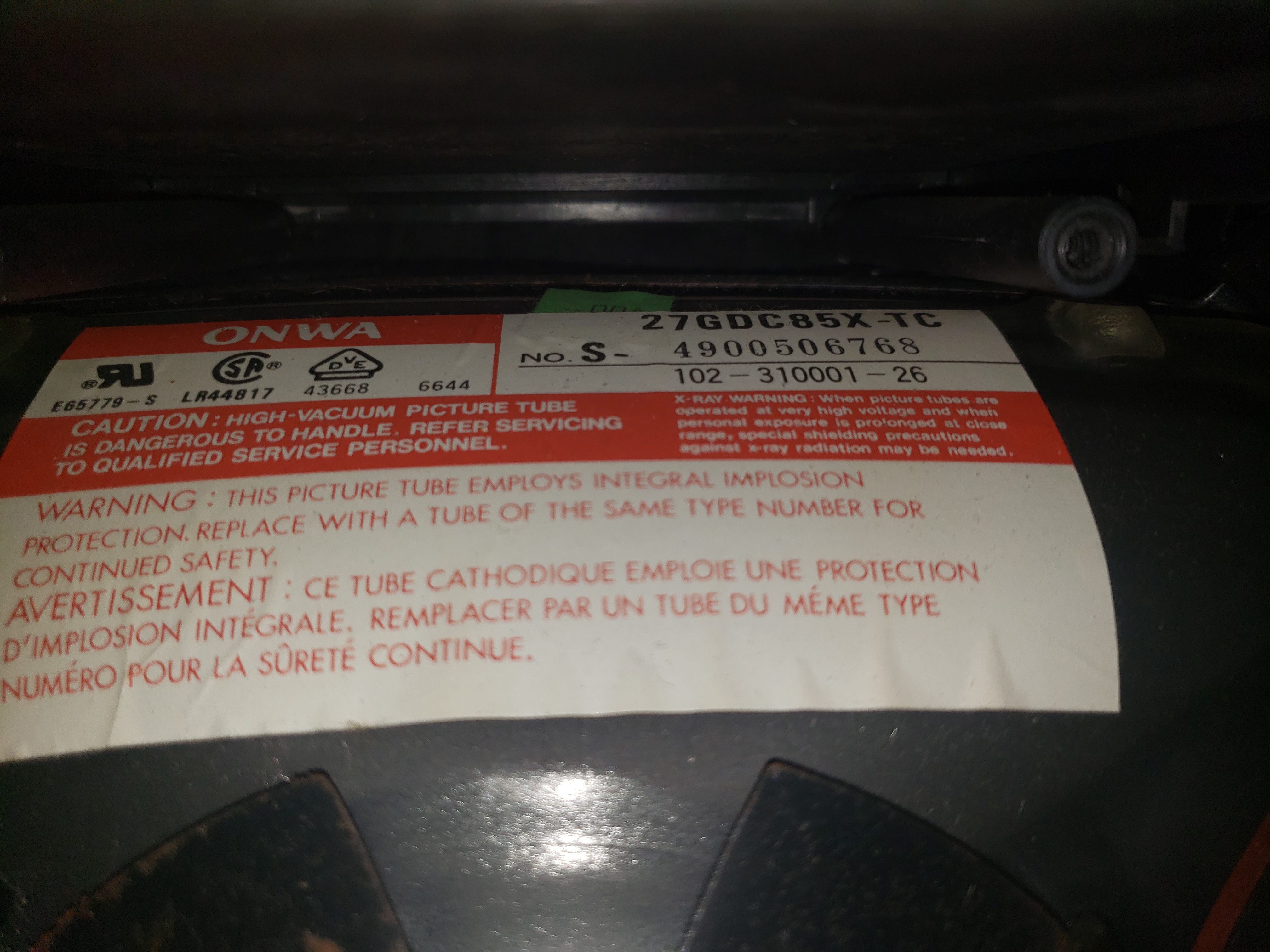 There is an internal potentiometer to adjust vertical height. According to the NTE equivalent jungle datasheet, it should be S-Video moddable. Composite video itself is presented well with minimal artifacting, though as with some other sets 9" and below there can be a bit of a screen-door effect on the raster. The set pictured had its original 5-pin Taiho power jack replaced with a C14 connector. To use the original 5-pin jack, the prong closer to the notch on the set is neutral (wider blade of wall AC plug), and the prong further from the notch is hot (narrower blade of wall AC plug).