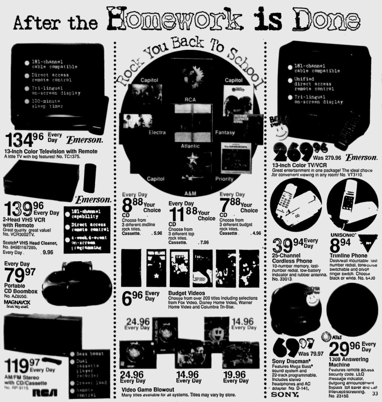 13" TV/VCR combo. Manufactured by Orion and sold under the Emerson brand. Later Emerson TVs would be manufactured by Funai.