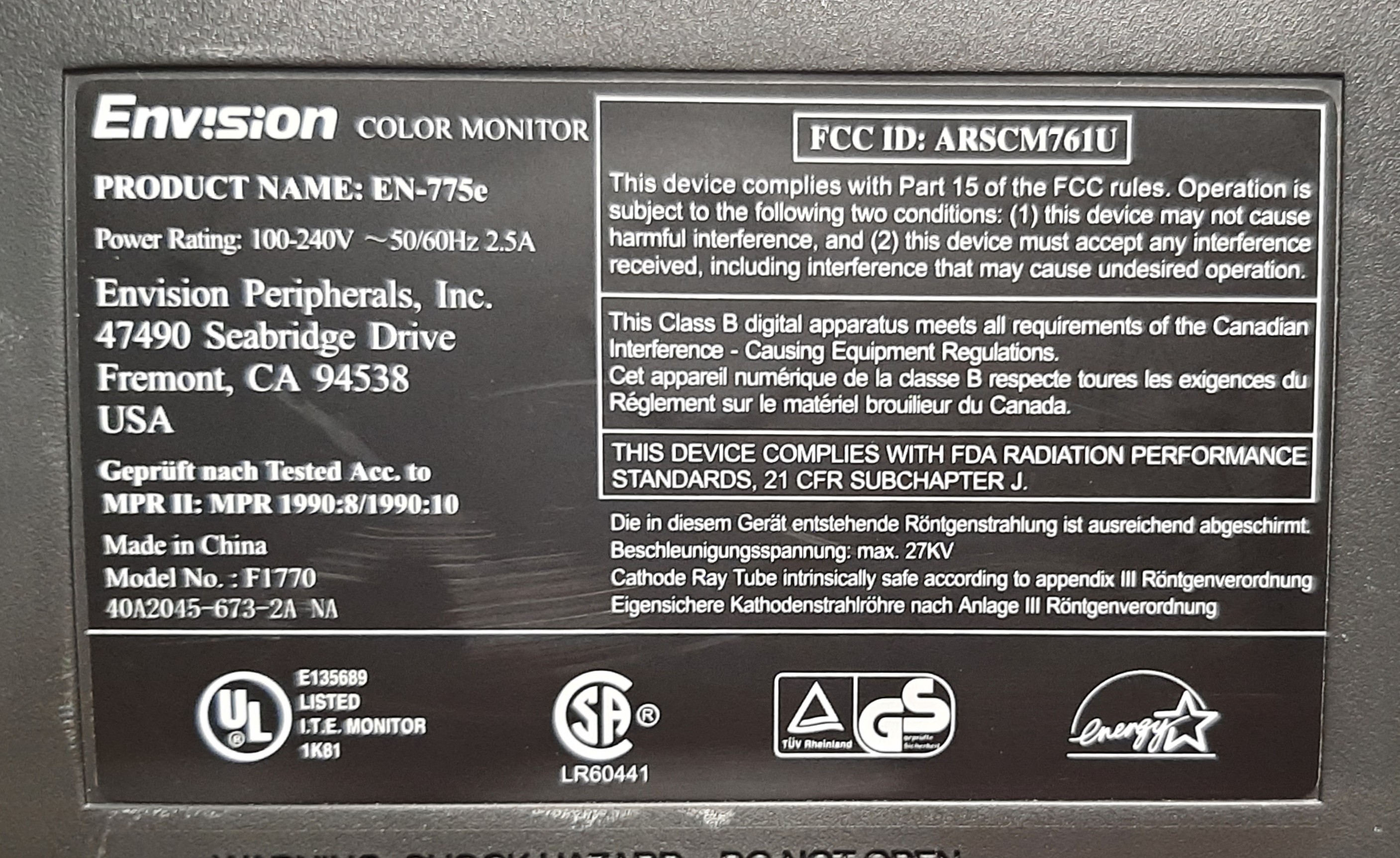 Late model, entry level 17" PC monitor. Made by AOC and sold under the Envision brand. Features a flat Chunghwa shadow mask tube. Similar in appearance to the Dell E773C (also made by AOC).