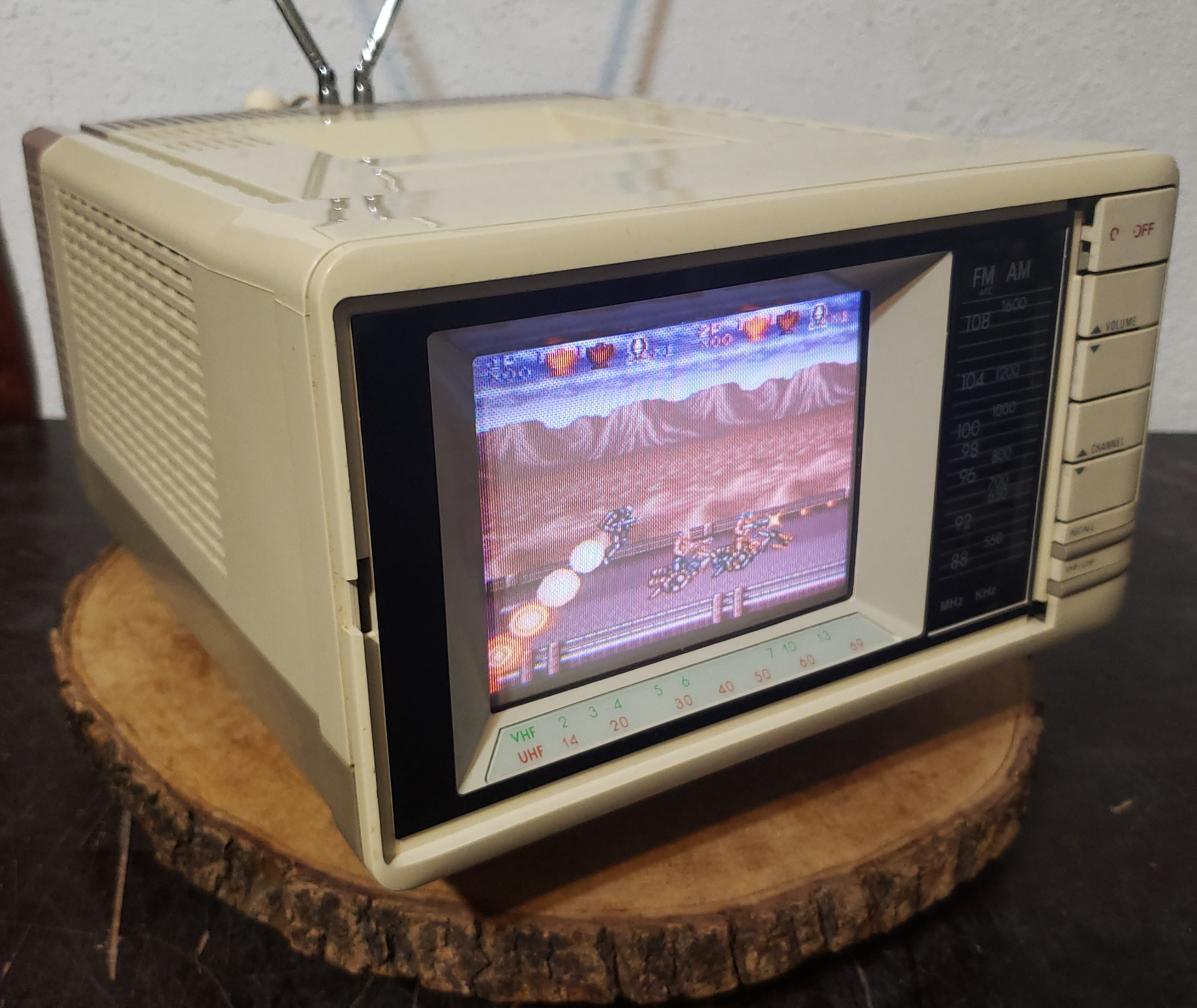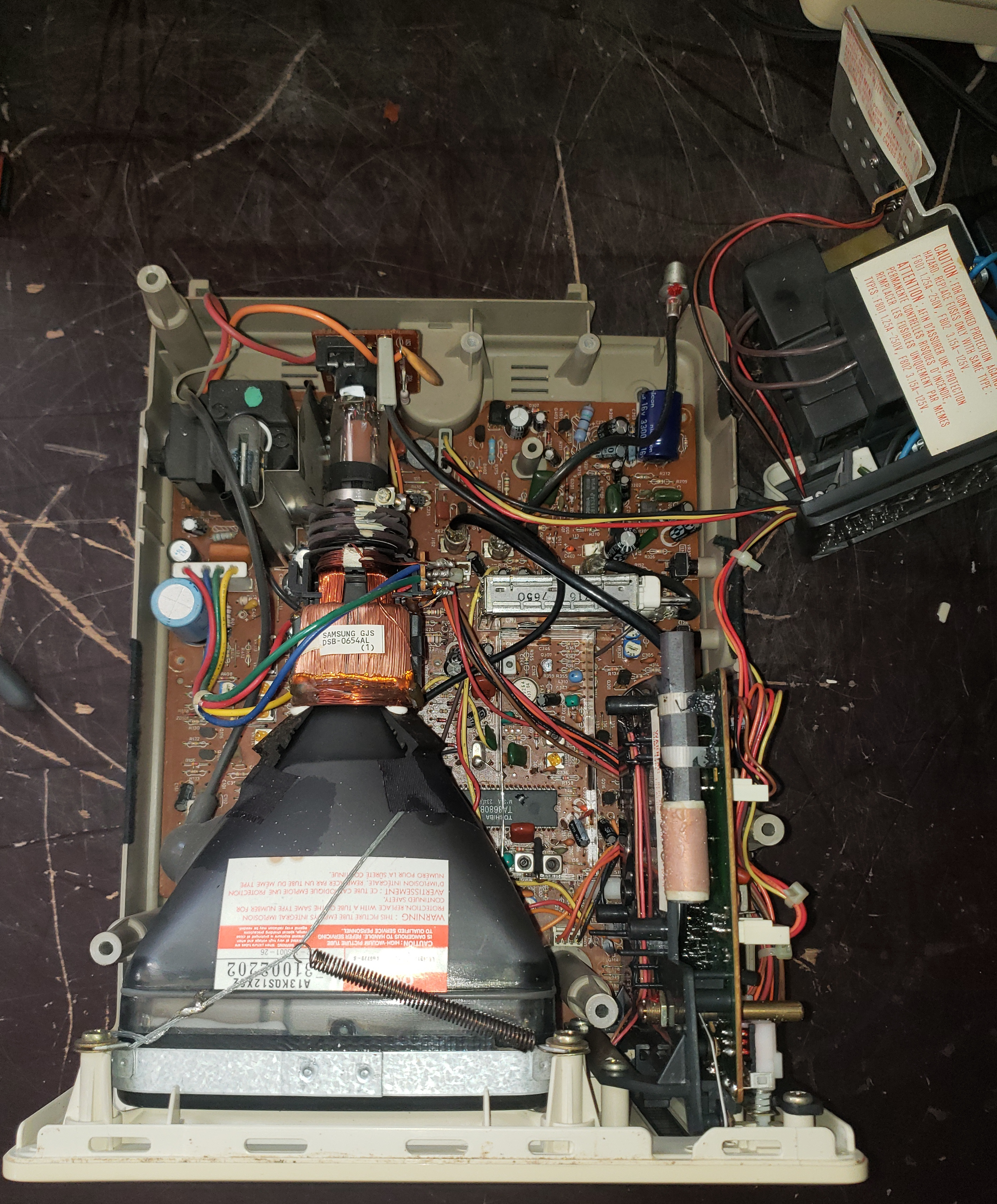Input mods are possible with this jungle chip, but getting to the bottom of the main PCB requires a lot of disassembly. The TV tuner uses a green vertical line on the screen to indicate what channel it is on by how it is lined up with the label on the bezel.