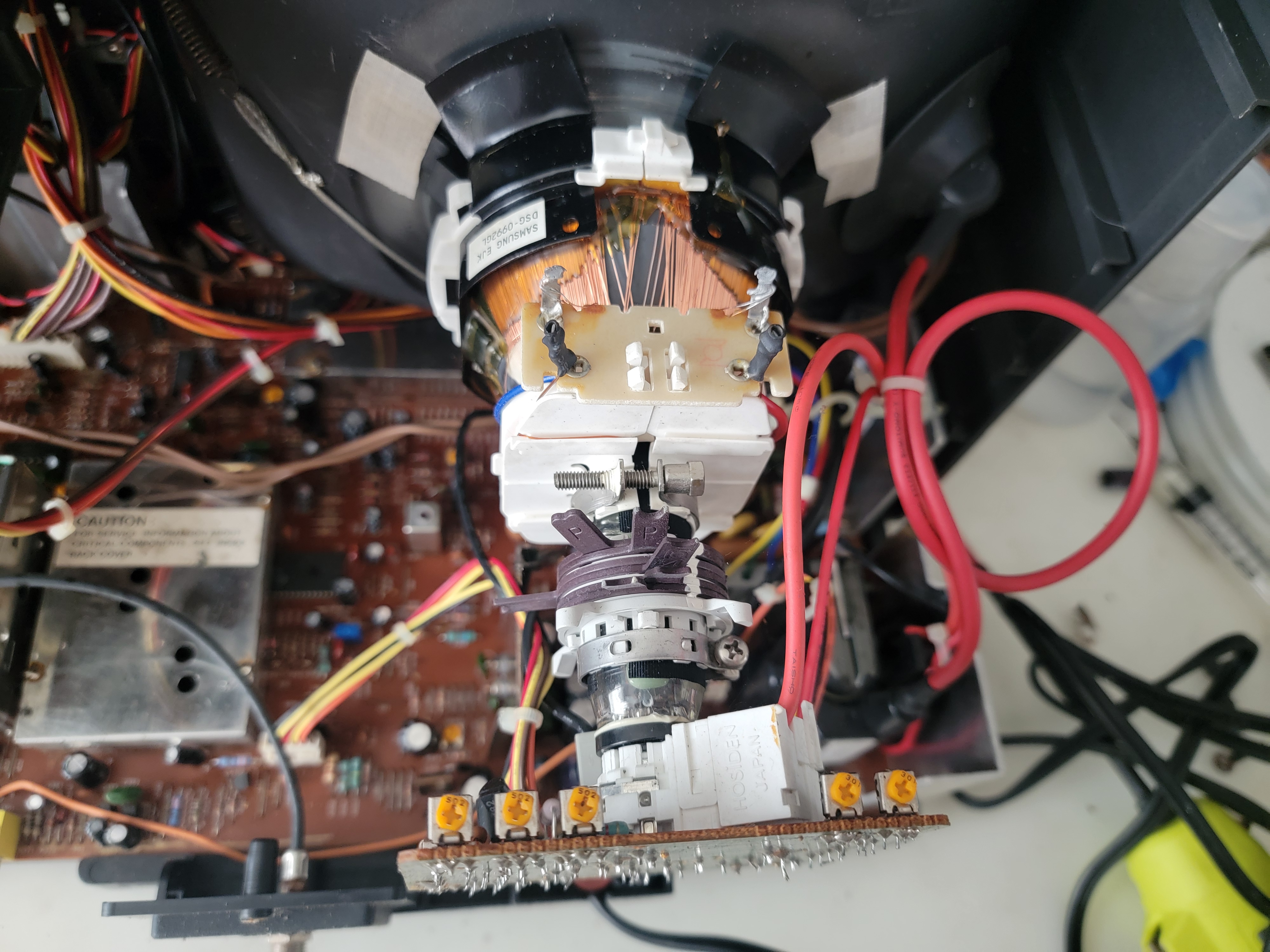 There is an OEM remote (model # unknown) which provides channel changing, volume adjustment, and some basic picture adjustments which are otherwise inaccessible from the outside. Inside, there are pots for adjusting brightness, contrast, geometry, and more.