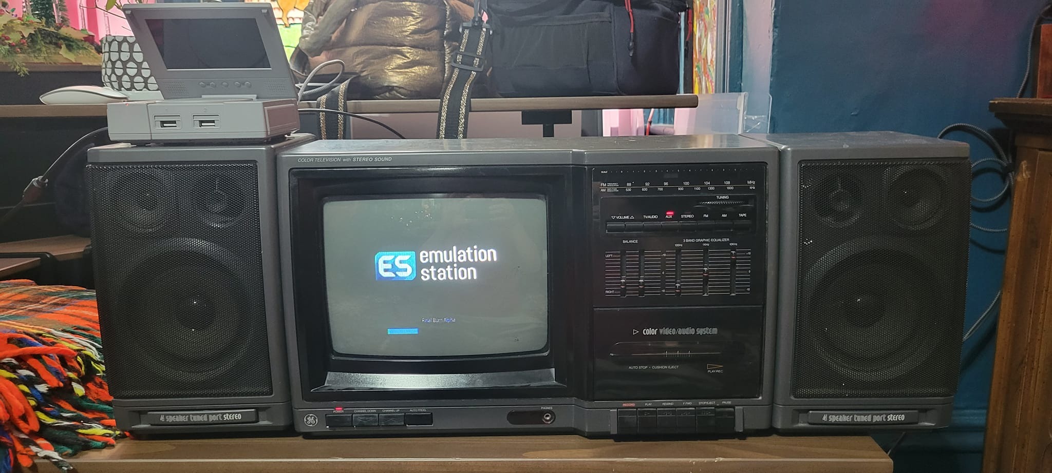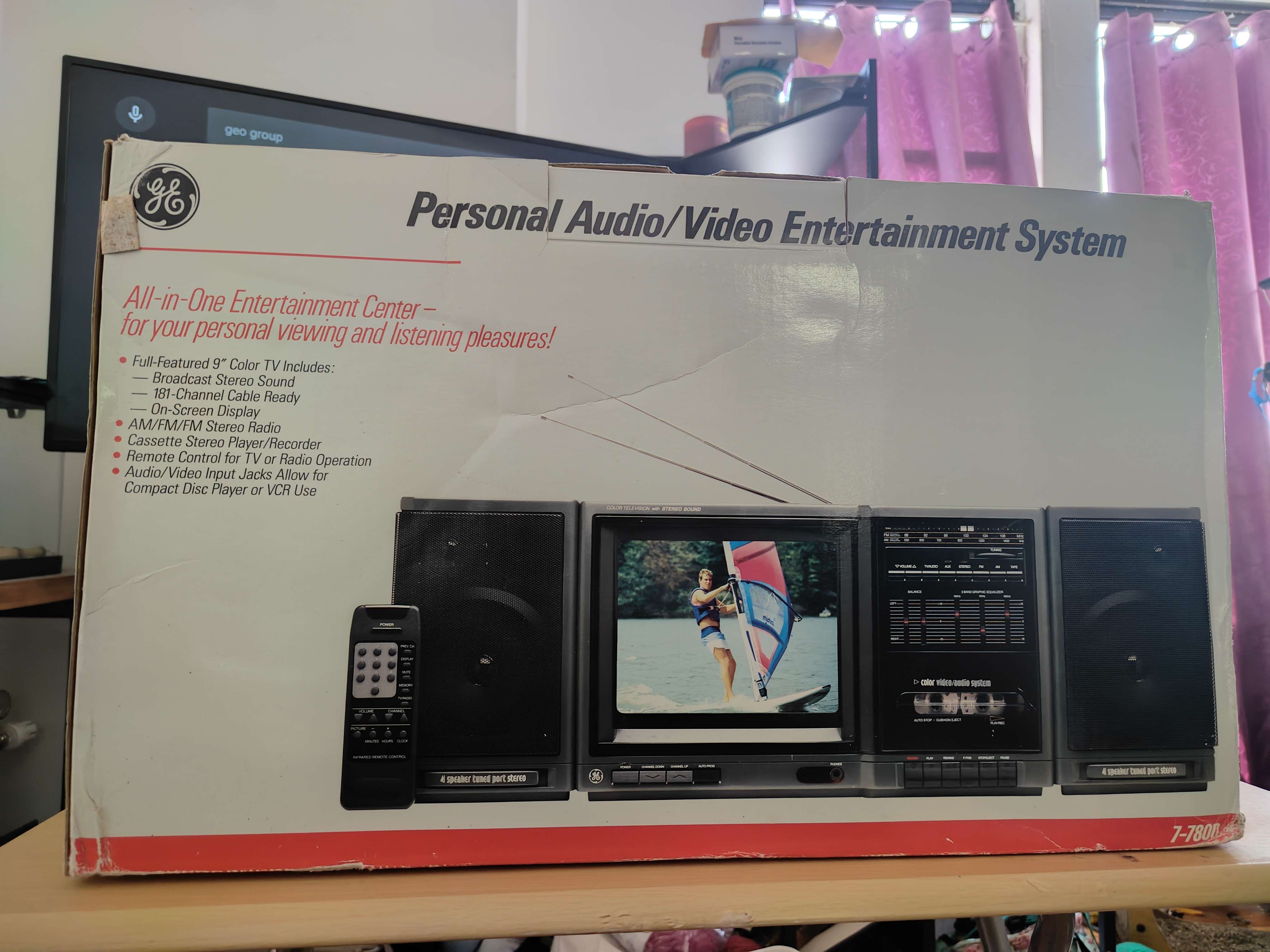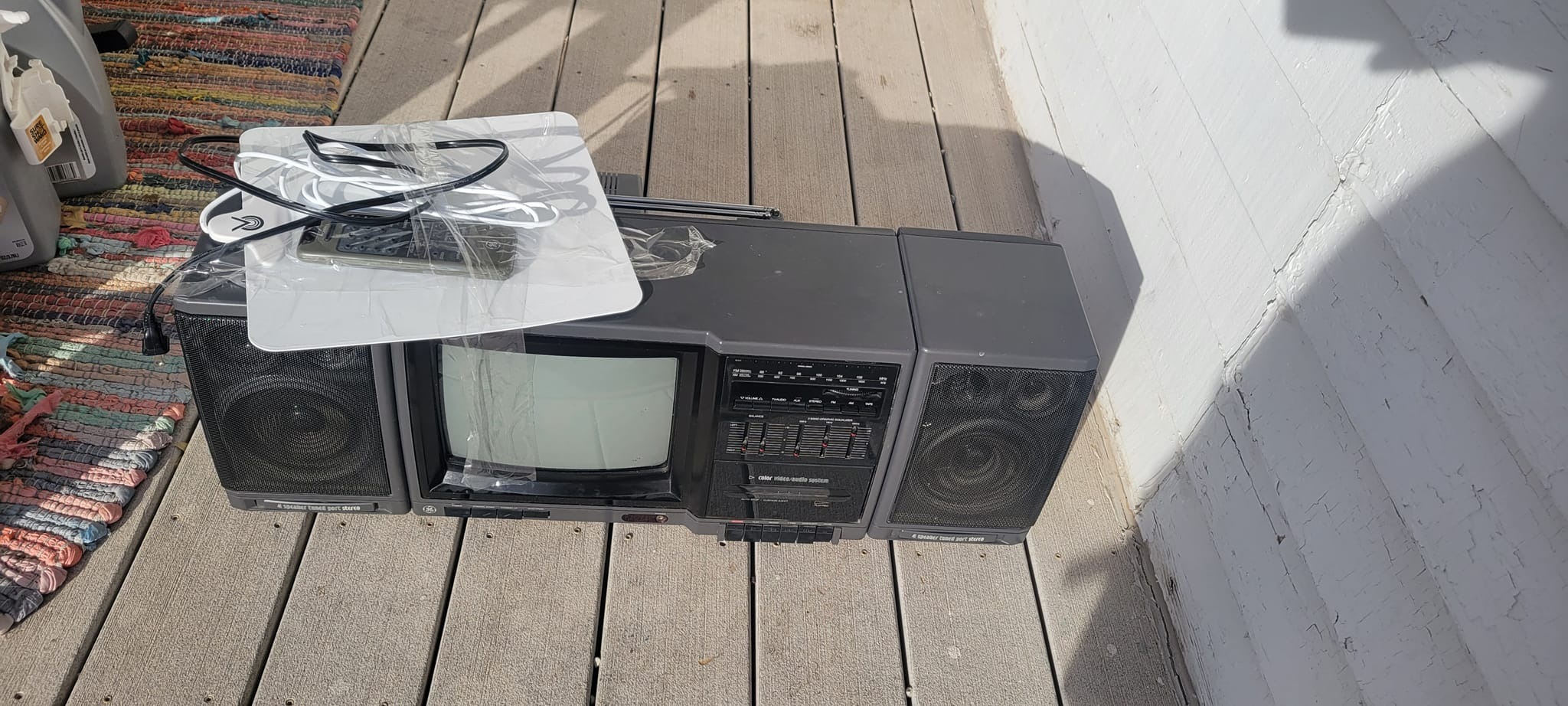 9" multi-function CRT with carrying handle. Functions include a TV tuner, cassette player/recorder, AM/FM radio, and stereo. It has aux inputs for external composite or stereo audio sources.