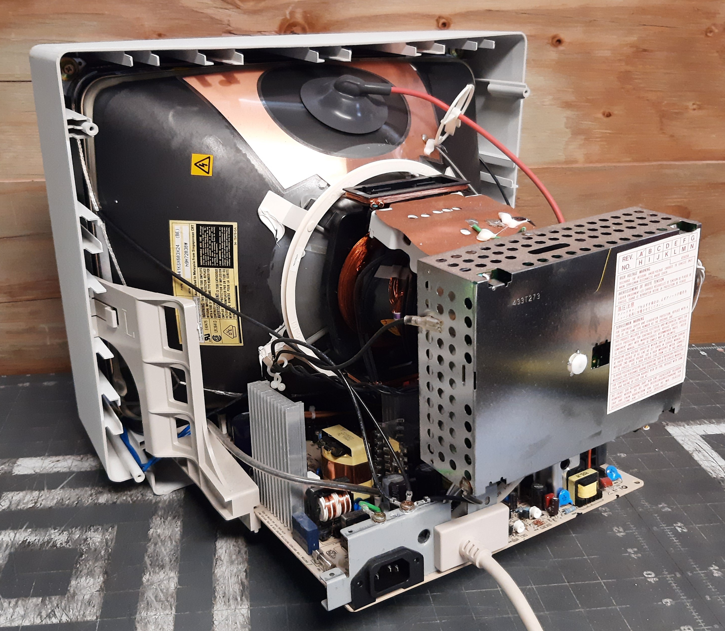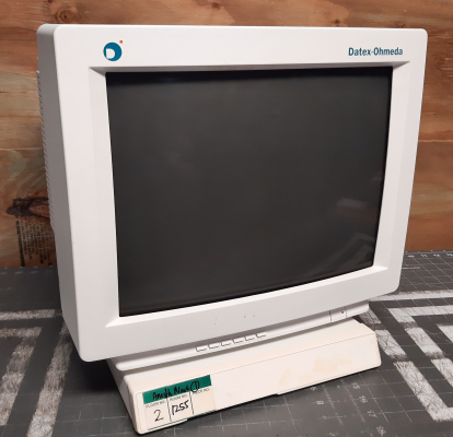 The monitor in these photos is a medical variant, sold by Finnish company Datex-Ohmeda for use with anesthesia devices. It differs from the stock monitor by having a white case, a heavy metal base, and additional internal grounding.