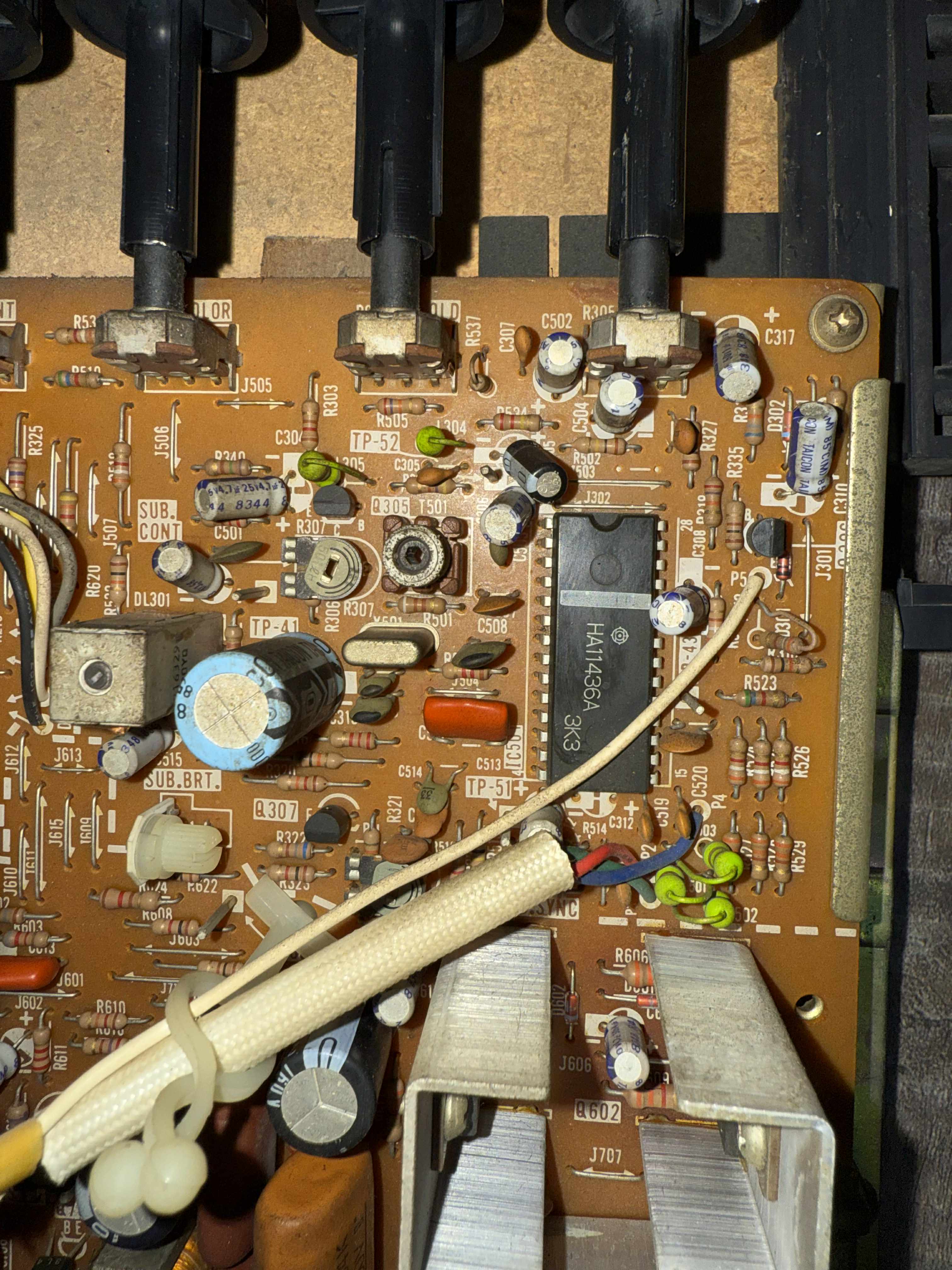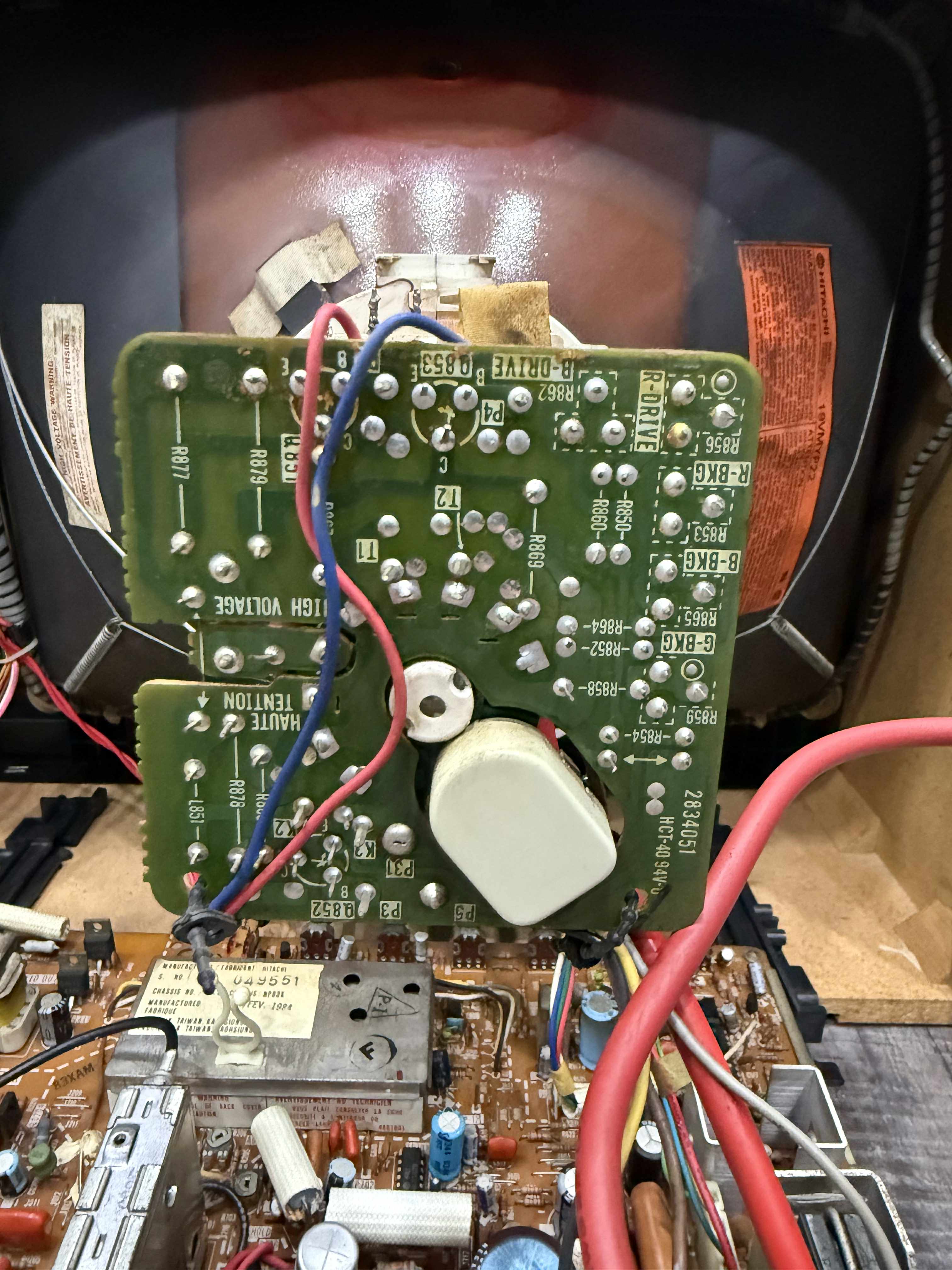 Very slow high voltage bleeding means the picture tube itself retains a considerable amount of energy until manually discharged with an appropriate tool. Once discharged, remove the anode cap to prevent any static electricity recharging capacitors on the main board. There also may be stored energy on any capacitors near the flyback - look for 200v+ rated capacitors which are directly on the screen/G2 circuit and short them safely with a cheap set of discharge probes off Amazon. Repeat the same process for any large-diameter power supply filter capacitors to ensure the board is completely drained of energy.
