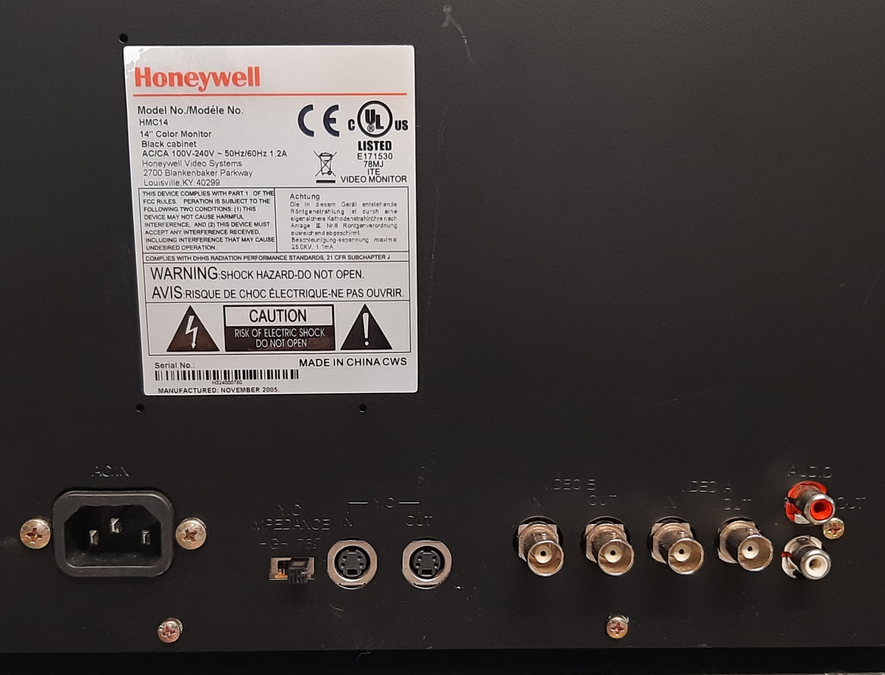 13" CCTV monitor with a sturdy metal case. Manufactured by a Korean company named "Hitron Systems". Uses a standard consumer grade 14" tube, with two composite and one S-Video inputs. This monitor was also sold as the Ademco AMC14.