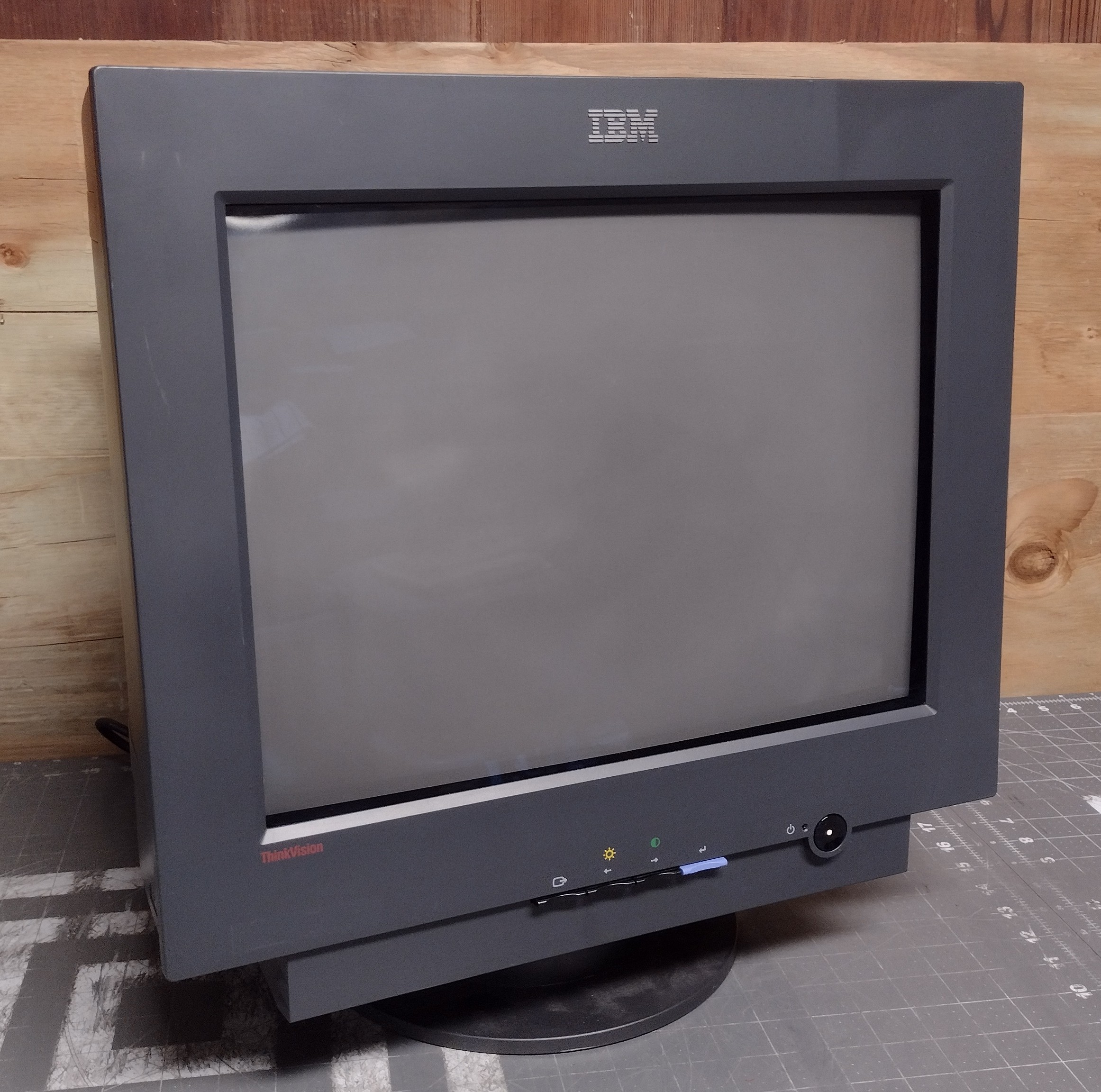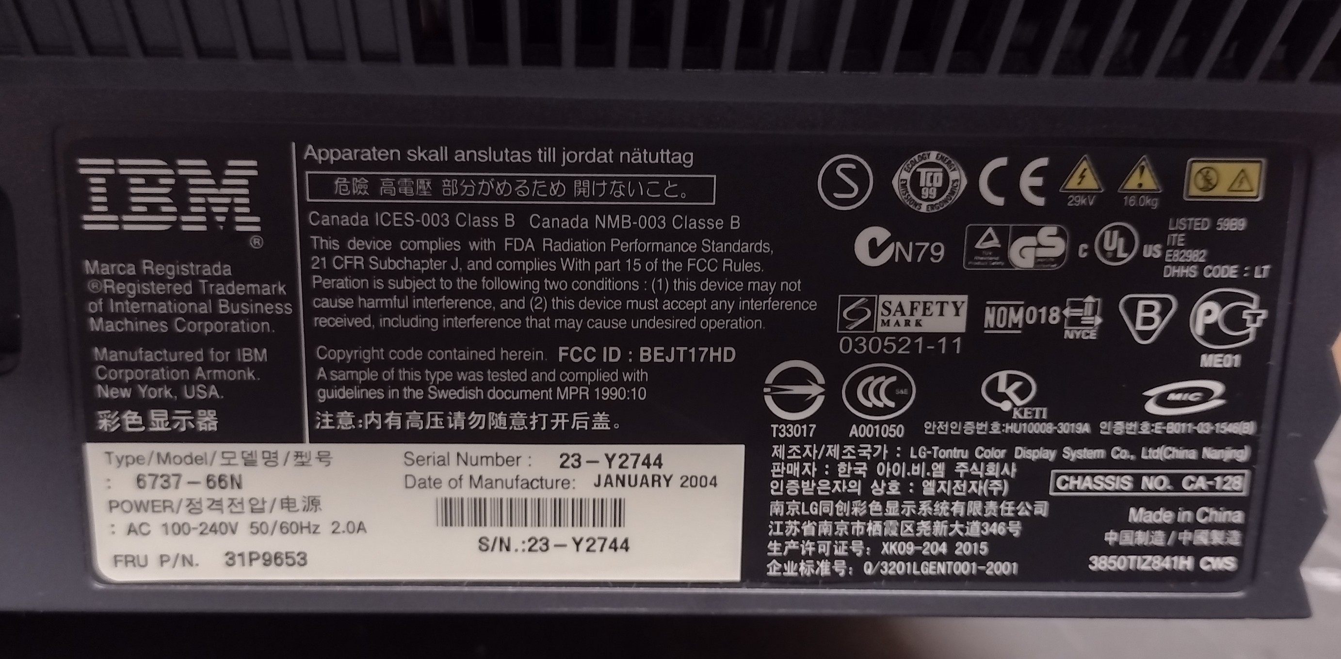 17" flat screen PC monitor, manufactured by LG and sold by IBM. It is relatively high spec for its size, and is capable of 85 kHz horizontal scan rate. This translates to a max resolution of 1800x1350 at 60 Hz, or 1024x768 at 105 Hz.