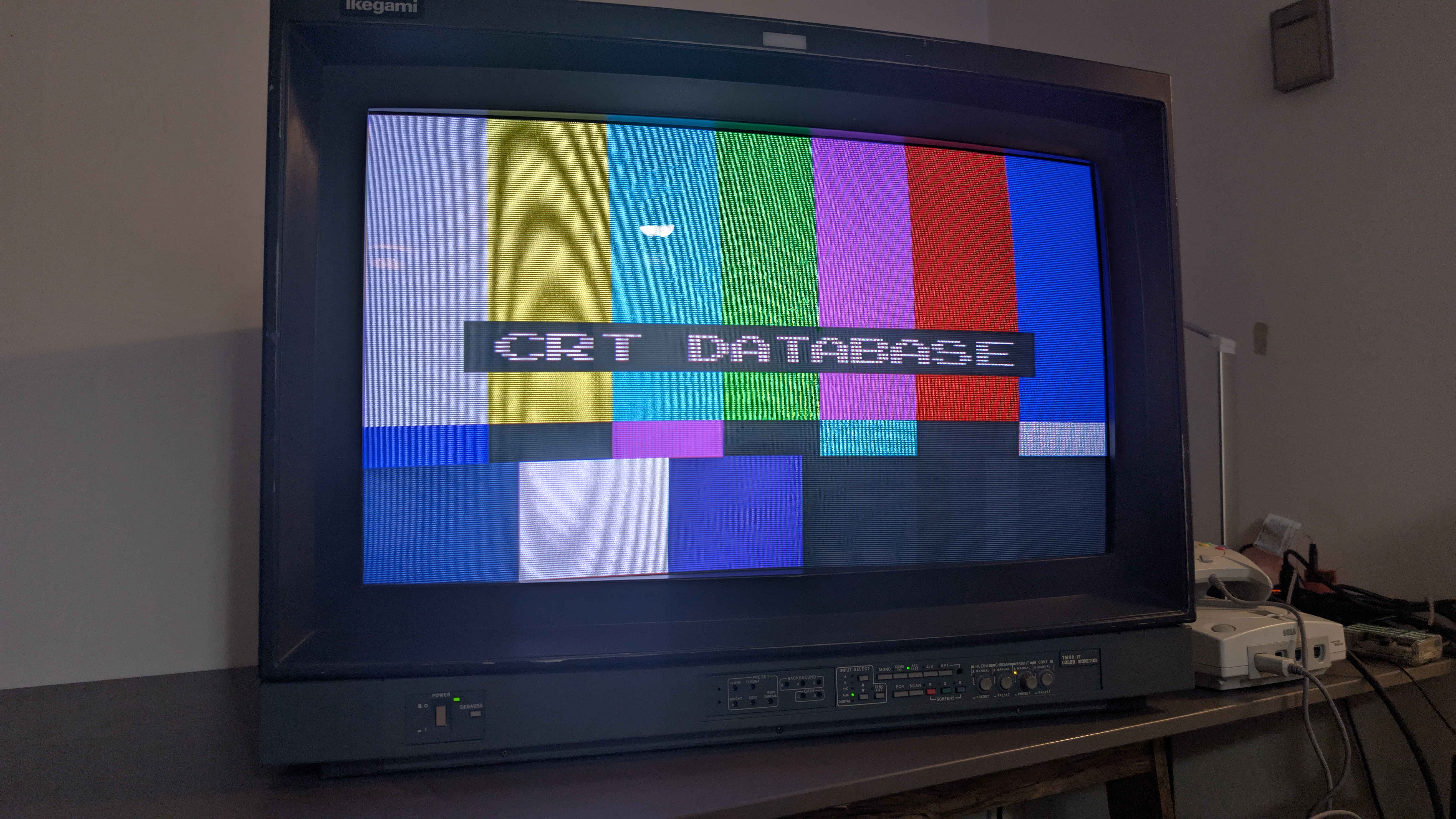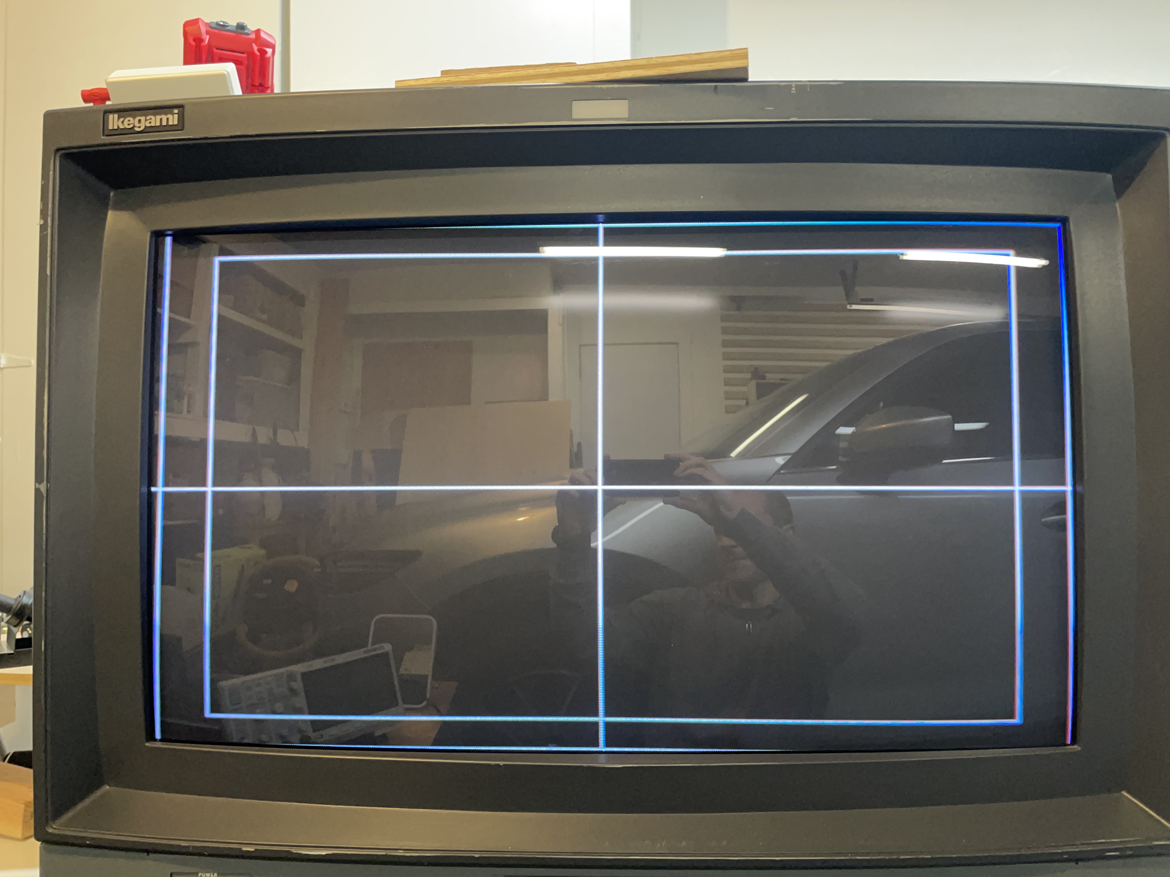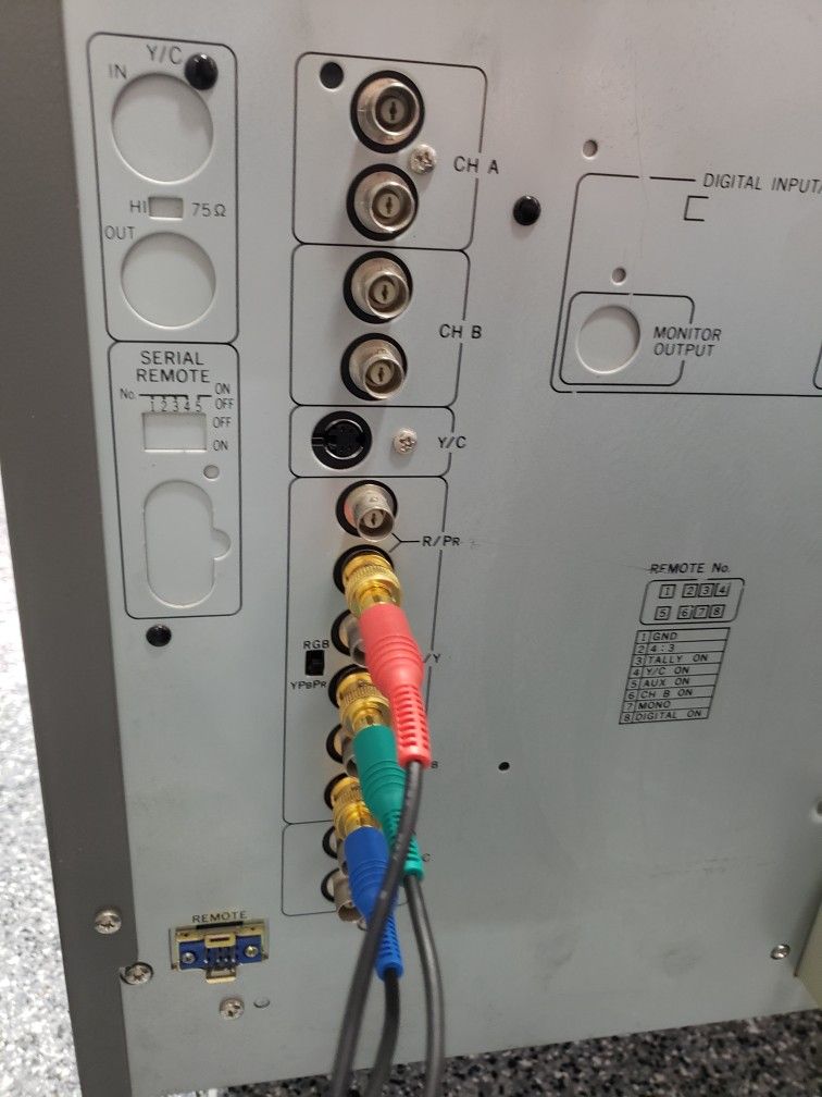 Standard definition widescreen monitor from Ikegami. Supports 240p/480i only. Has modes for 16:9 full and 4:3 letterbox. Primary use case is to display anamorphic 16:9 content. Tube is made by Toshiba and has the hallmark purplish-hue of Microfilter.