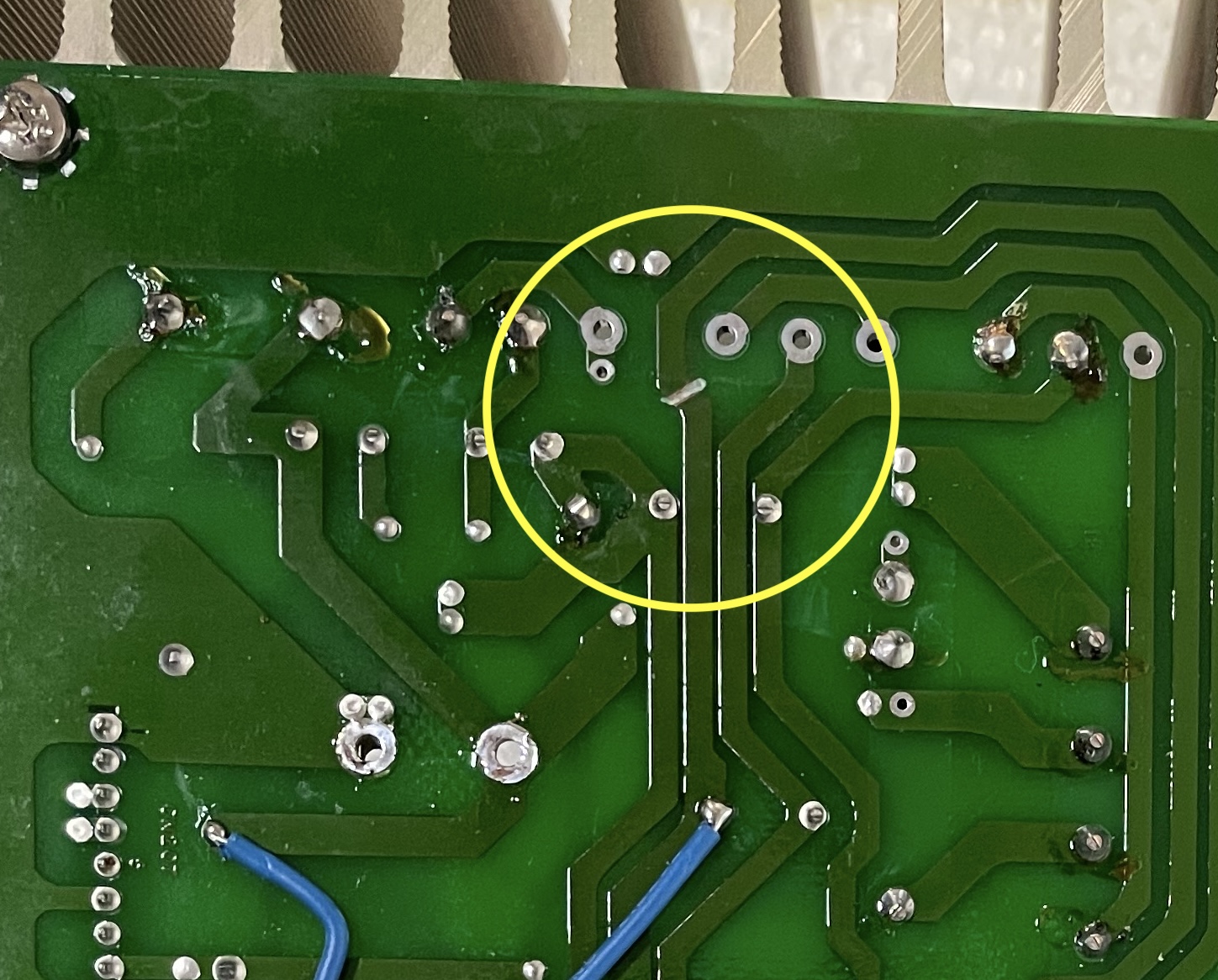 - a trace has been manually cut and there is a wire bridge to the test point. See image power_board_bottom1.jpeg and power_board_bottom1_zoom.jpeg .