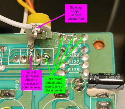 We are going to use the input switching voltage for blanking. The switching voltage is 12v and is routed through the physical switch on the front of the monitor back to the input board NAND gate. It is very low current and trying to draw from it improperly will result in your sync input not working anymore because the NAND logic will fail. So we need to take our very small blanking voltage and no more, no less :) We are aiming for ~0.8v and will use a potentiometer to do it.
