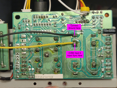 Sync must be injected to one of the video inputs on the video input board. If you are following my instructions for Input B as the RGB input, you'll want to attach sync to "CVBS In 2" on the input board as shown in the following image. If you are using Input 1 or Y/C then adjust accordingly.