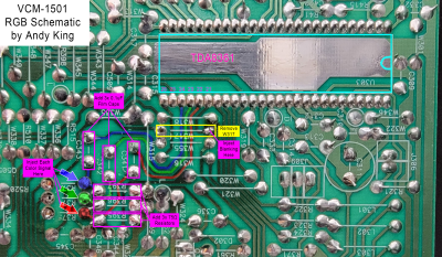 This CRT uses the excellent and easy-to-mod TDA8361 jungle chip. To do the RGB mod we need to inject terminated rgb signals to Pin 22, 23, and 24 of the jungle... conveniently there are already pads for your 0.1uF coupling capacitors and 75ohm termination resistors so we will use those.