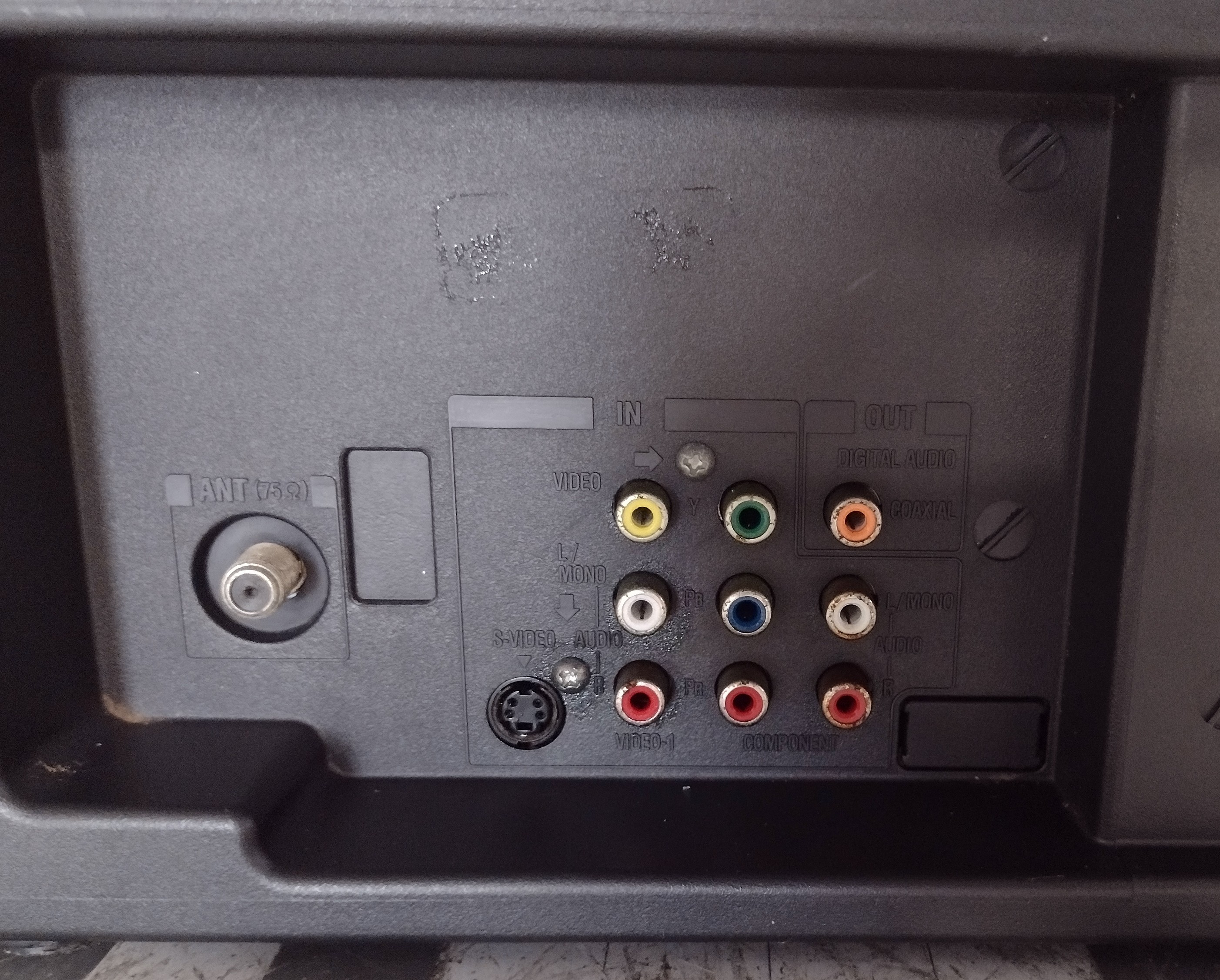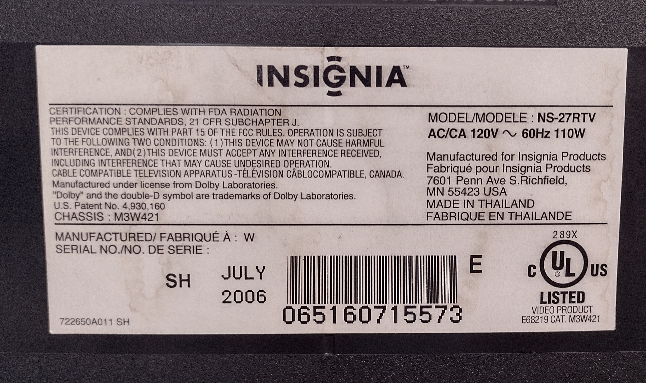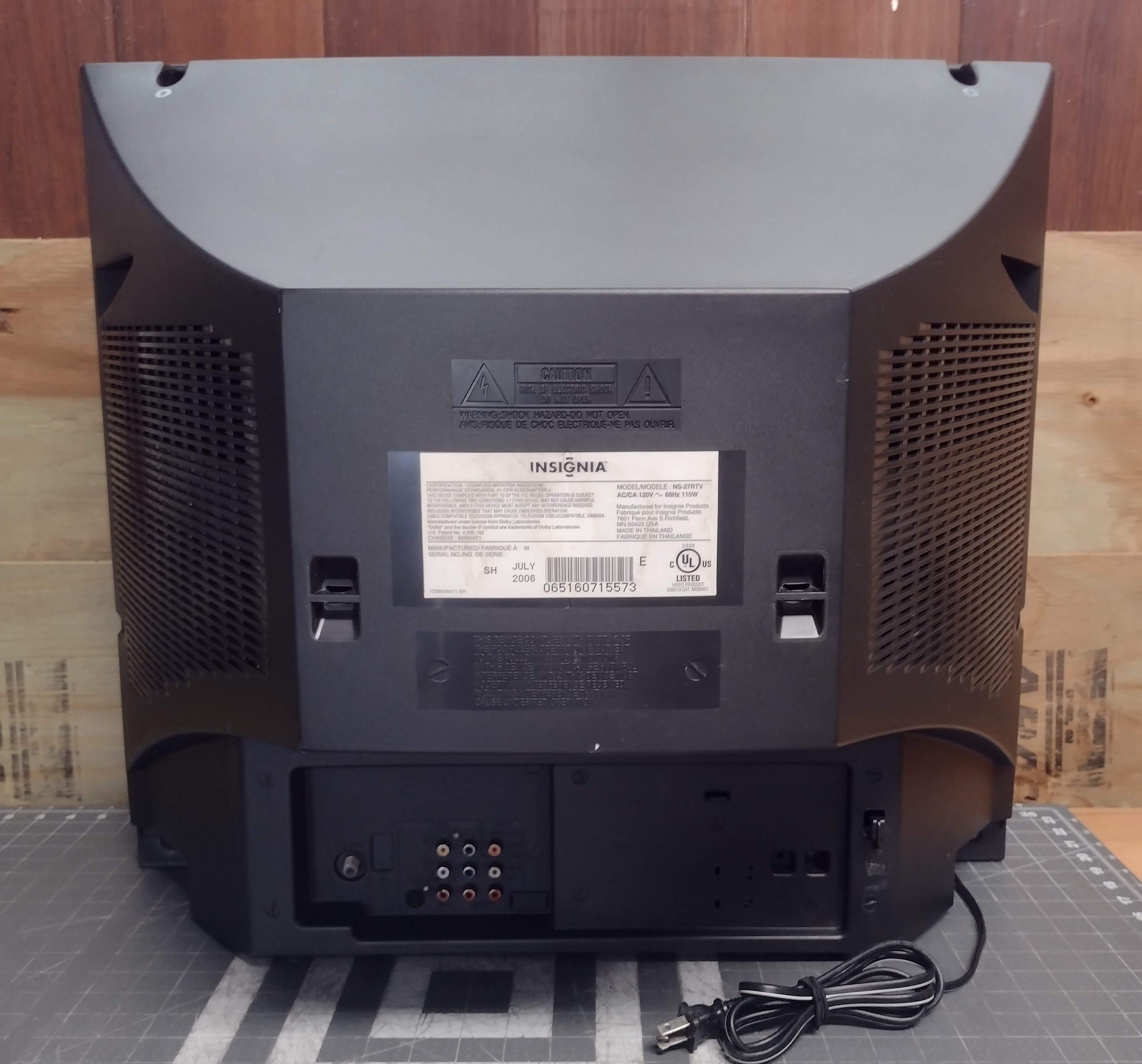 Late model 27" SDTV, manufactured by Orion and sold by Best Buy under their "Insignia" brand. Features a full set of inputs, including Component and S-Video.