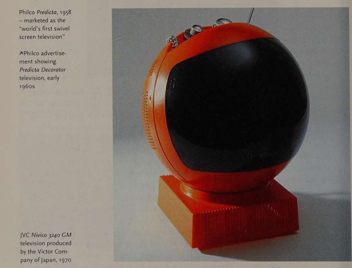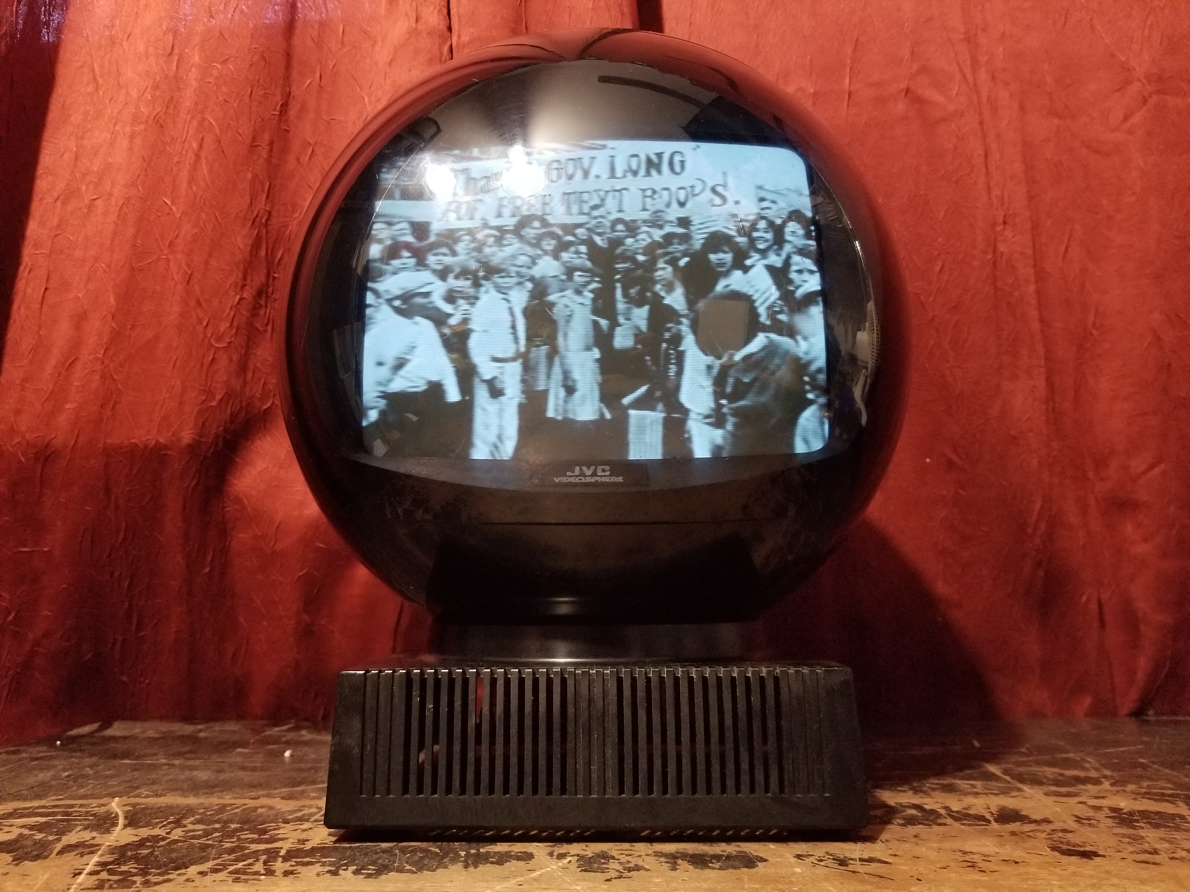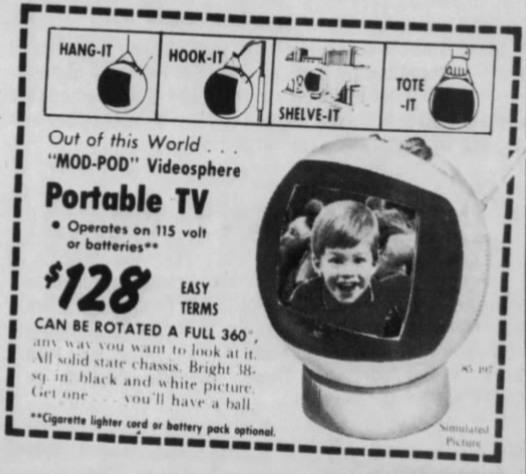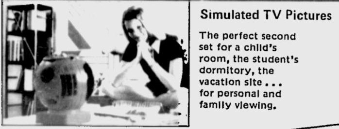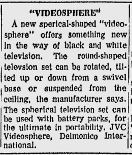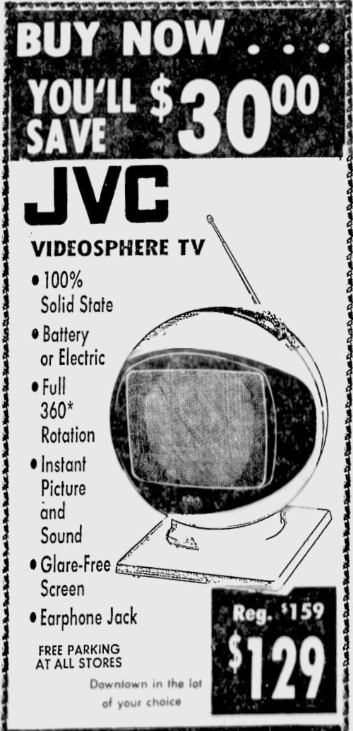 Meet JVC's Videosphere. A ball to watch. The personal, portable TV that goes anywhere. Swivels and tilts on its own base...or hangs like a mobile from its carrying chain to give you the best viewing angle from any position. Big 38 square inch (9-inch diagonal) glare-free screen for personal or group viewing. Sharp black and white 83-channel reception.