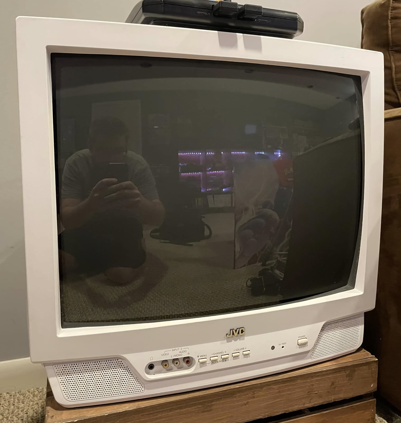 Basic white 20" consumer TV from JVC, with stereo audio and composite inputs. Made in Mexico in 2002.
