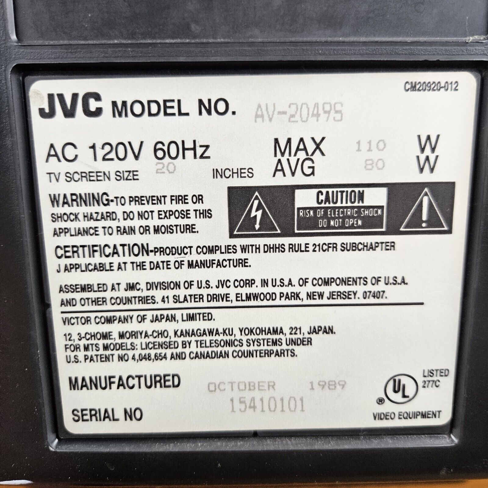 A higher-end 20" set by JVC, released in 1985. Has RF composite, and digital RGB input.