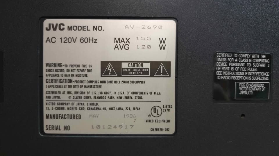 A higher-end 26" set by JVC from 1985. Has RF composite and digital RGB input. Assembled in the US from domestic and Japanese components.
