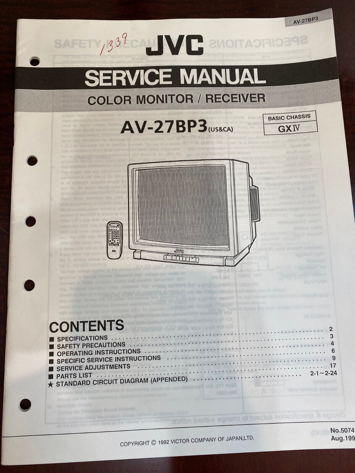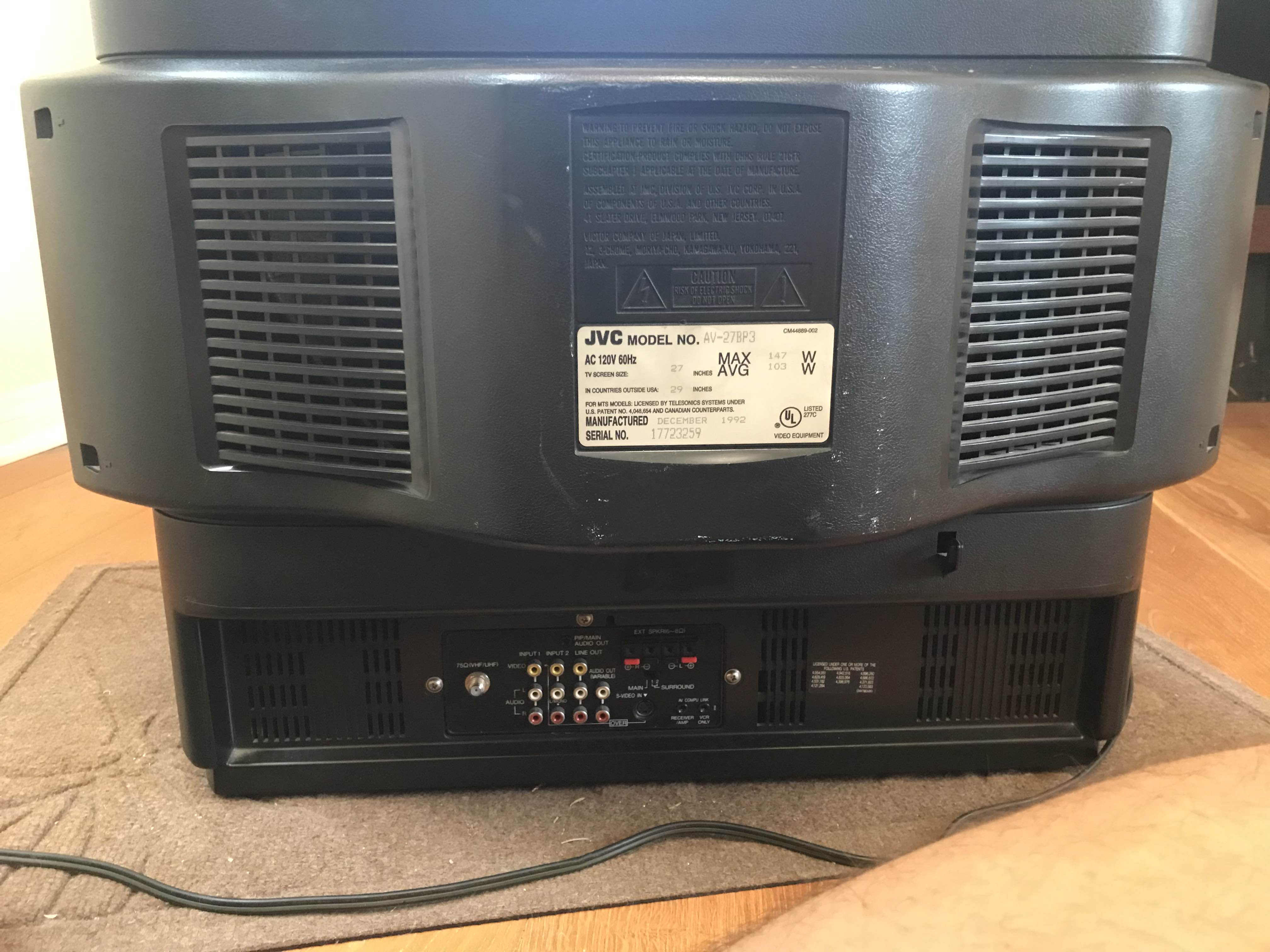 A higher-end 27" set by JVC from 1992. Has RF, composite, and s-video input. Also has amped stereo surround channel outputs.