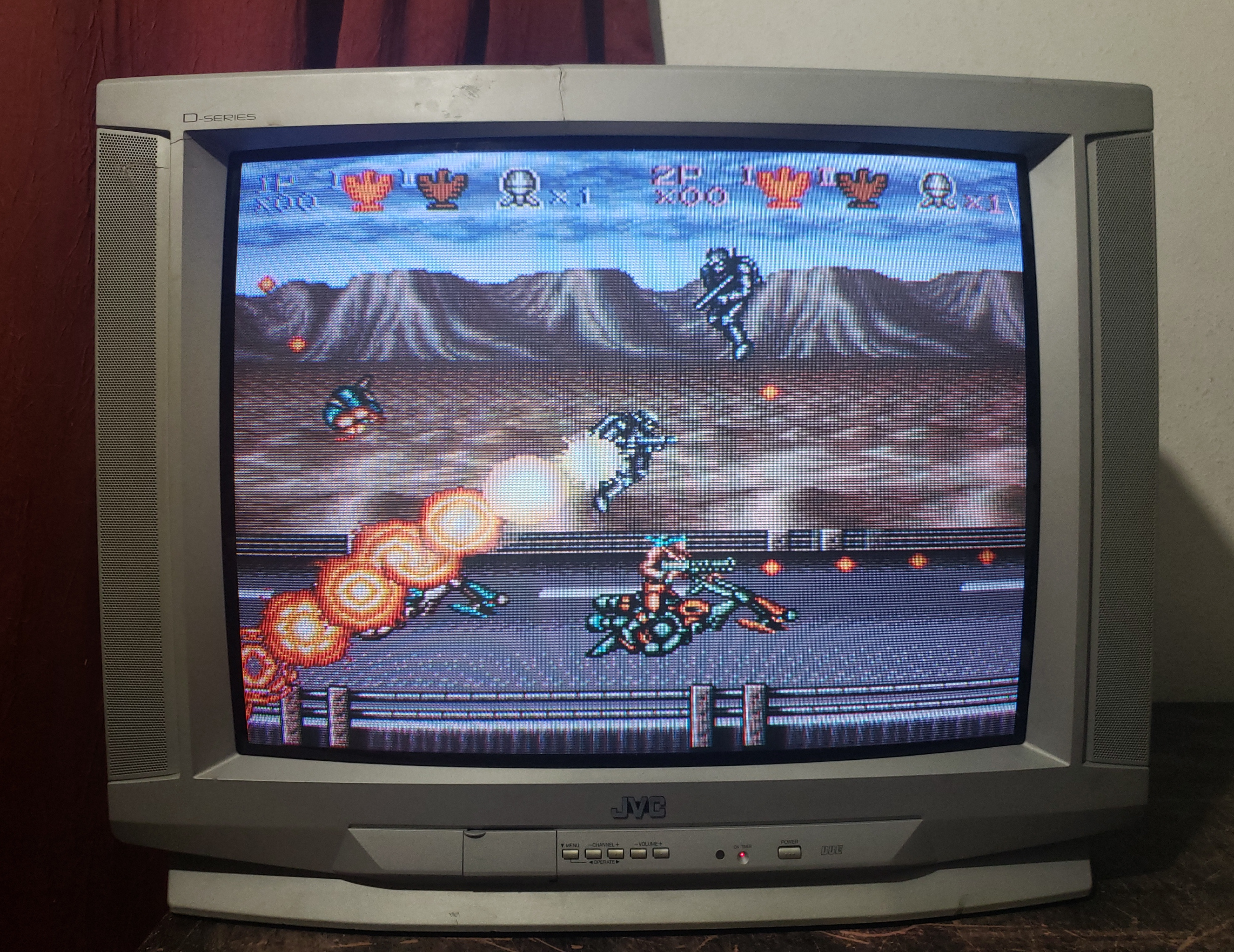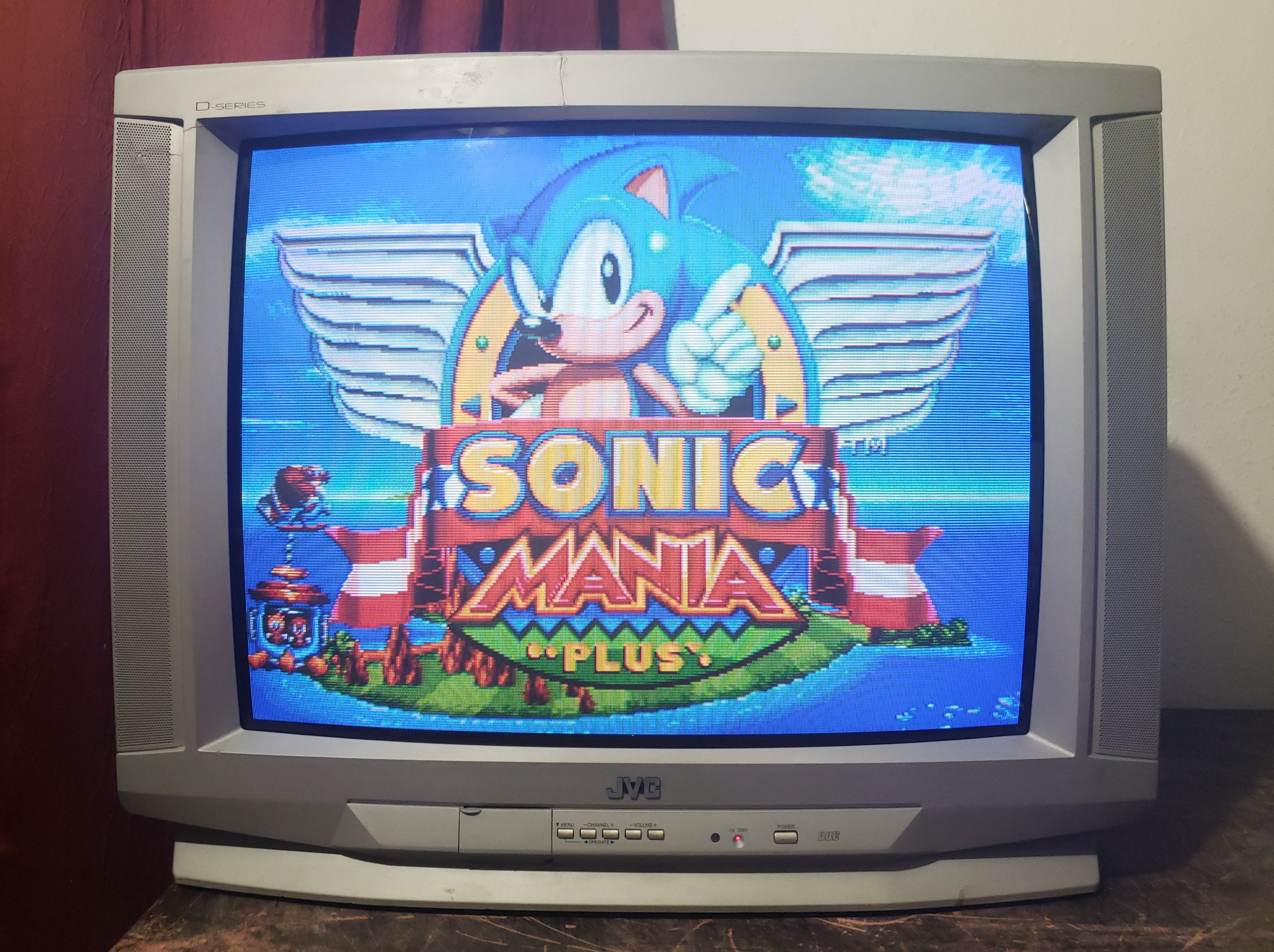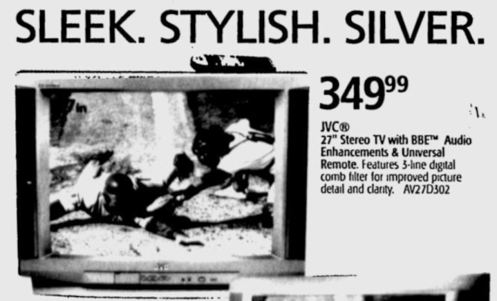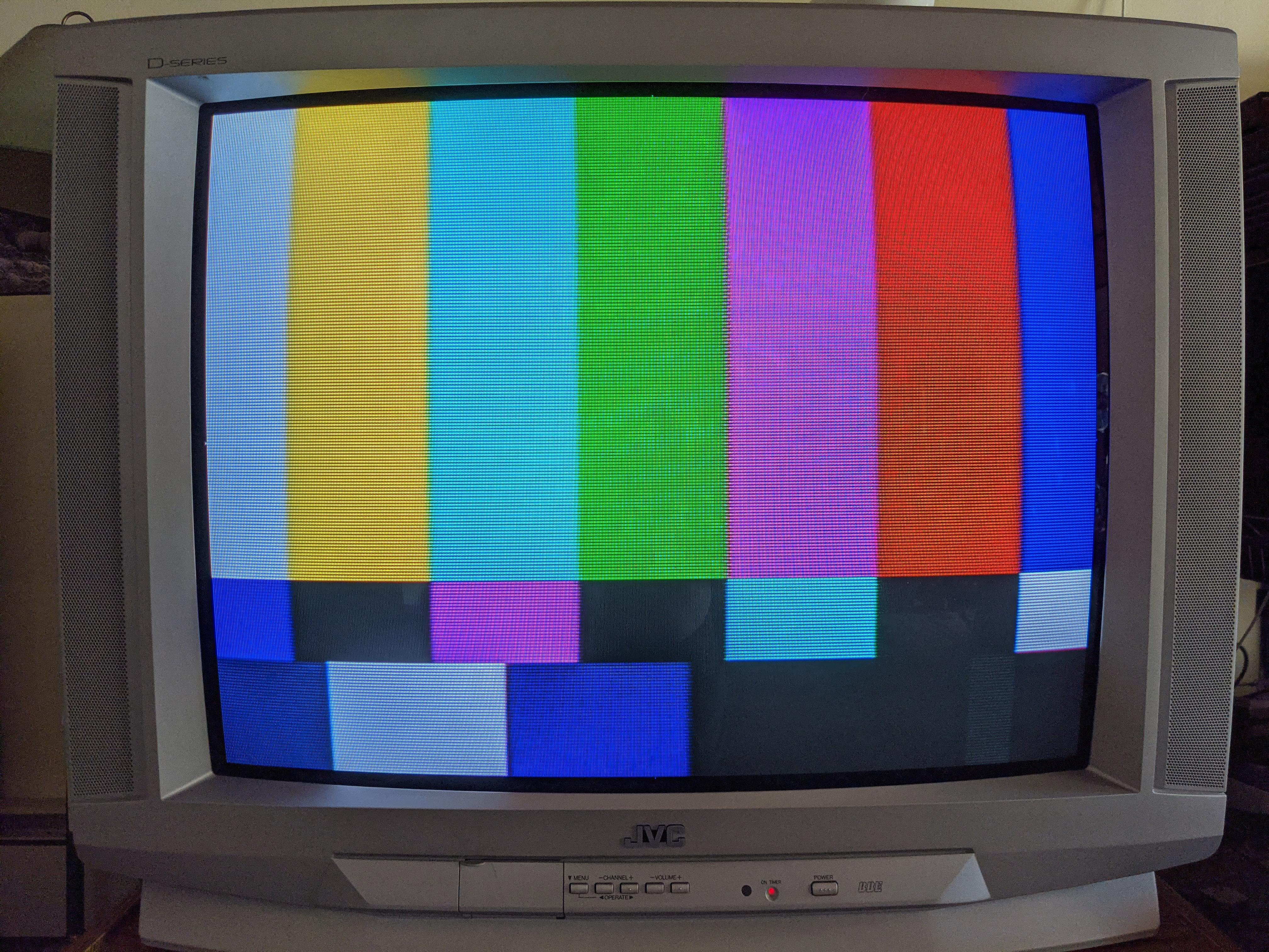 27" silver curved consumer TV from JVC, part of the D-Series line from 2001. Uses a Toshiba jungle IC which can be tapped for analog RGB.