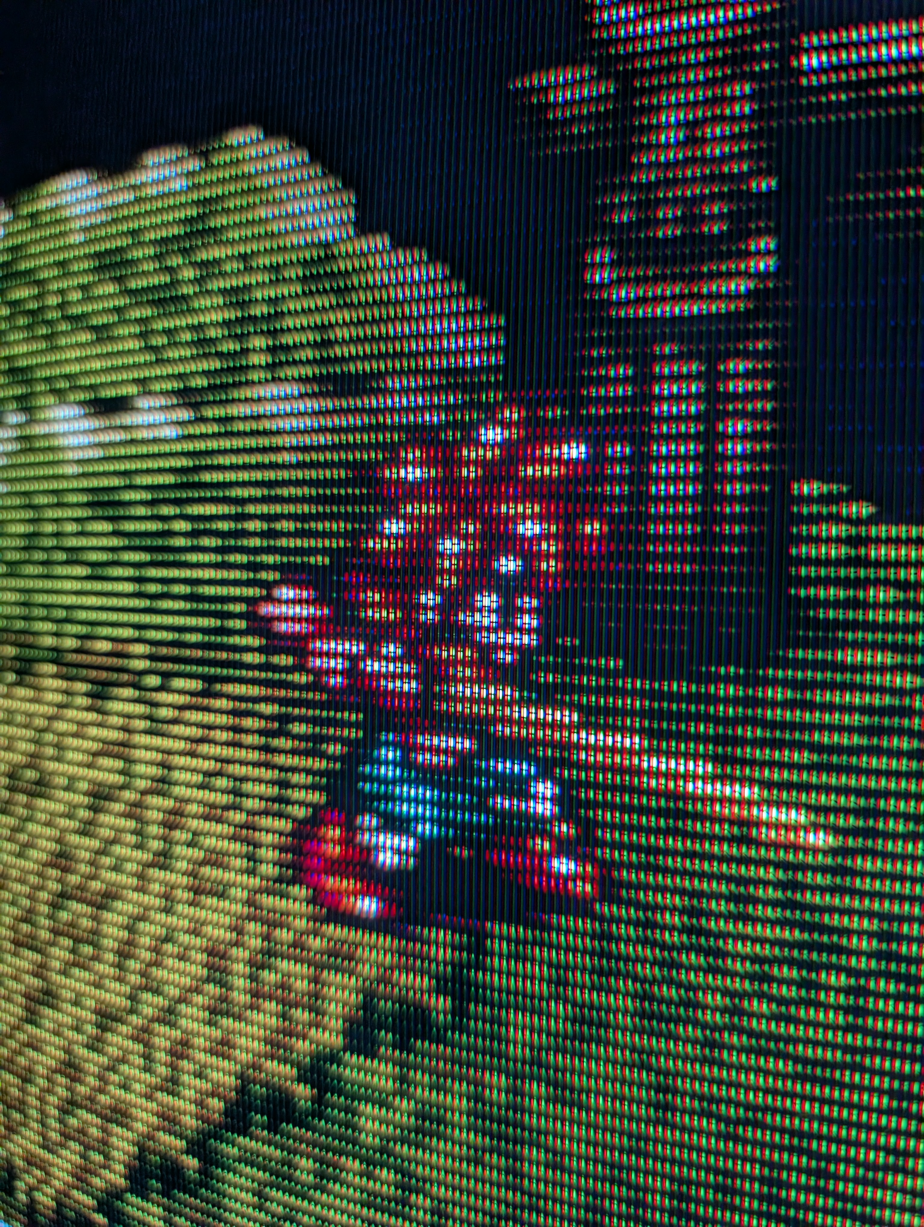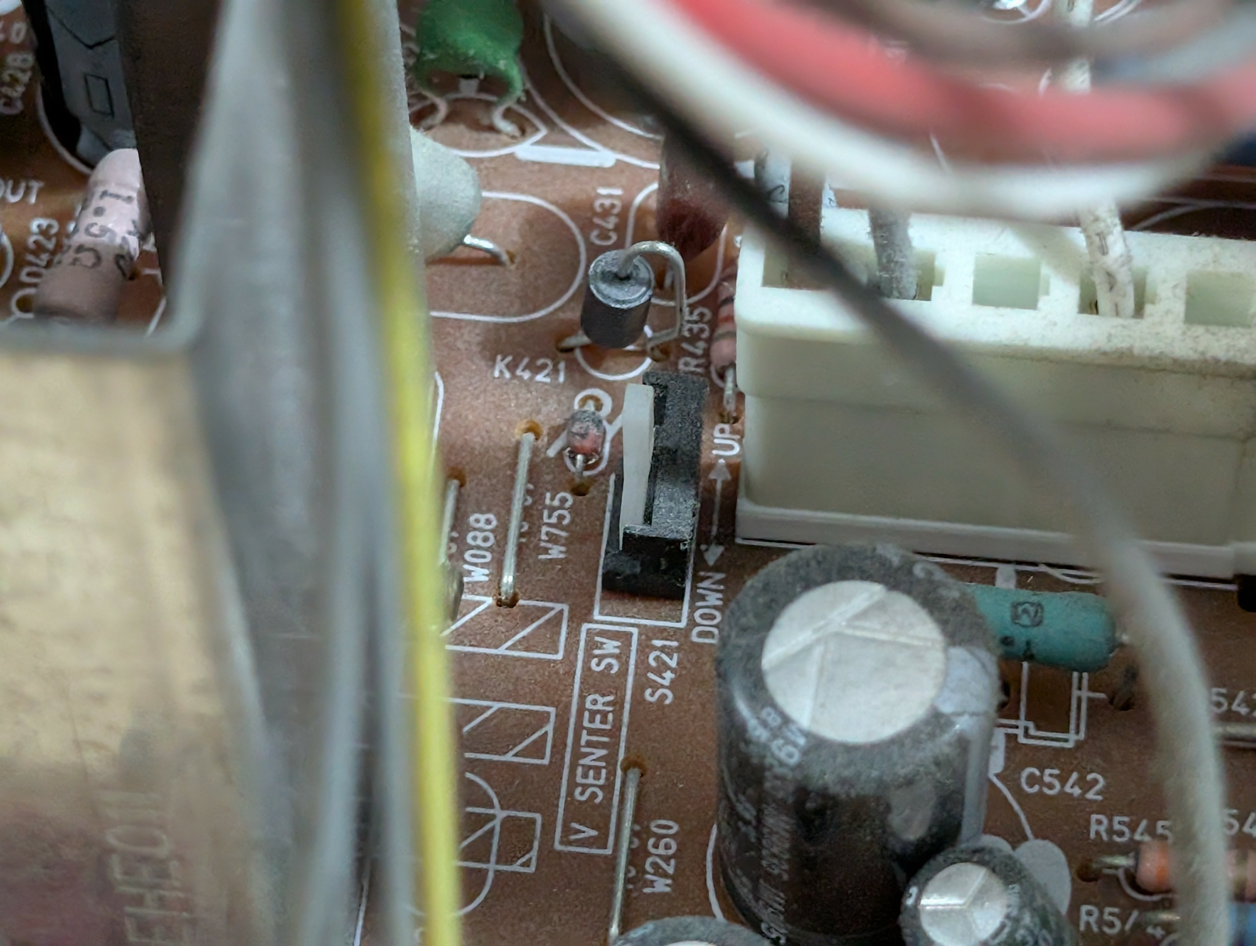 Picture tube is an RCA-Thomson model used in other higher-end TV sets and arcade chassis of the day. It is a VHP model with a finer dot pitch, flatter curvature, better focusing method, bonded yoke, and a single magnetic sheath on the neck for convergence. It is a significantly better tube than the RCA-Thomson's A68ADT25X tube that came in later JVC models, and it doesn't suffer from the edges of the screen losing focus due to use as severely. Unfortunately, horizontal linearity leaves a bit to be desired.