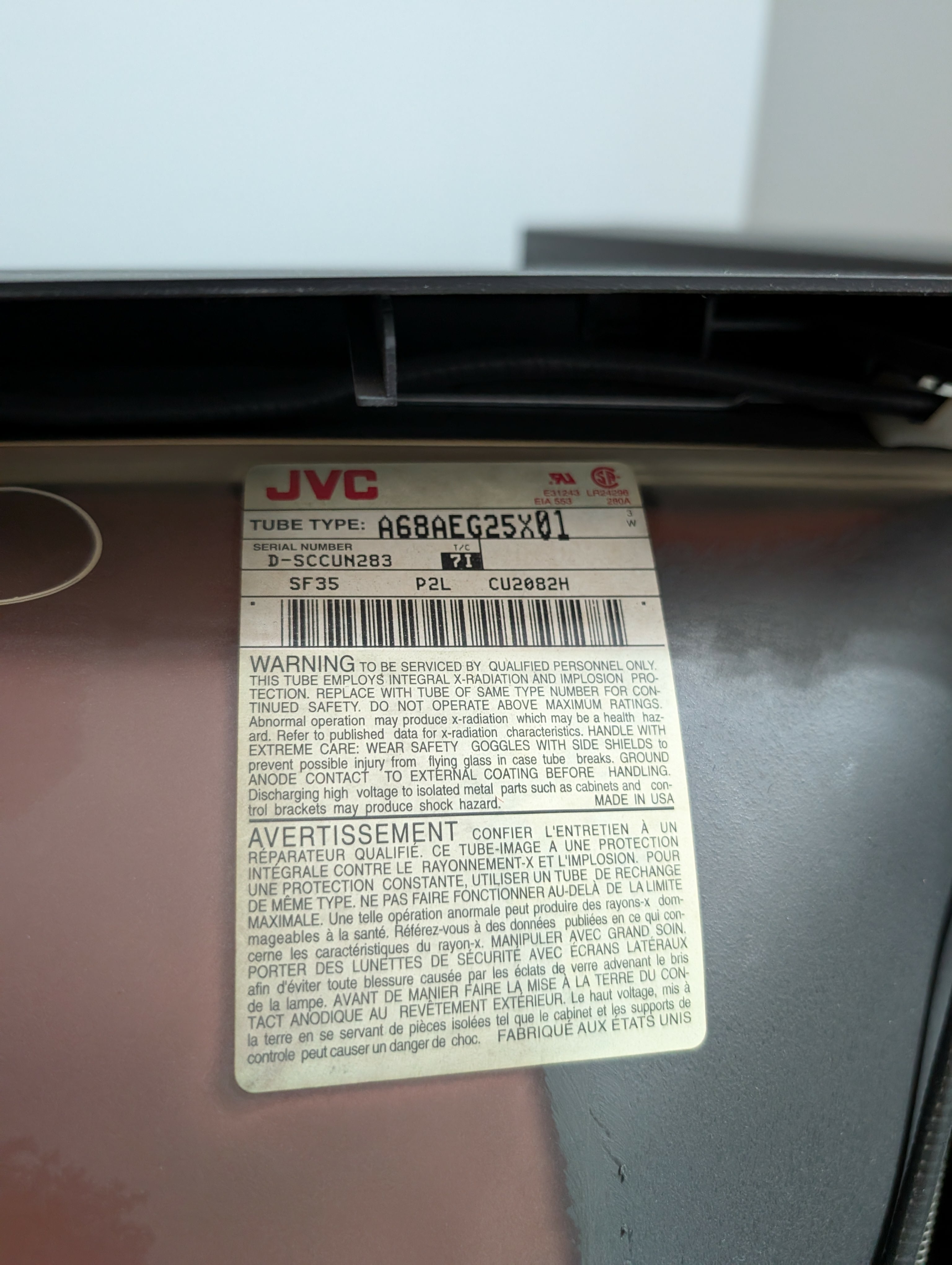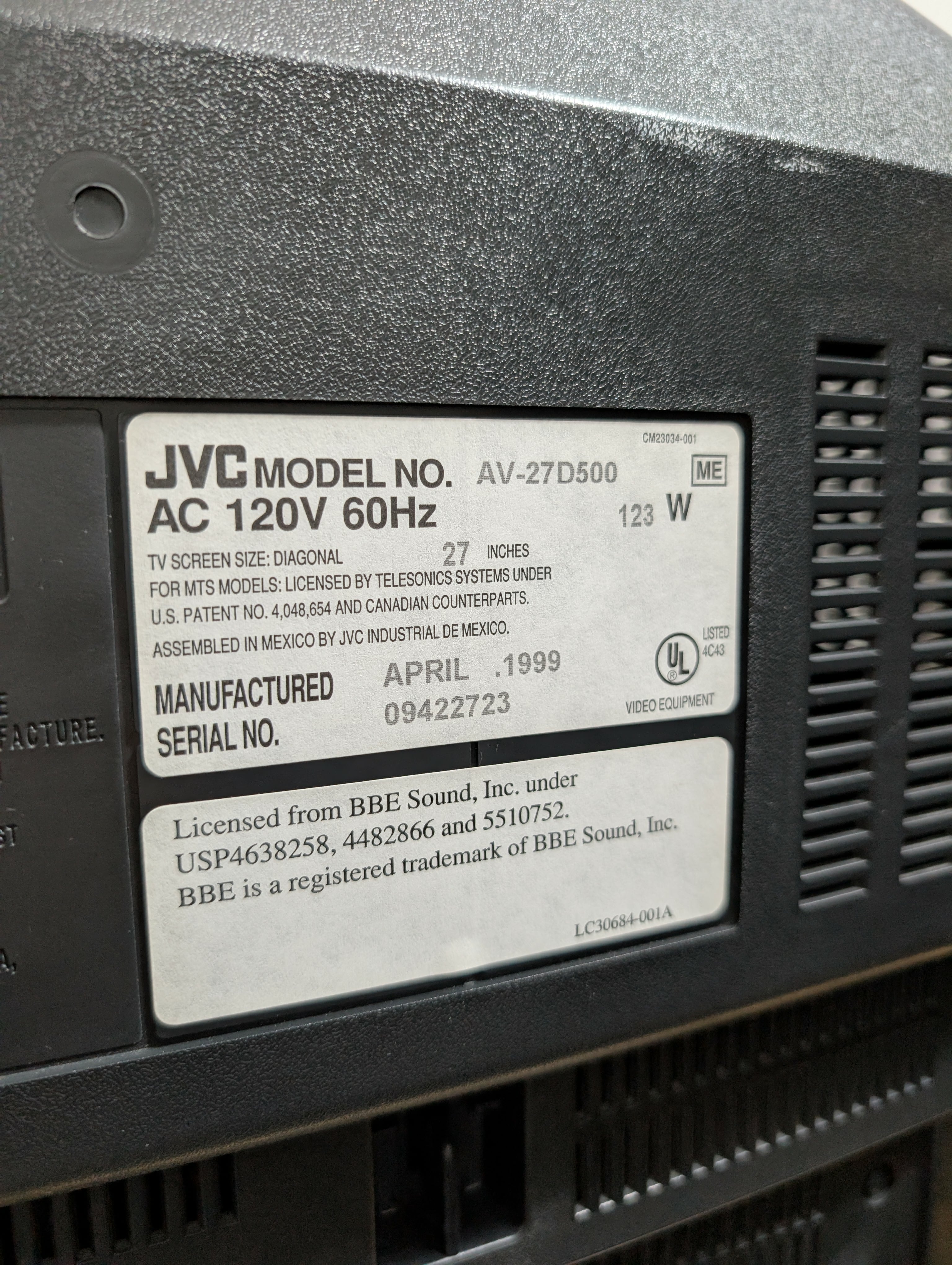 27" JVC D-Series, one of the very first models released in 1999. Has a full set of inputs: RF, composite, s-video, and component. Made at JVC's Tijuana, Mexico plant.