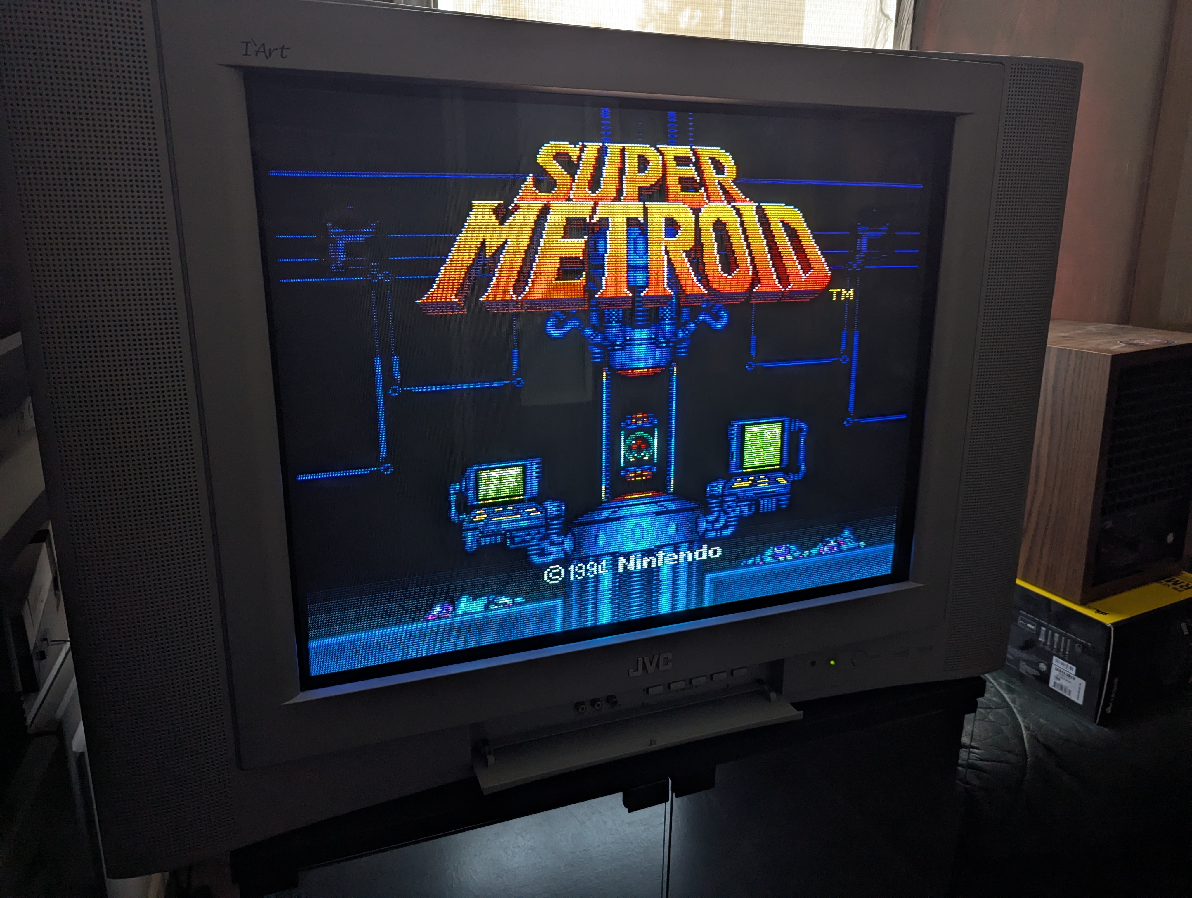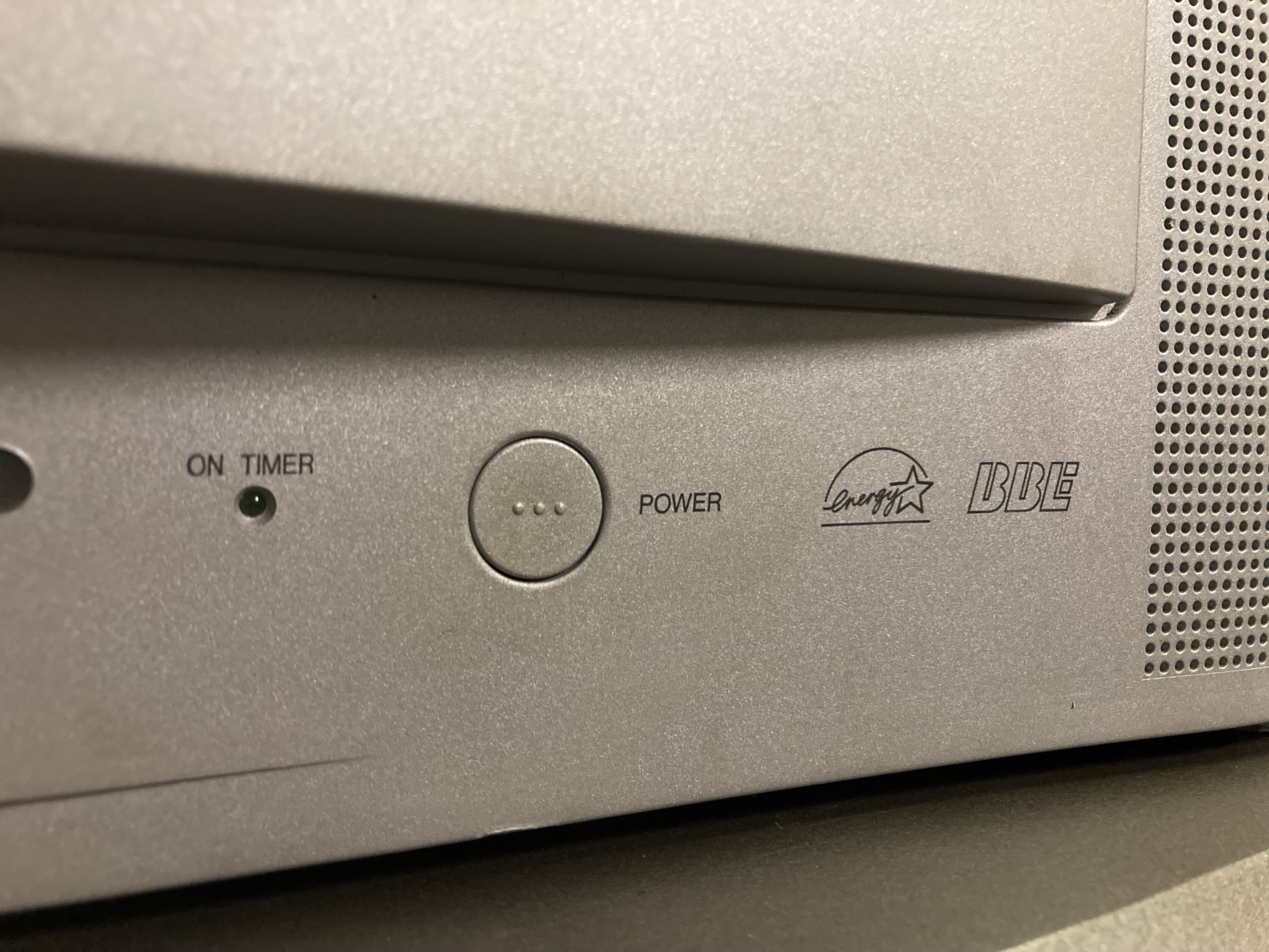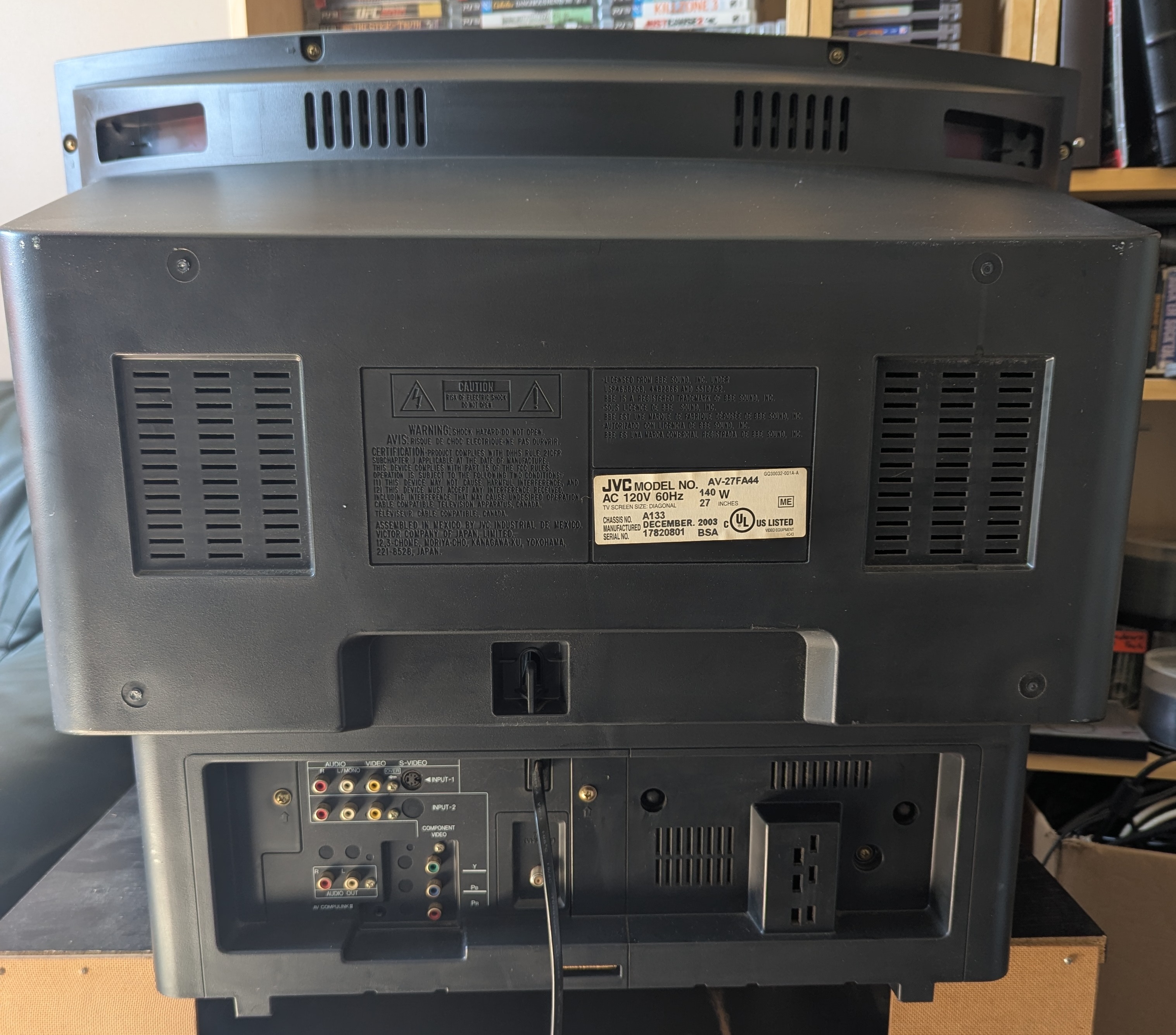27" flat CRT by JVC. Has a full set of inputs. Originally manufactured in Mexico in 2003.
