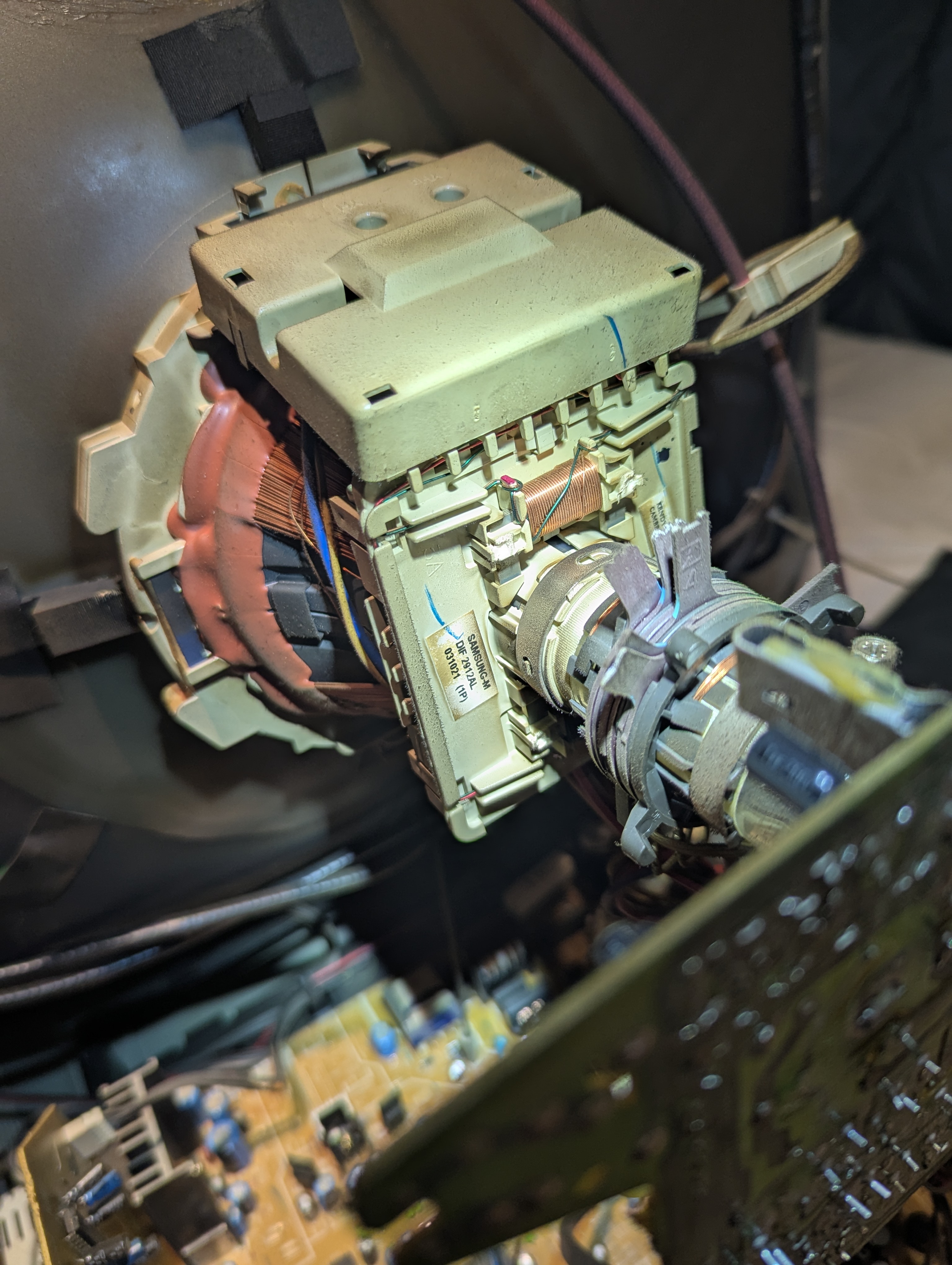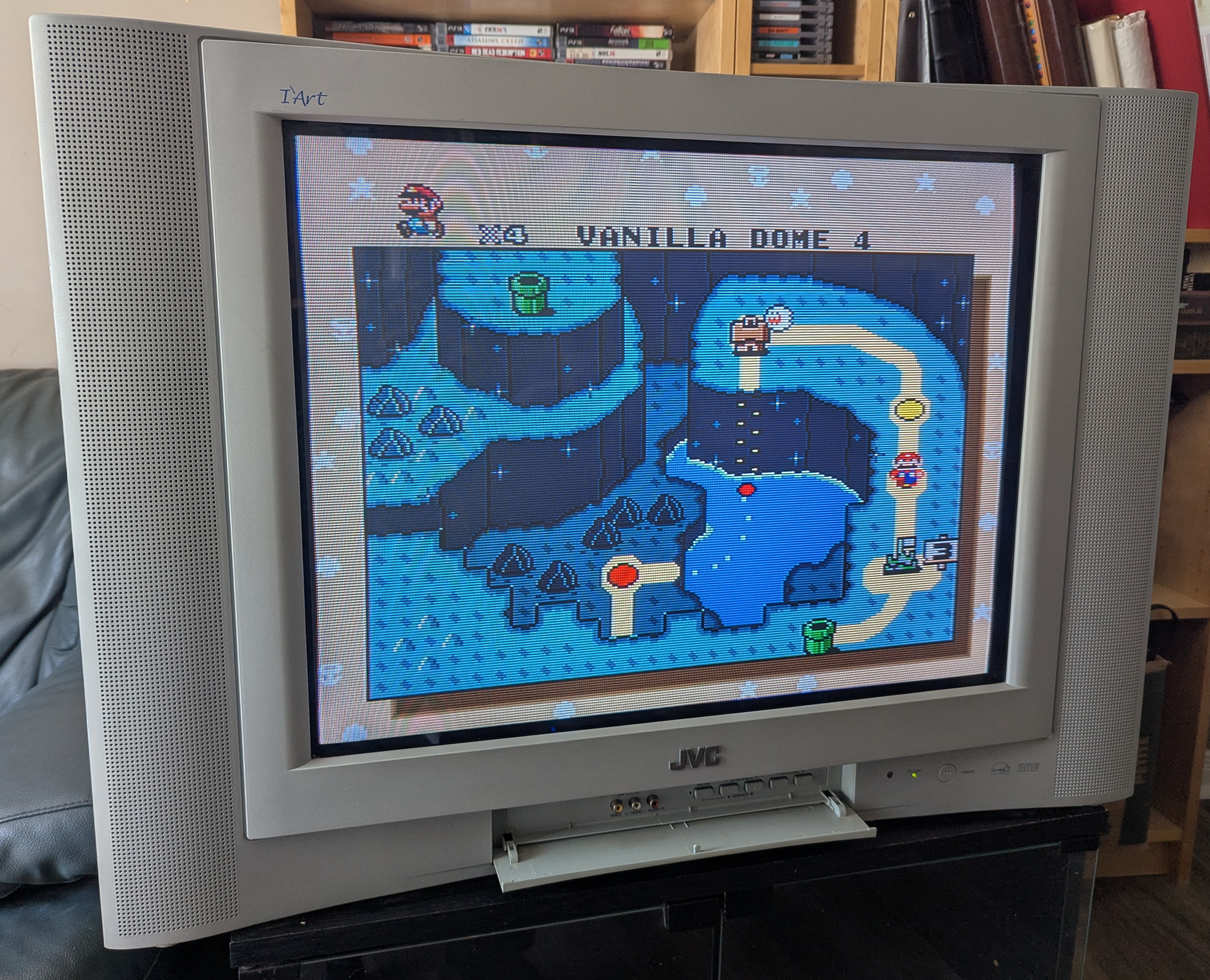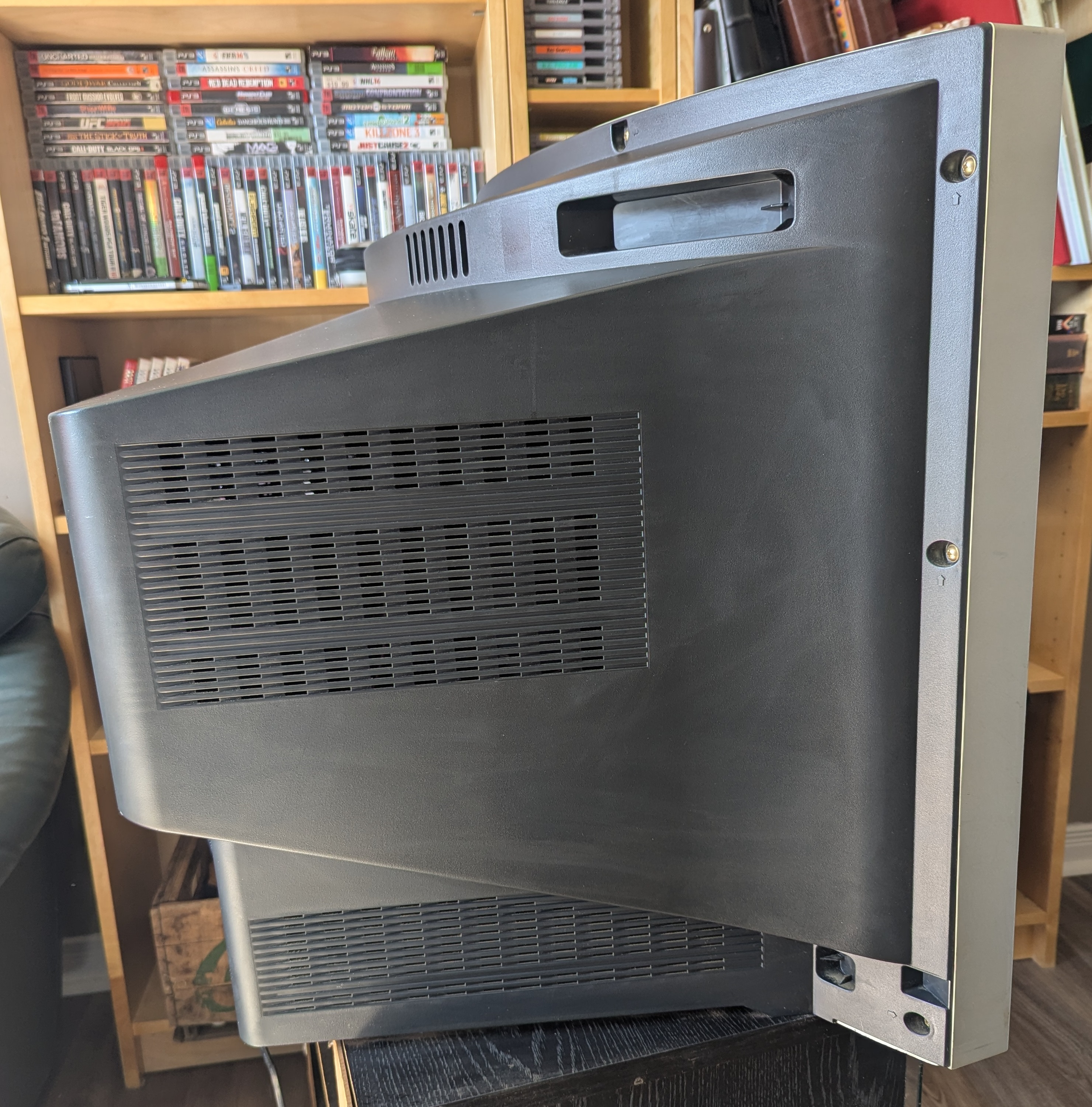 27" flat CRT by JVC. Has a full set of inputs. Originally manufactured in Mexico in 2003.