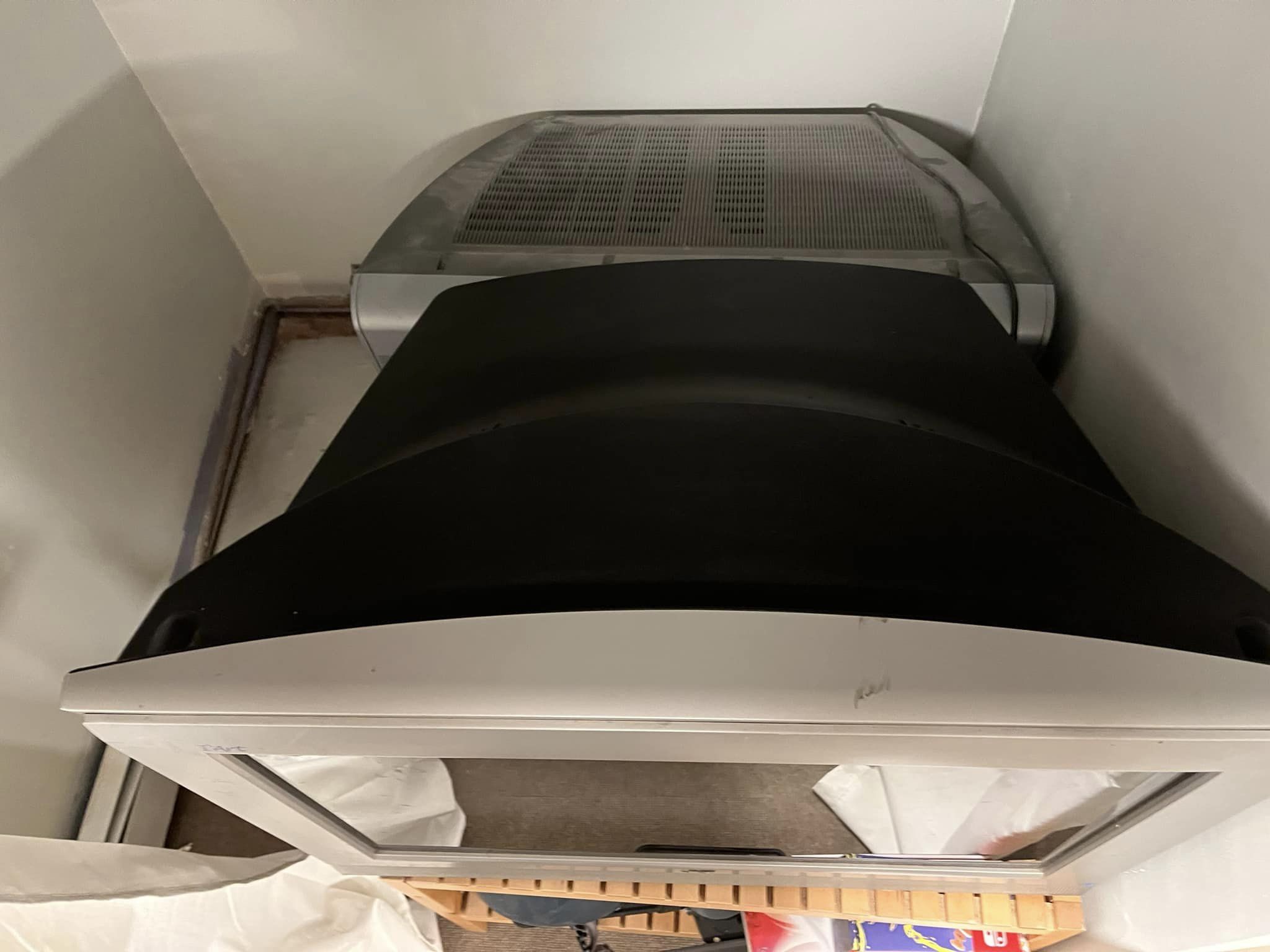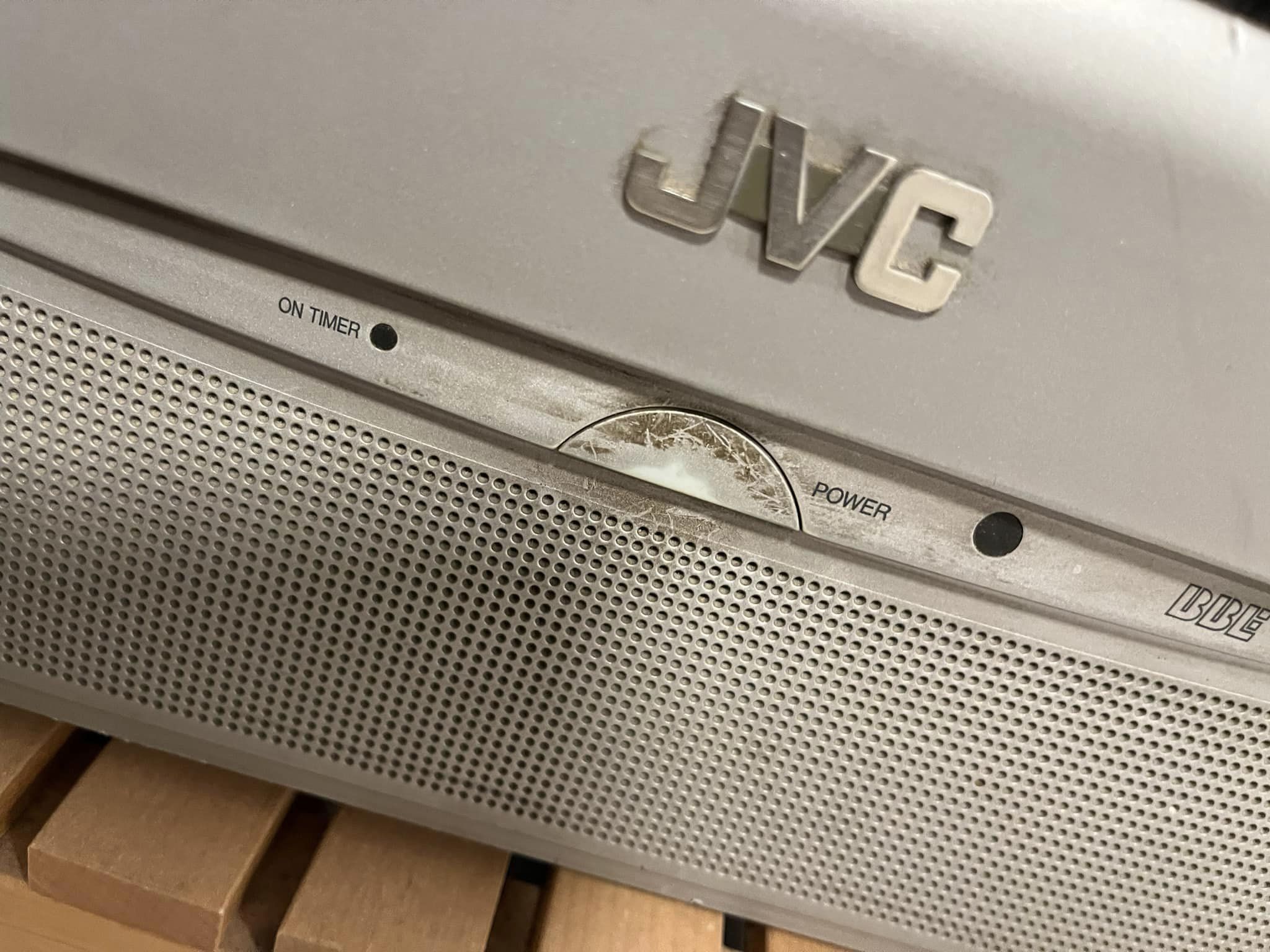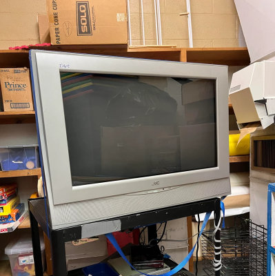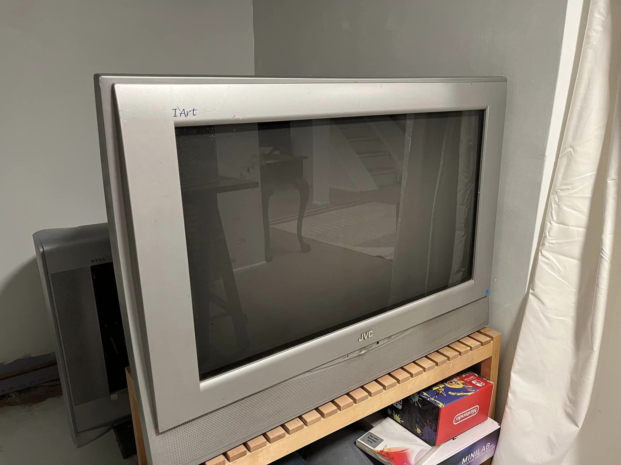 30" widescreen standard-definition CRT by JVC. Has a full set of inputs: RF, composite, s-video and component. A rare combination to see in North America. Manufactured in Mexico in 2004.