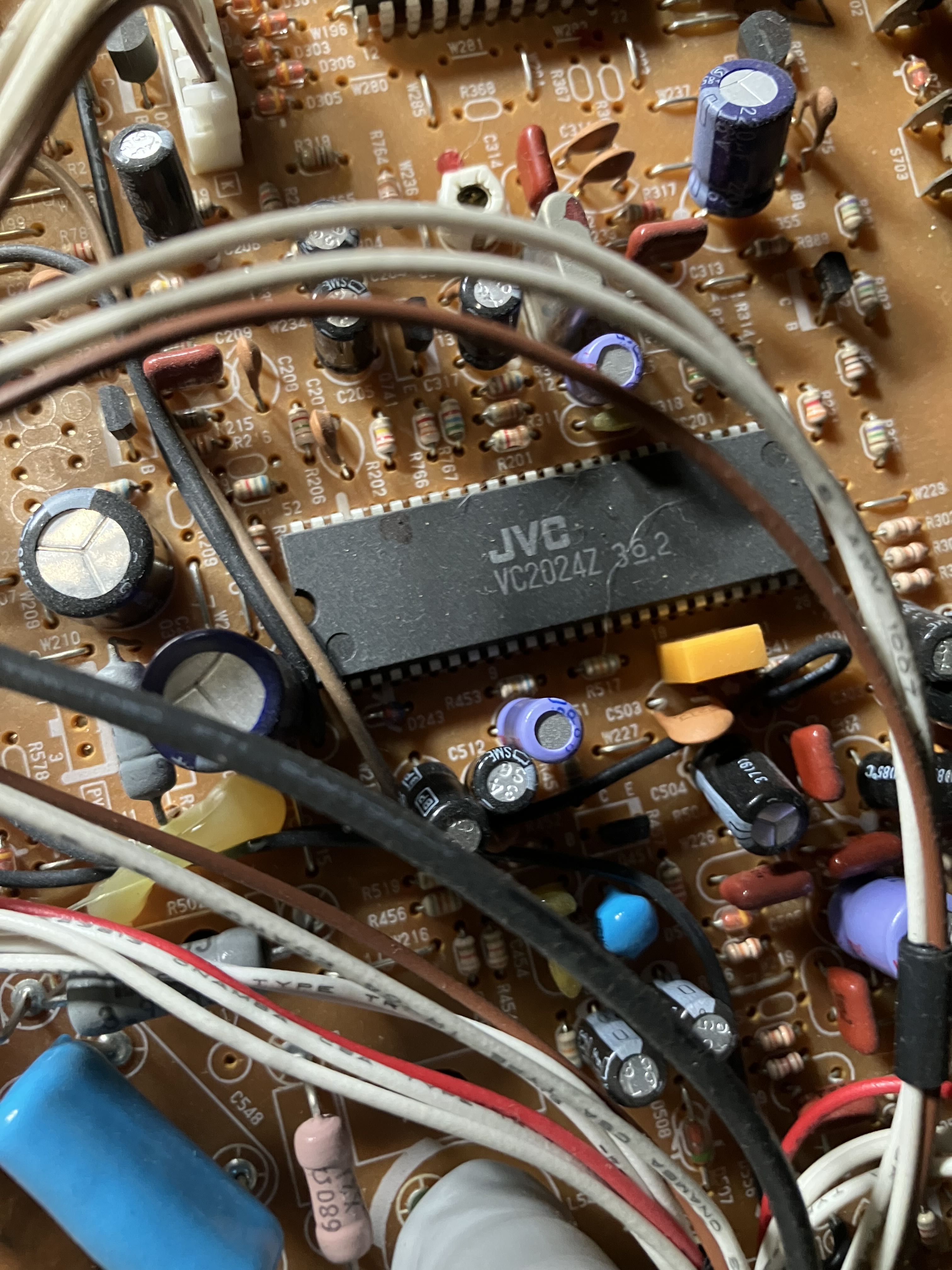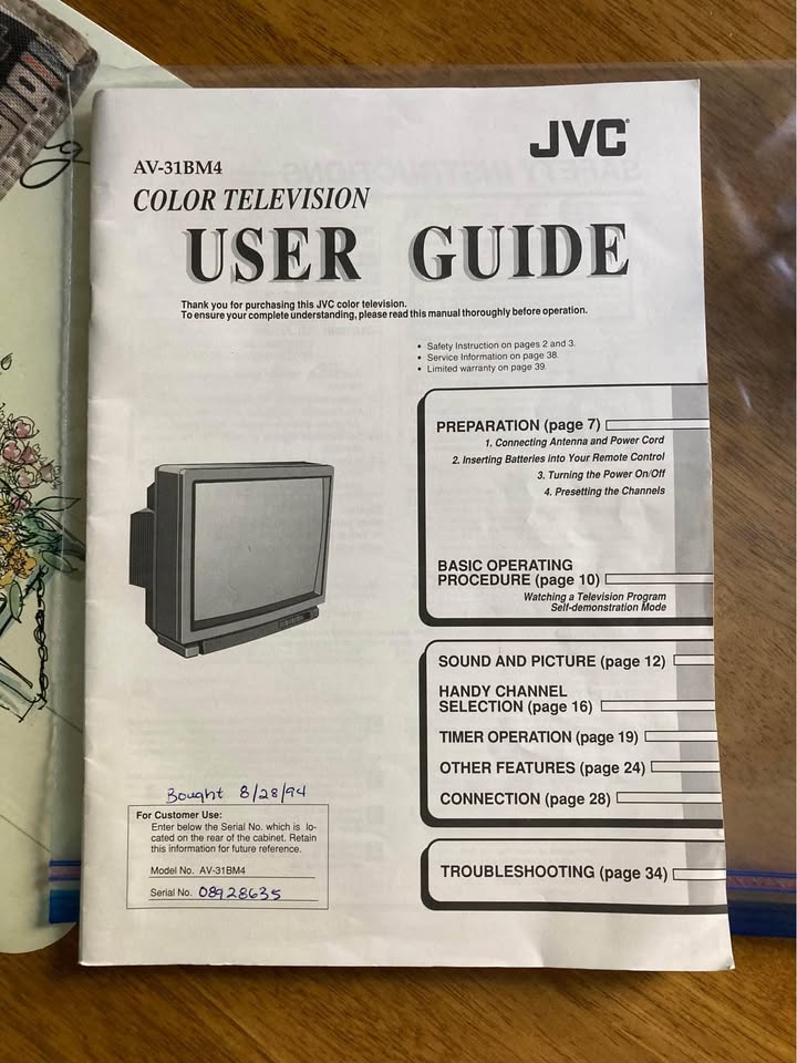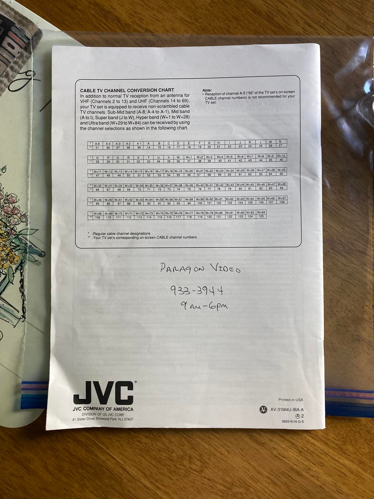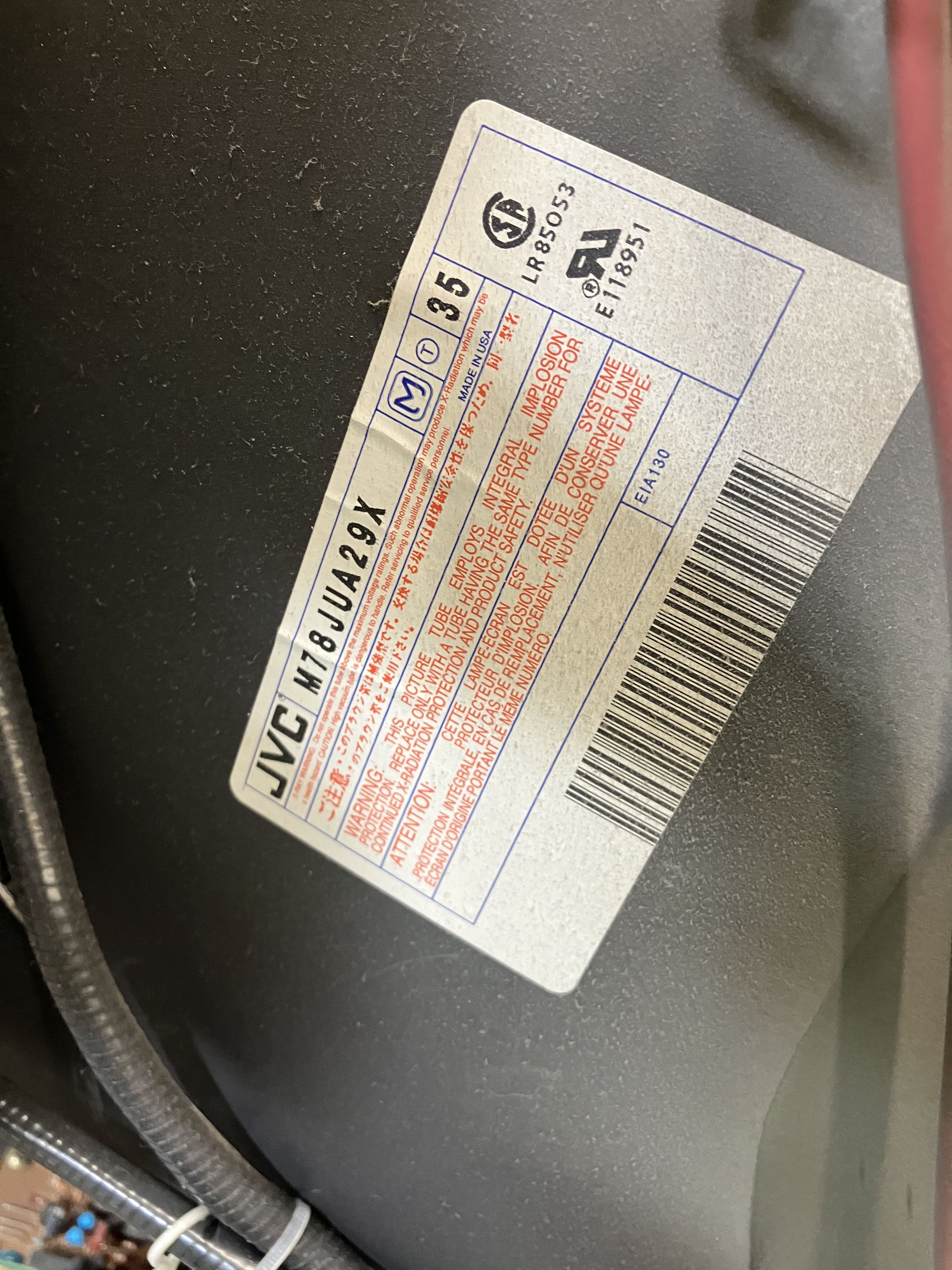 Higher-end 31" TV by JVC. Has RF, composite and s-video inputs. Assembled in the USA in 1993.
