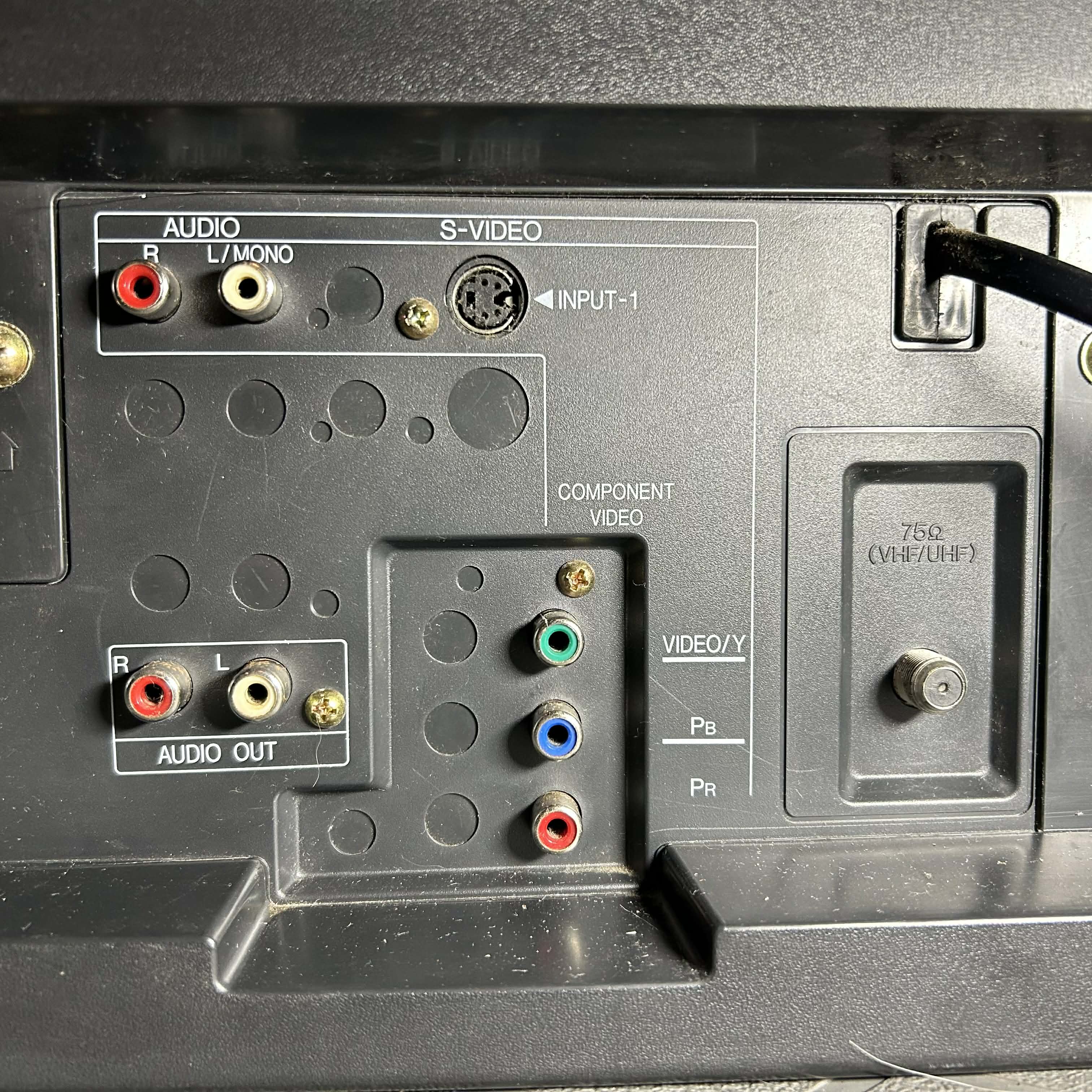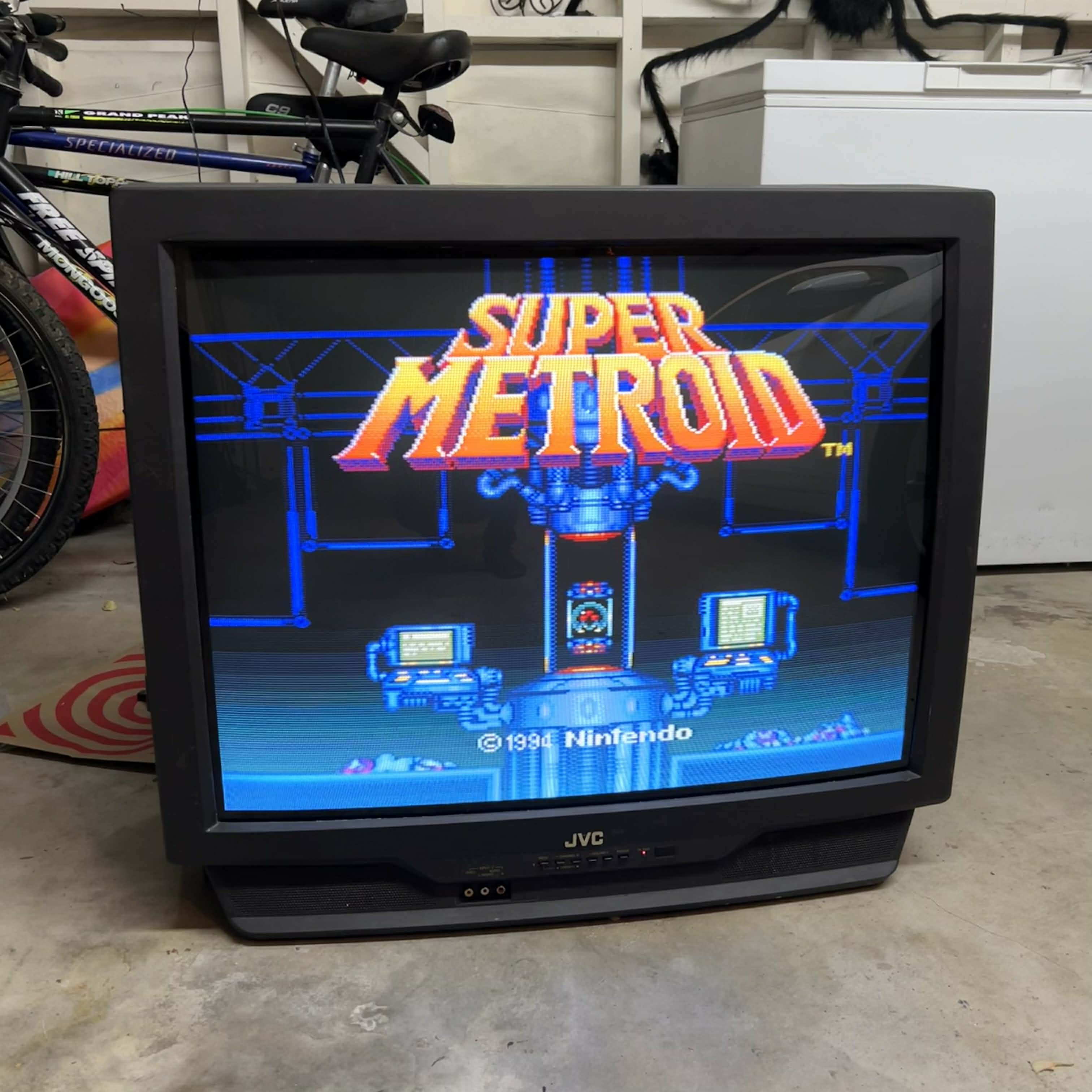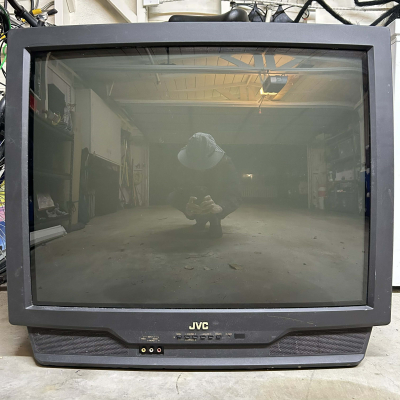 32" curved-screen CRT by JVC, made in Mexico in 2001. Has RF, composite, s-video, and component inputs with stereo sound.