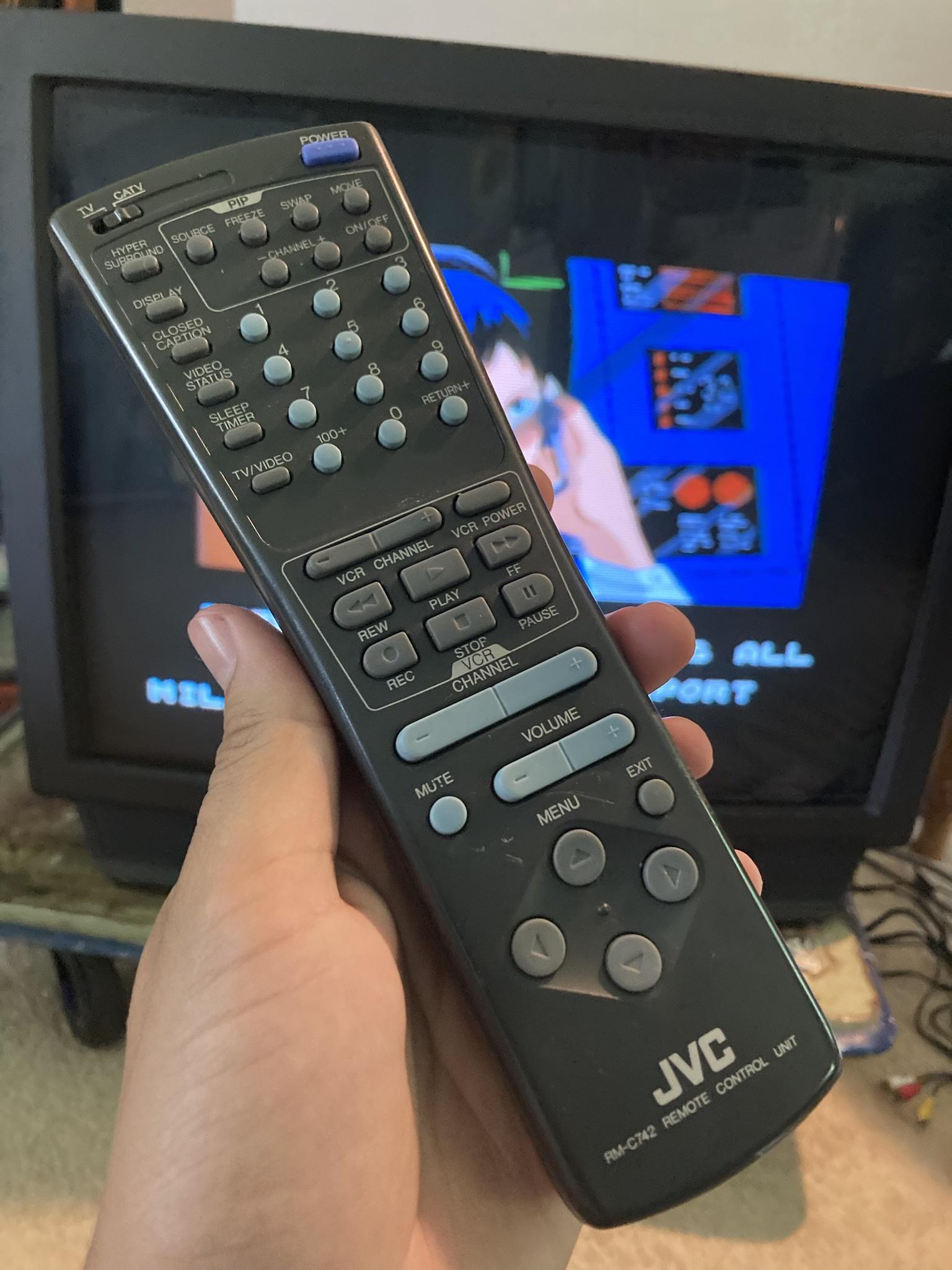 Mid-range 32" JVC TV from the late 1990s. 1997 was the year JVC established their longest-running design style for their standard CRT models, and this set is one of the very first. Has composite and s-video input. Picture tube is a common Hitachi model used in many other sets at the time, and it is a good one, all things considered.