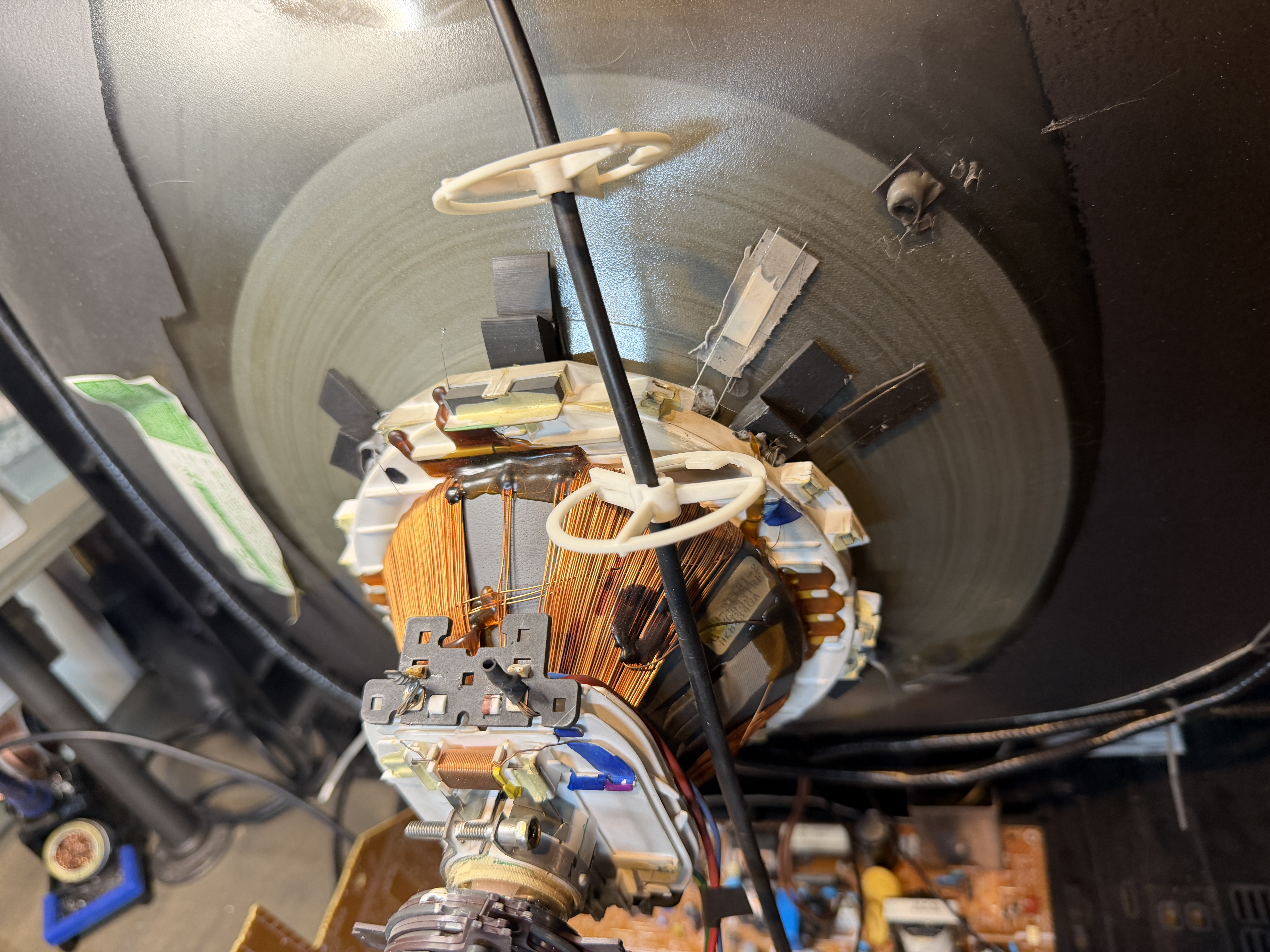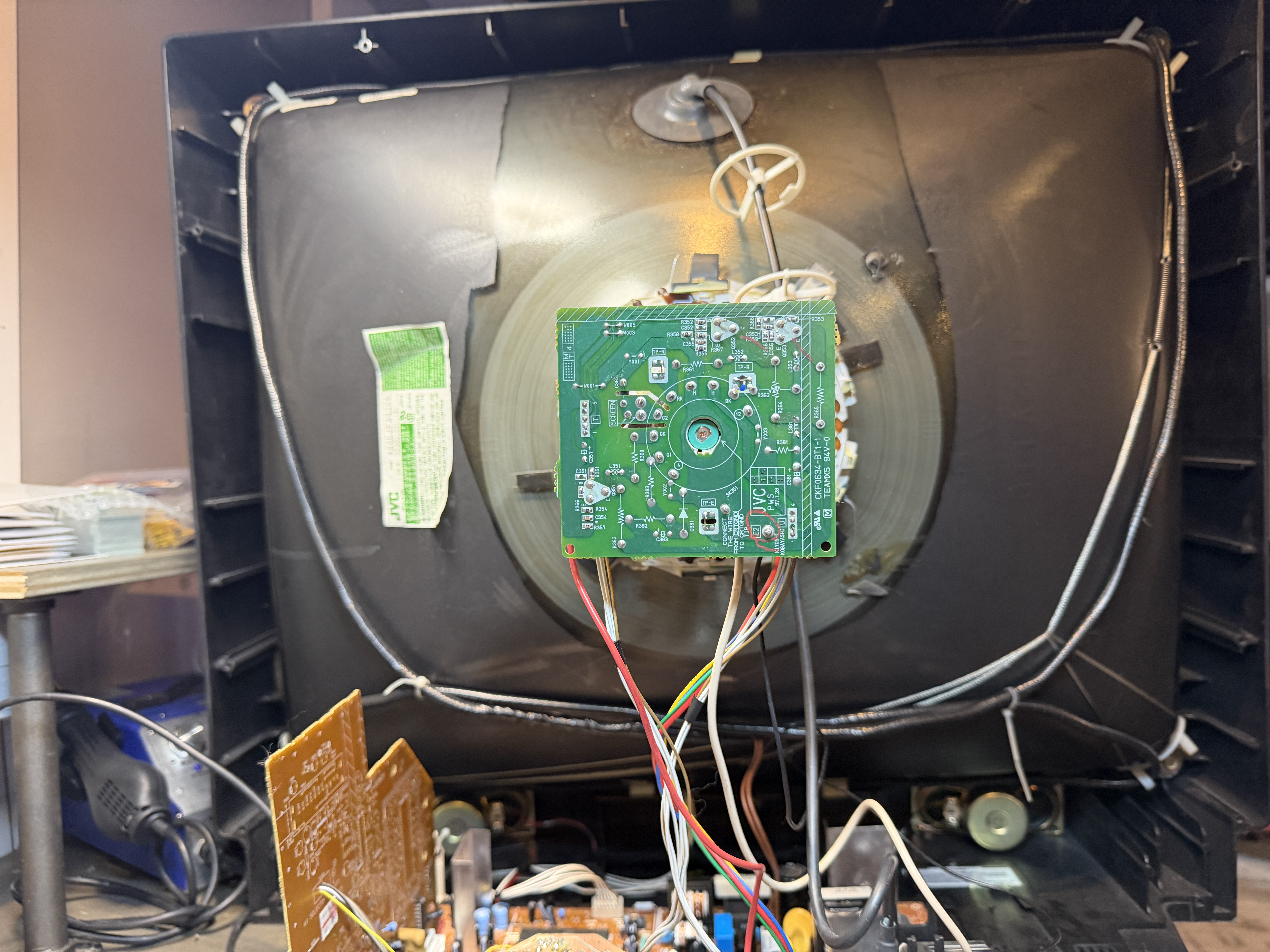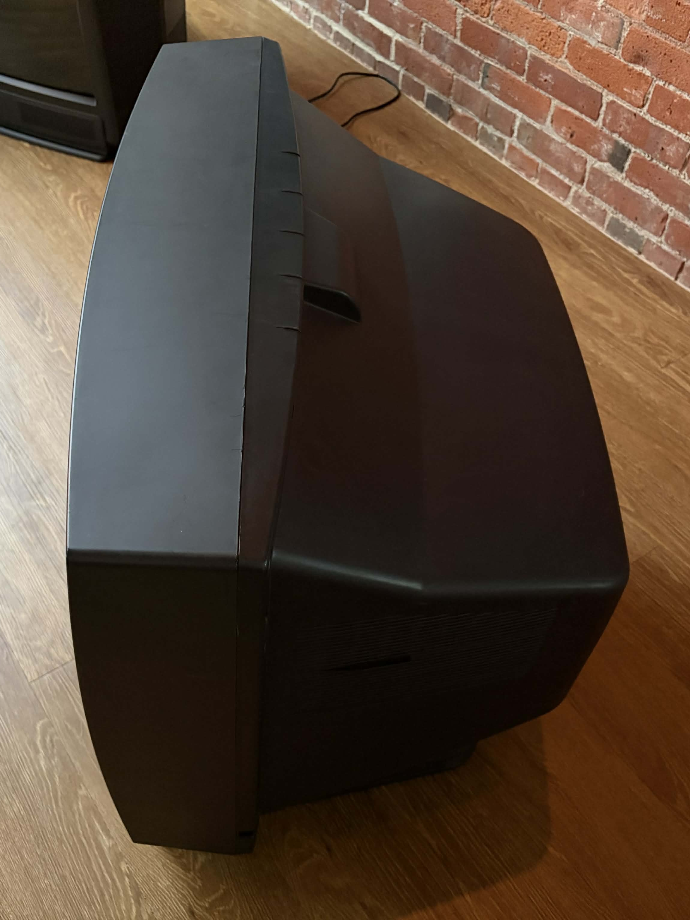 Midrange 32" CRT by JVC, made in Mexico in 1998. Has RF, composite, and s-video inputs with stereo sound.