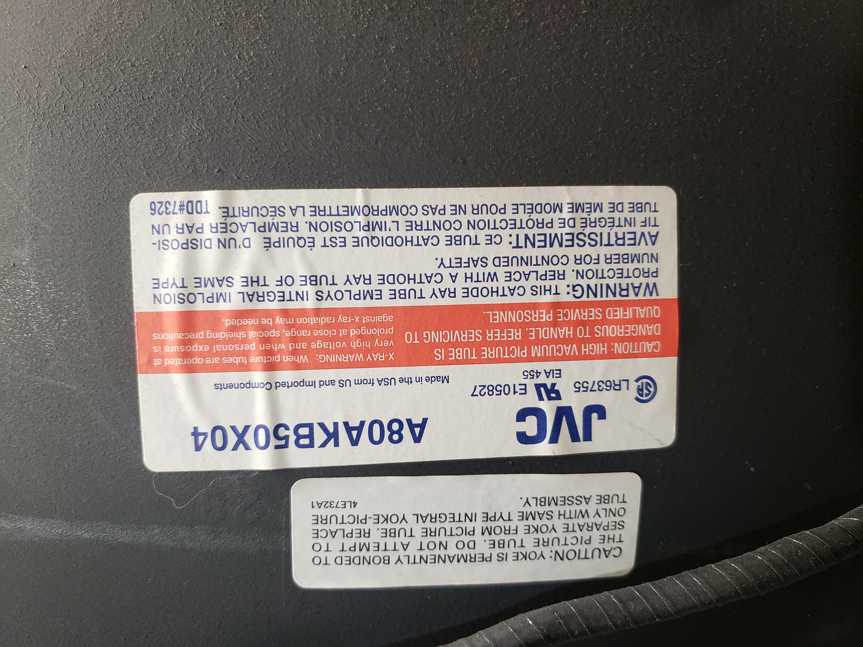 There were three tube models used in this set, and the letter beside the serial number designated who the tube maker was; Thomson-RCA (R), Toshiba (Y), and Matsushita/Panasonic (M). While the suffixes to the serial number on the back label indicate who the tube manufacturer was, the picture quality of a set is determined by evaluating the picture itself and NOT by simply checking the suffix on the back label.