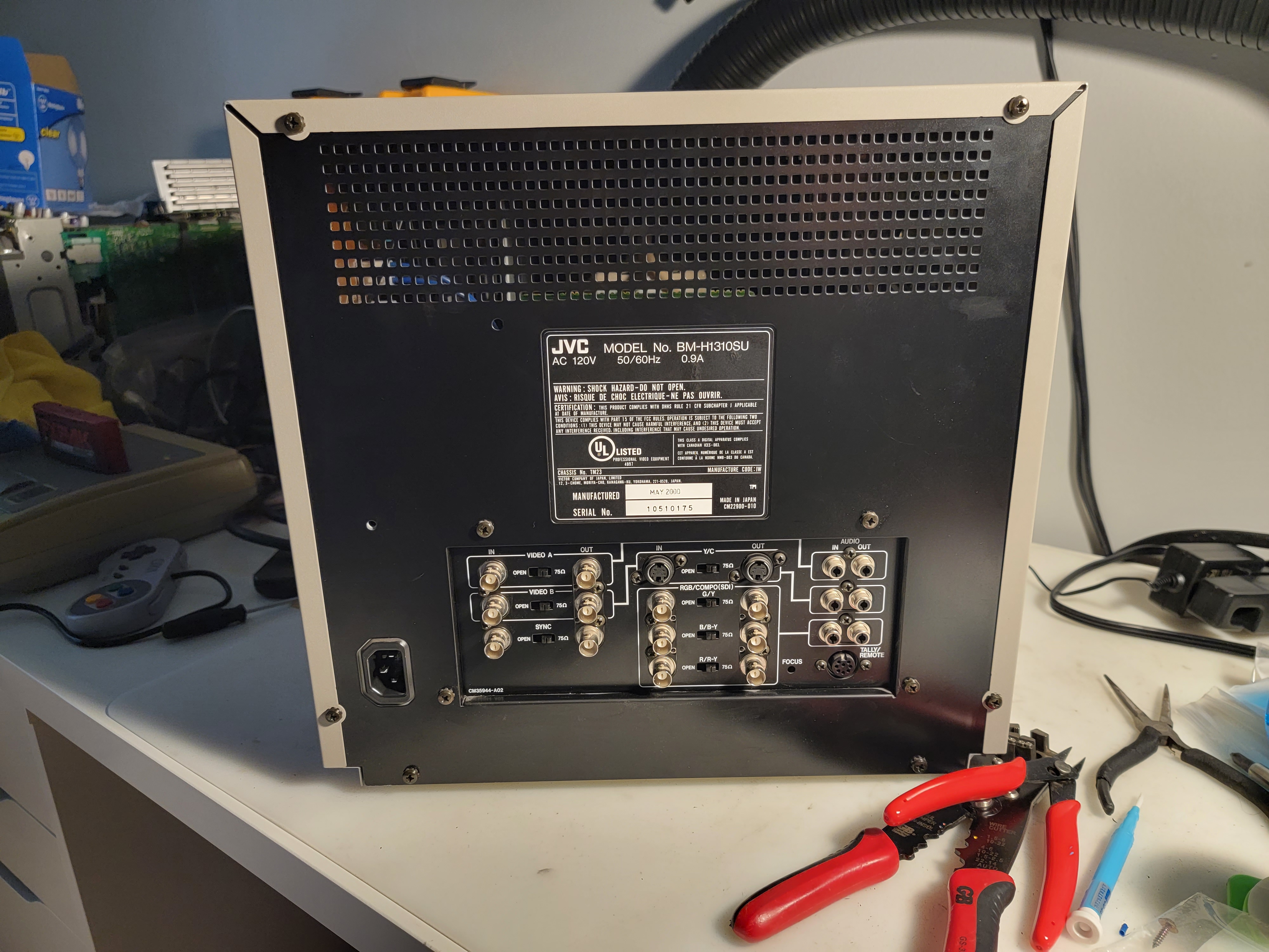 The Chunghwa tube inside is a stunning 750 TVL shadowmask (I have seen it referred to as 800 TVL elsewhere). It is a very, very good Chinese reproduction of the original Panasonic 750 TVL tube in the BM-H1300SU.