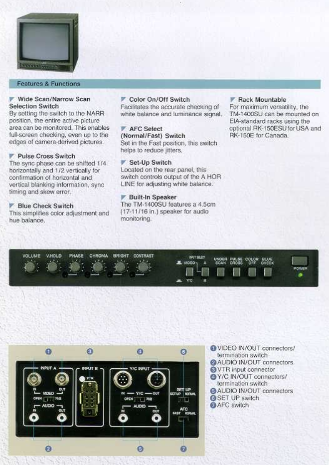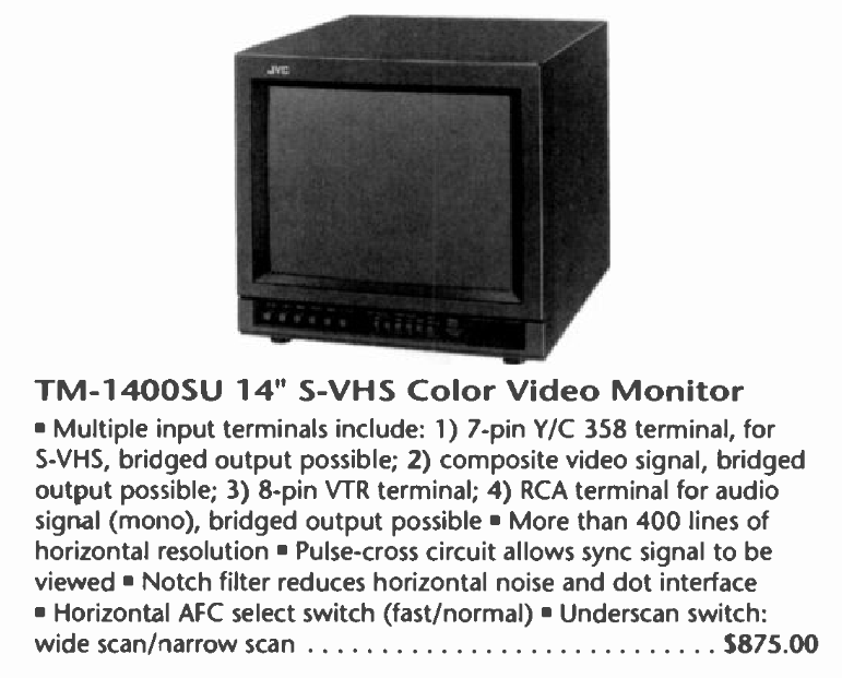 "The new TM-1400SU color video monitor -- with its 14-inch FS (flat square) fine pitch data-grade CRT -- meets all the performance requirements of today's demanding professionals. Thanks to the stable and accurate color rendition realiosed by new ICs that process the chroma signal and other functions, the TM-1400SU offers superior performance. And with S-VHS capability, it is a ideal for a wide range of applications in this new age of high-resolution video."