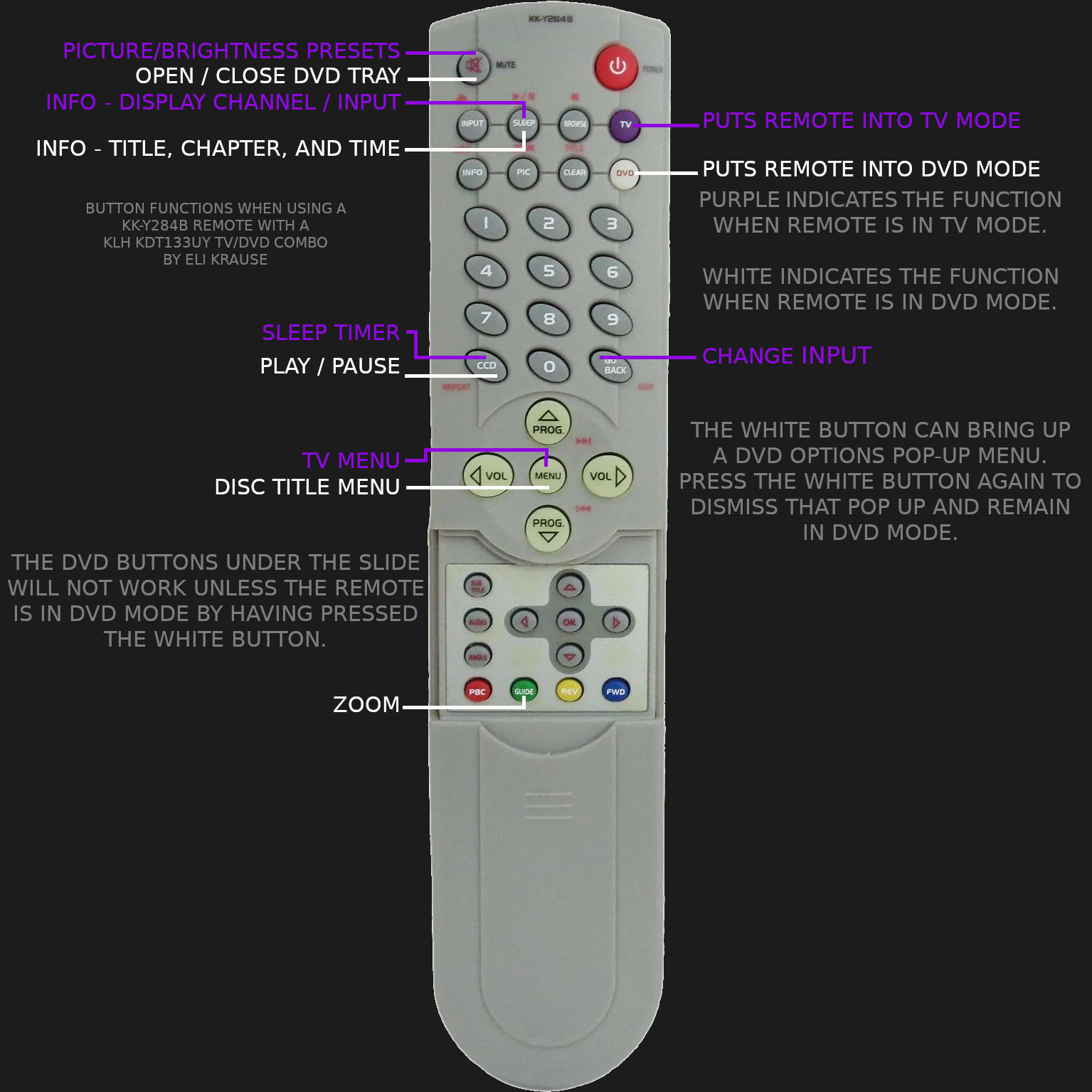 There is a similar looking remote KK-Y284B that is mostly compatible, though a number of button labels and functions are mismatched (and there is no functional equivalent to the Stop or Mute on that remote). But at the time of writing it is more readily available than the original KLH remote, so a diagram is in the gallery below showing what the differing button functions are.