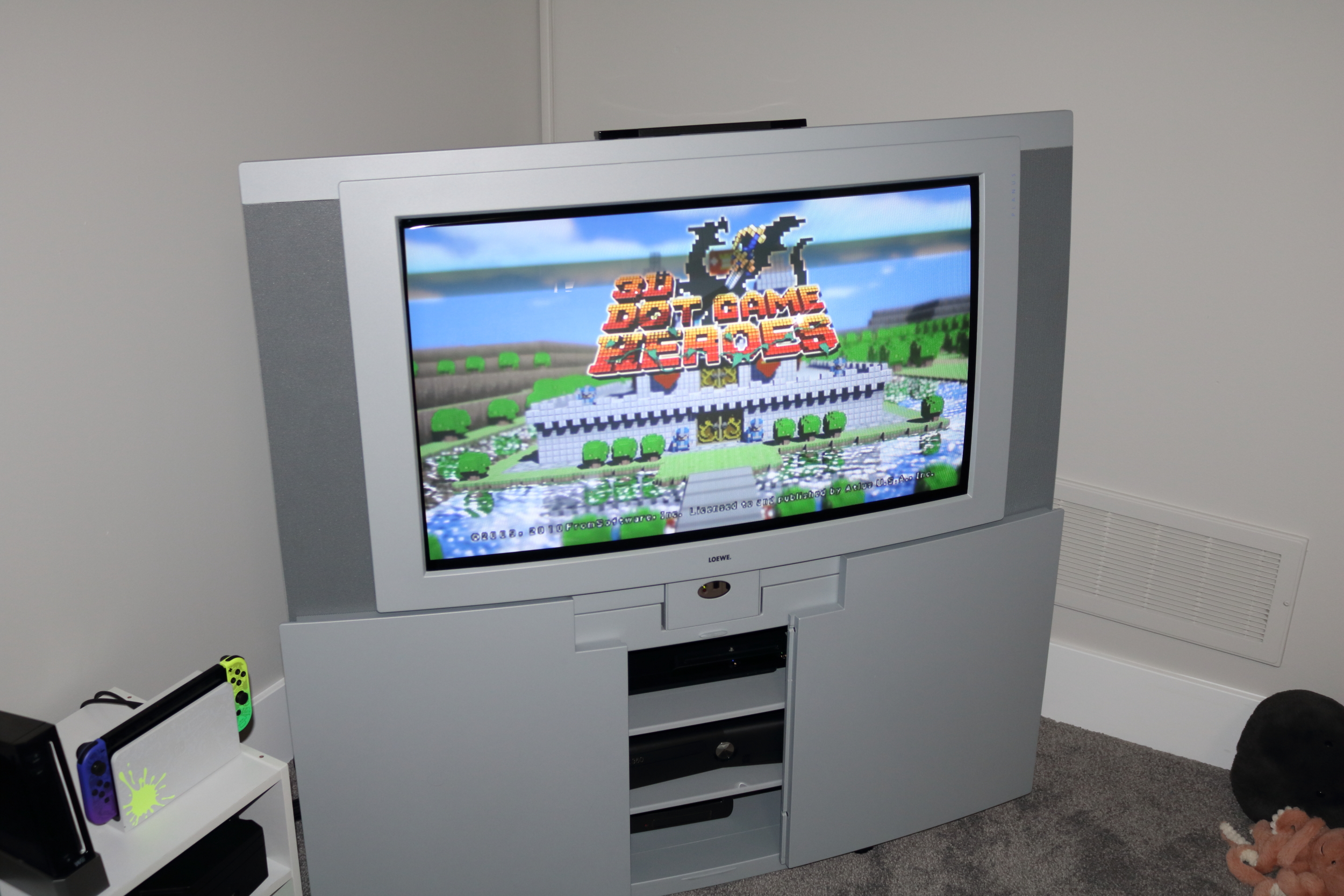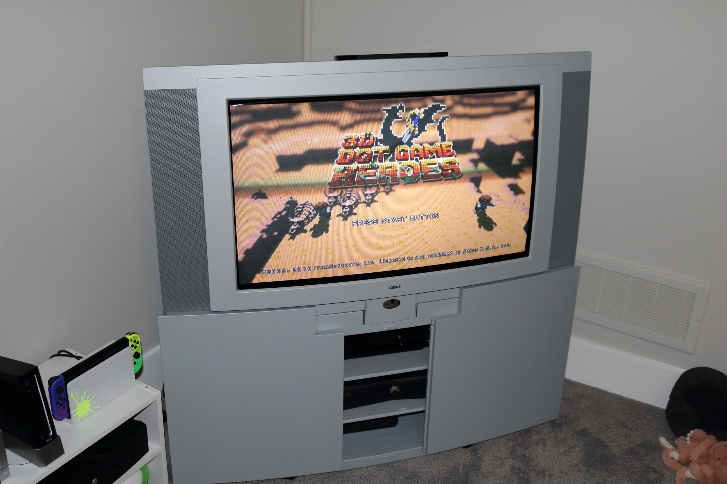 High-end 30" curved-screen HD CRT by Loewe, made in Germany and launched in North America in 2001. Has RF, composite, s-video, component, and VGA input. It can natively scan 480p/960i, 540p/1080i, and upconverts NTSC and PAL signals.